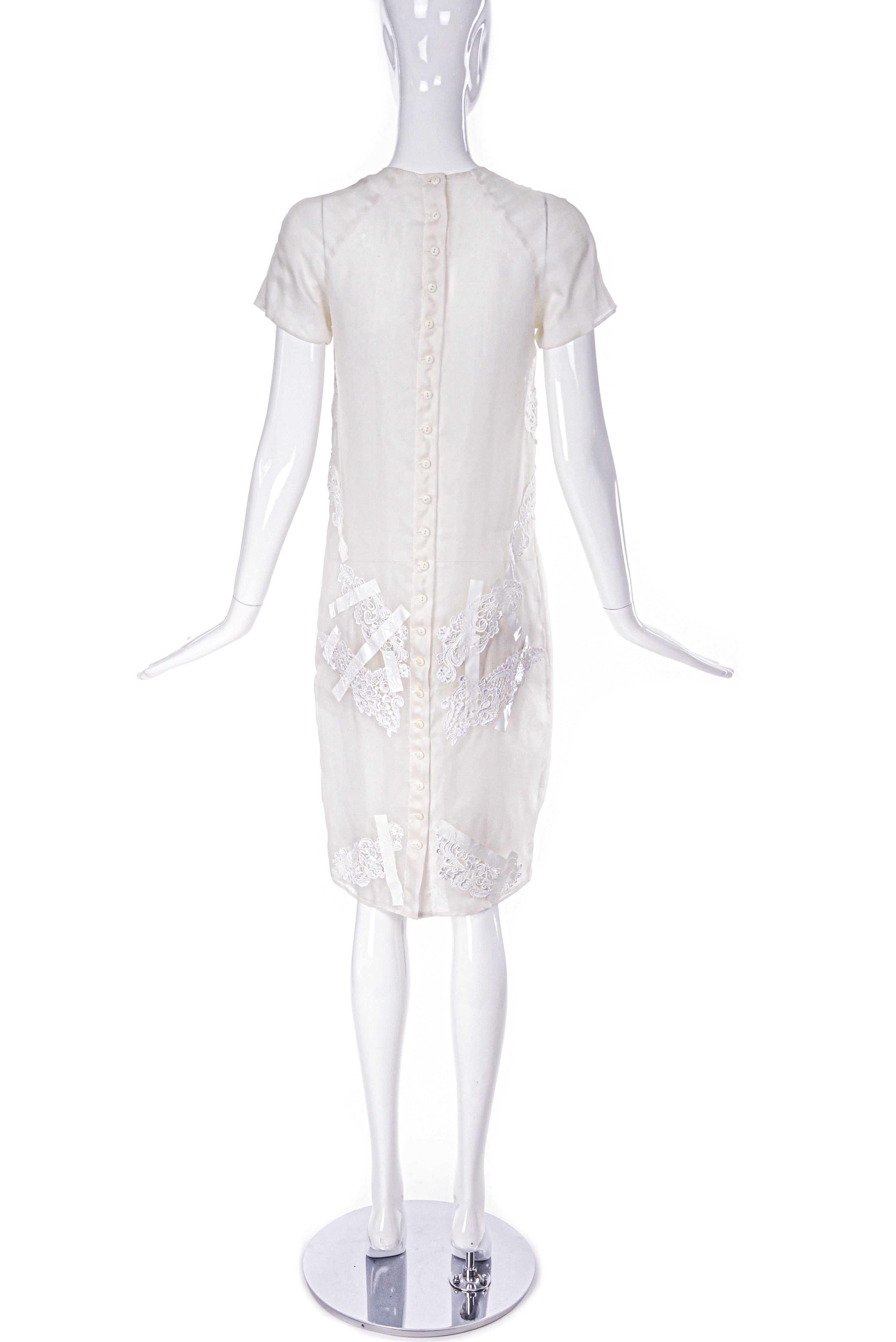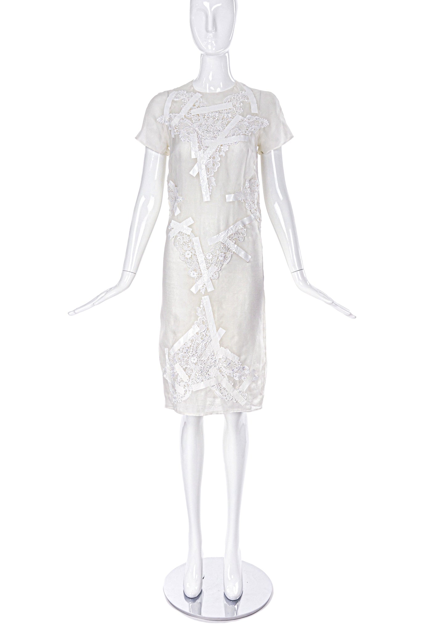A Christopher Kane white organza dress with a slight opacity to the fabric. The dress has beautiful lace appliqué details mixed in with latex "tape" strips to give the dress a cool juxtaposition. This short sleeve organza dress is from the Christopher Kane Spring / Summer 2013 Collection.