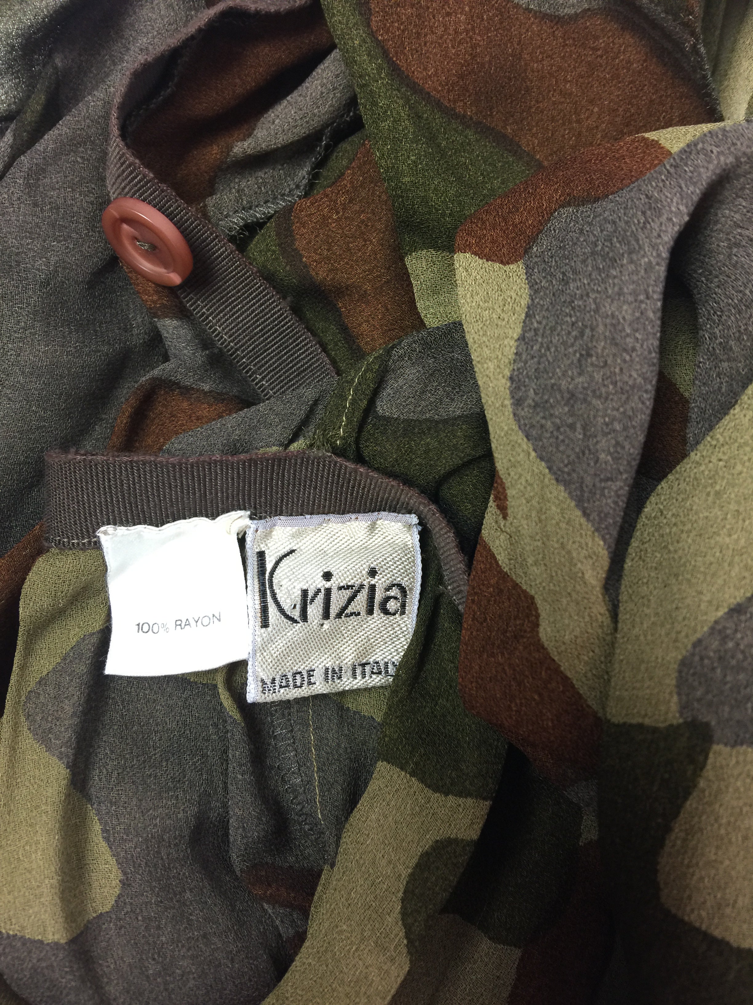 A vintage Krizia camouflage  print halter neckline wrap dress in a sheer rayon that provides a classic draped shape.