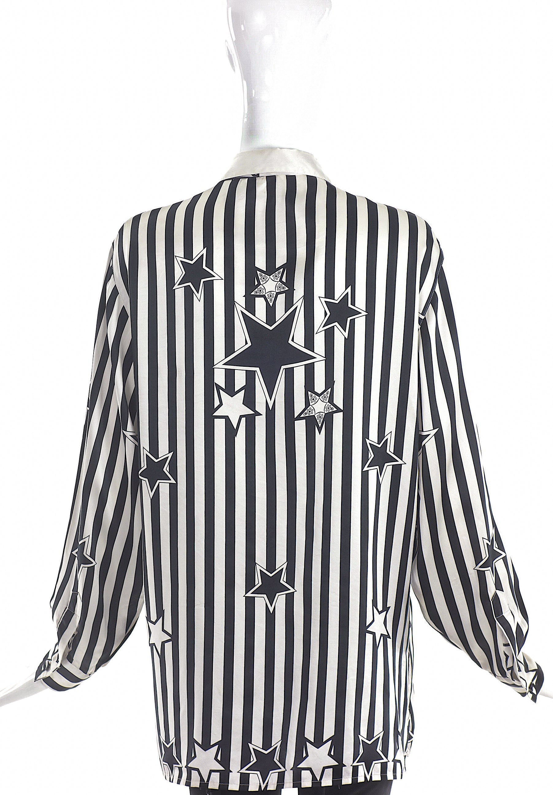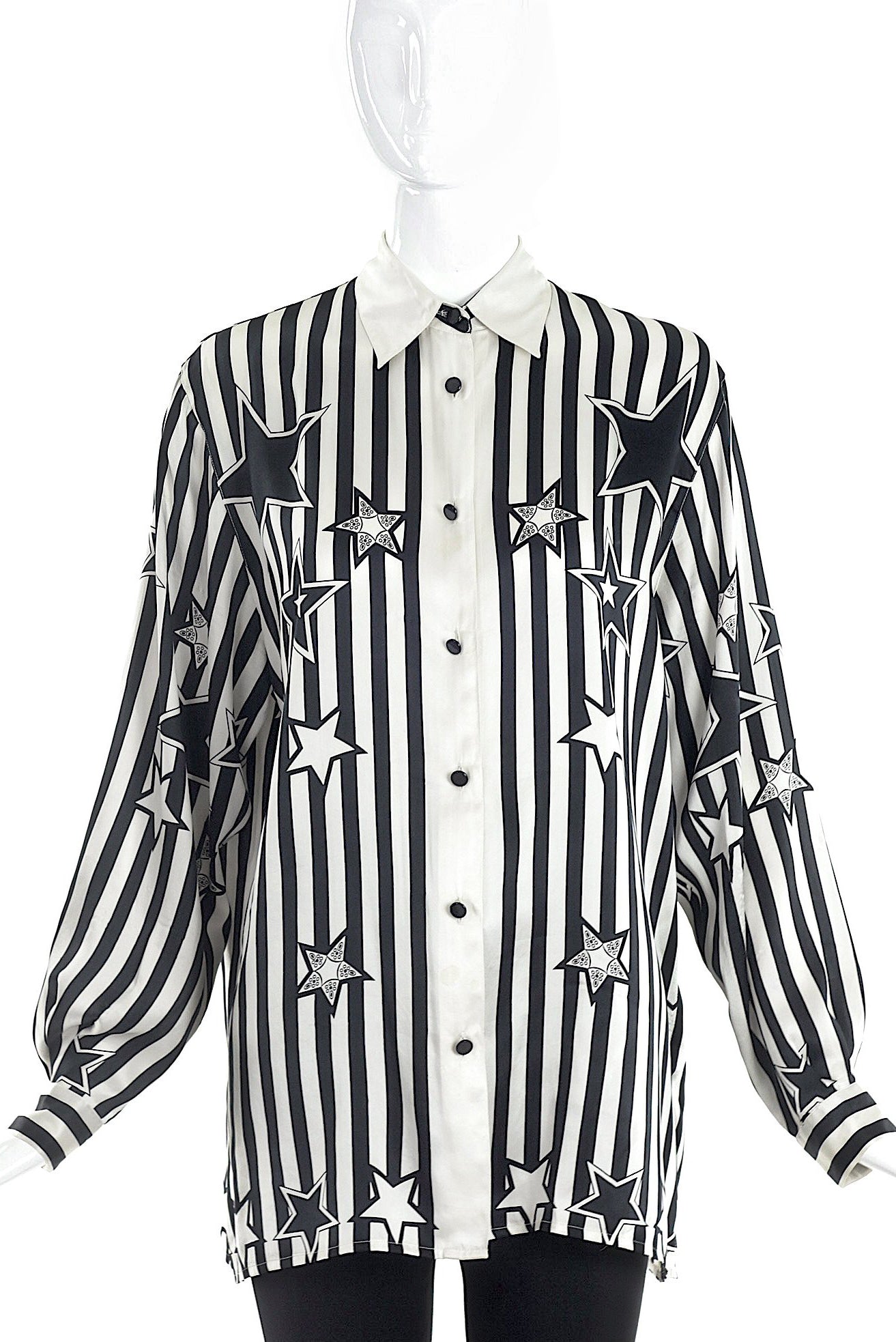 Vintage Black and White Star Print Silk Button-Up Shirt