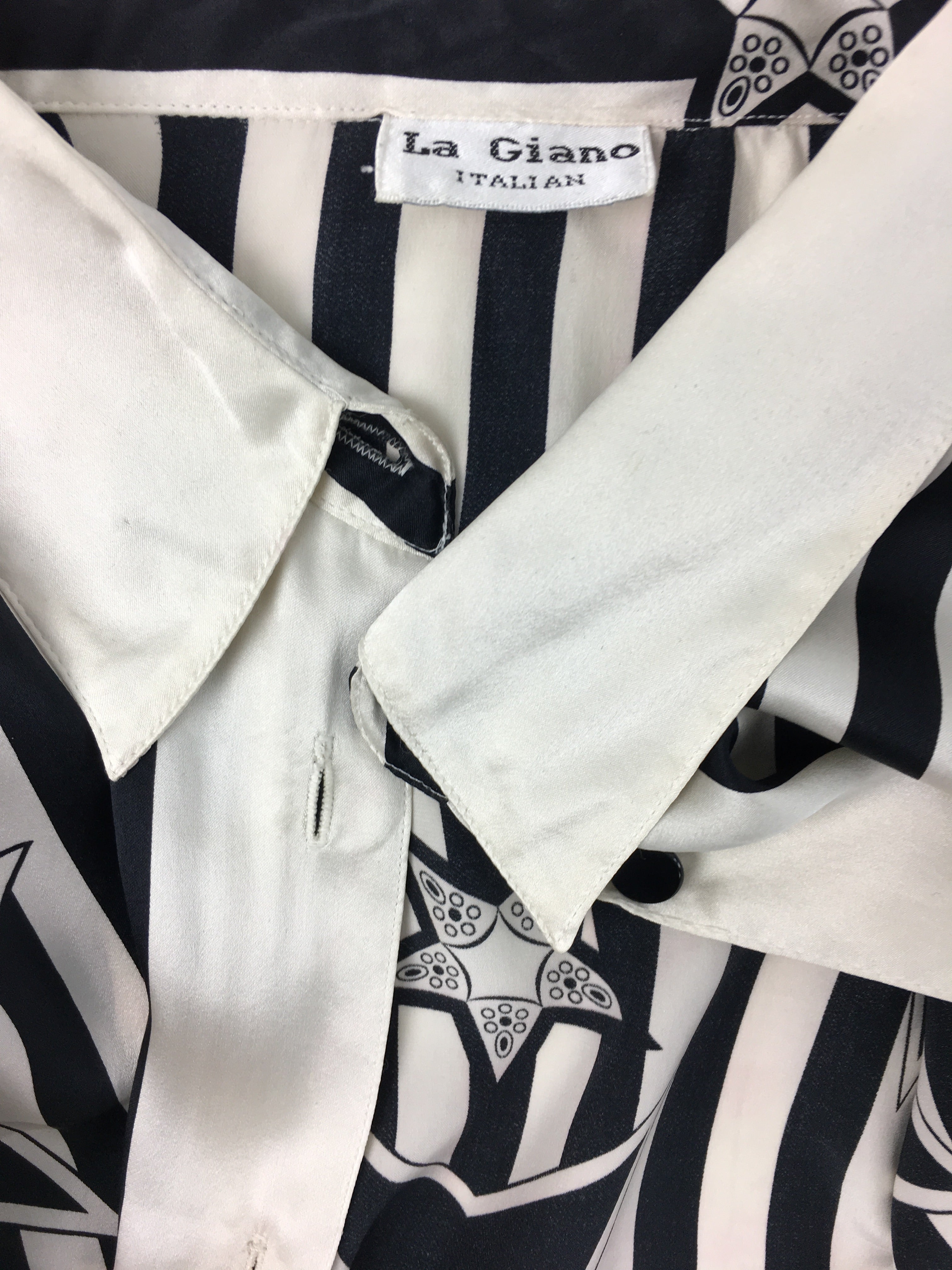 A Vintage Italian made black and white star print silk button-up shirt menswear shirt. The button up shirt has beautiful black porcelain buttons going up the front of the shirt. The silk has a graphic black and white vertical stripe print with stars shapes imposed over the stripes.