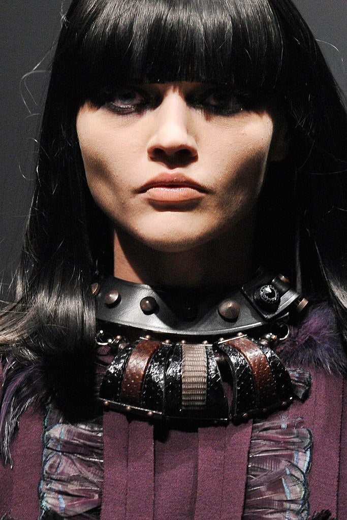 A Lanvin statement necklace that is created from three black and brown toned snakeskin half moon shaped pendents. The pendents are suspended from a black leather cord that have silver toned hardware with a lobster claw closure. From the Lanvin by Alber Elbaz Fall / Winter 2010 collection Look 33.