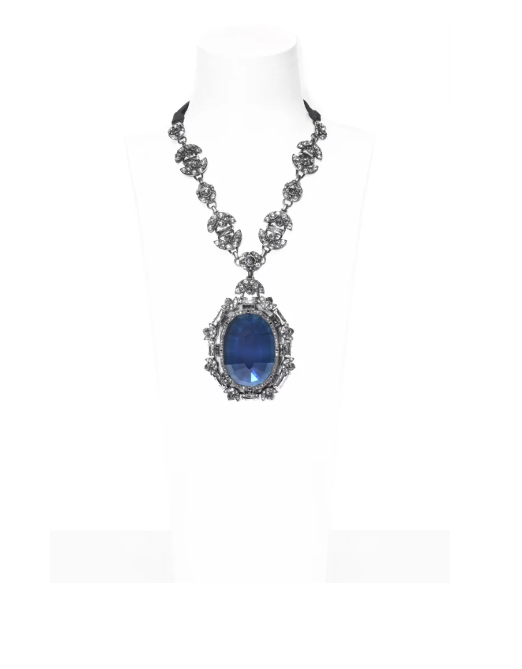 A Lanvin statement necklace with diamond crystals in an Art Deco pattern cascading from a black grosgrain ribbon to climax into a stunning massive blue costume jewelry sapphire pendent framed by the diamond crystals. An ode to American heiress Barbara Hutton and her famous jewelry collection. From the Lanvin by Alber Elbaz Fall / Winter 2012 runway presentation as seen on Look 37.
