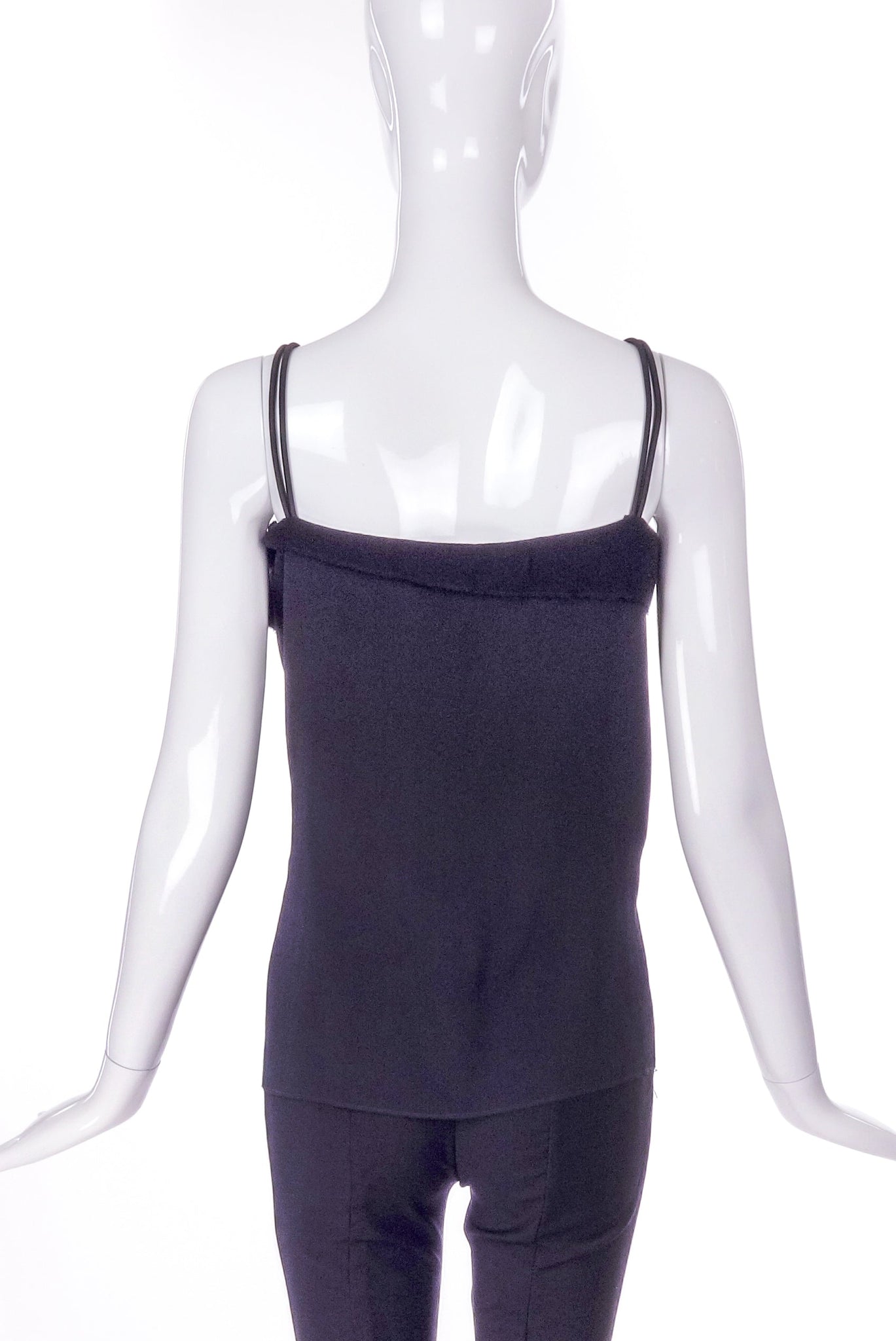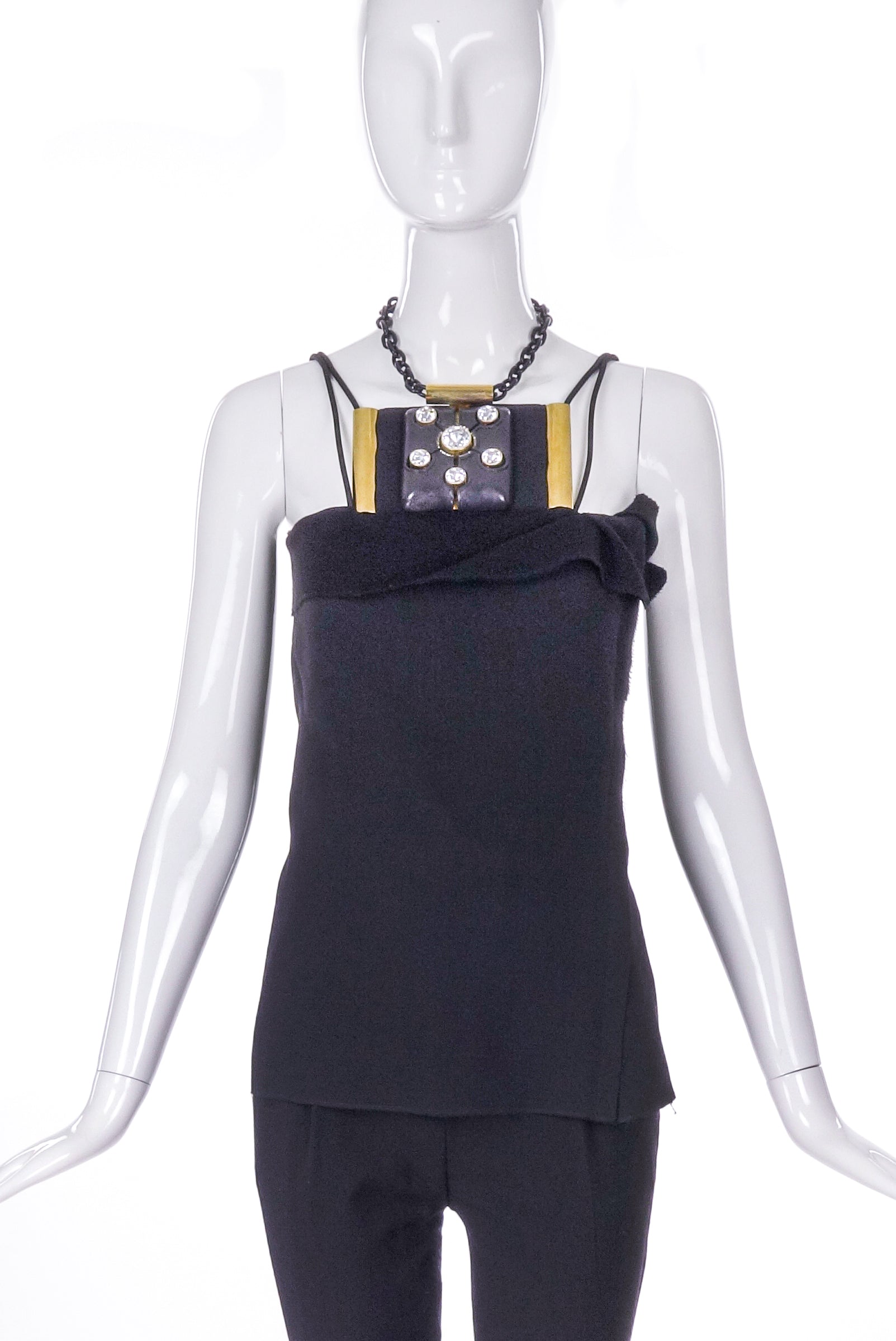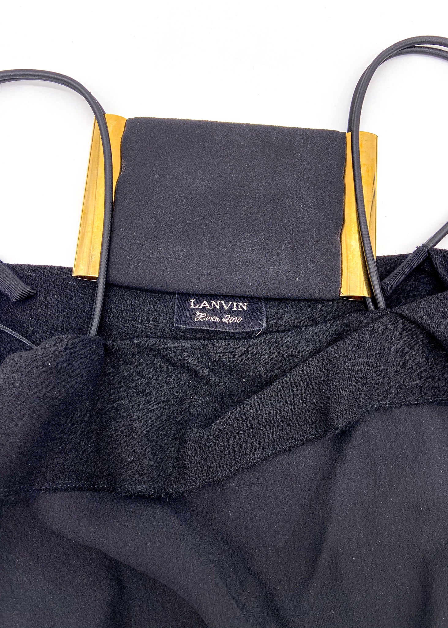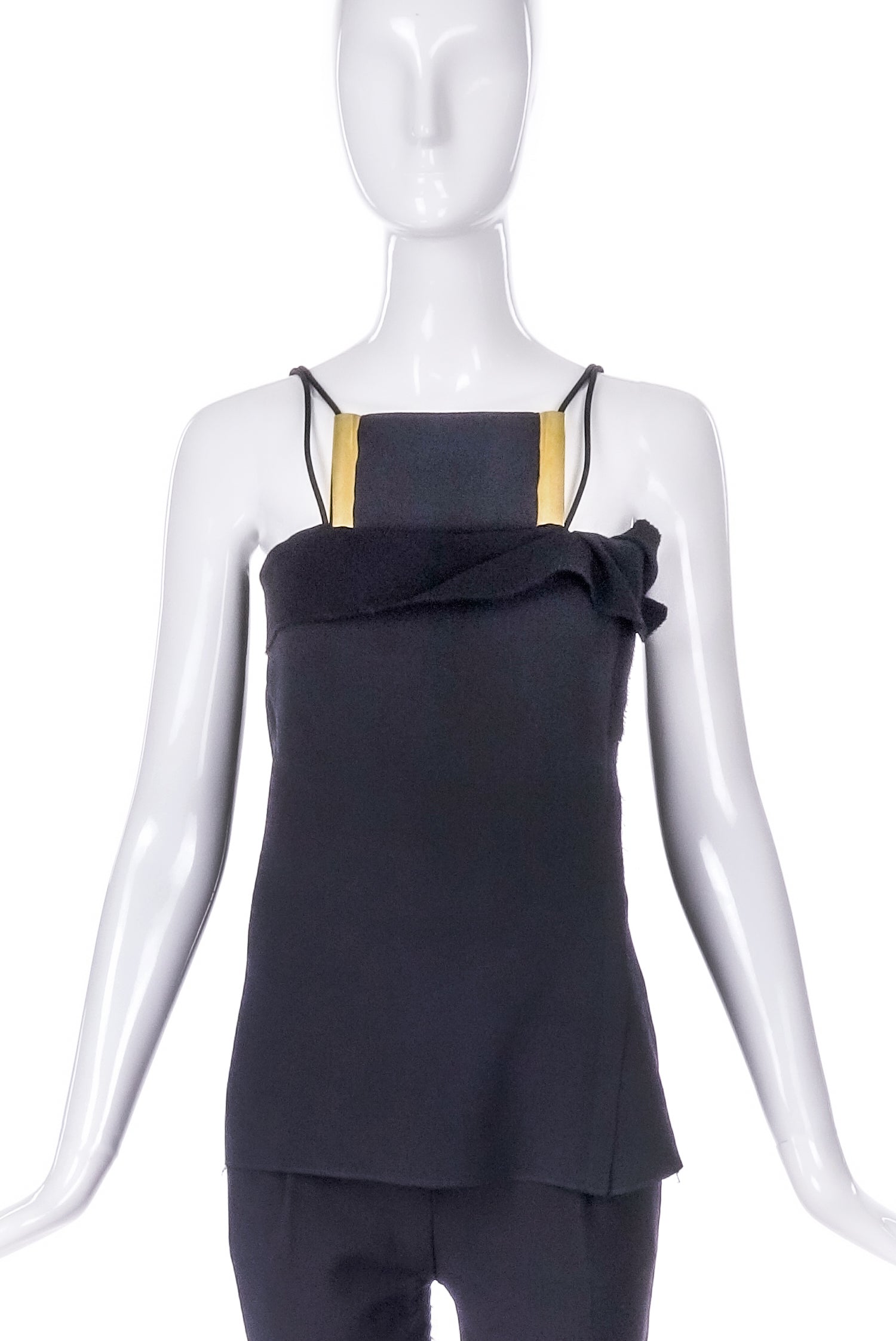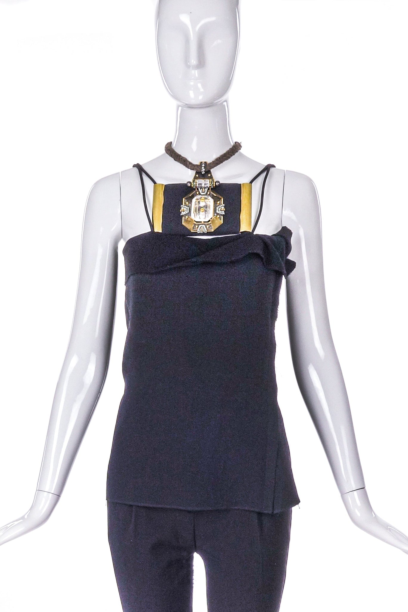 A Lanvin black top with a geometric rectangular halter style with brass detailing. The top has a delicate ruffle detail at the bust to contrast the strength of the geometric detail. From the Lanvin by Alber Elbaz Fall / Winter 2010 collection.