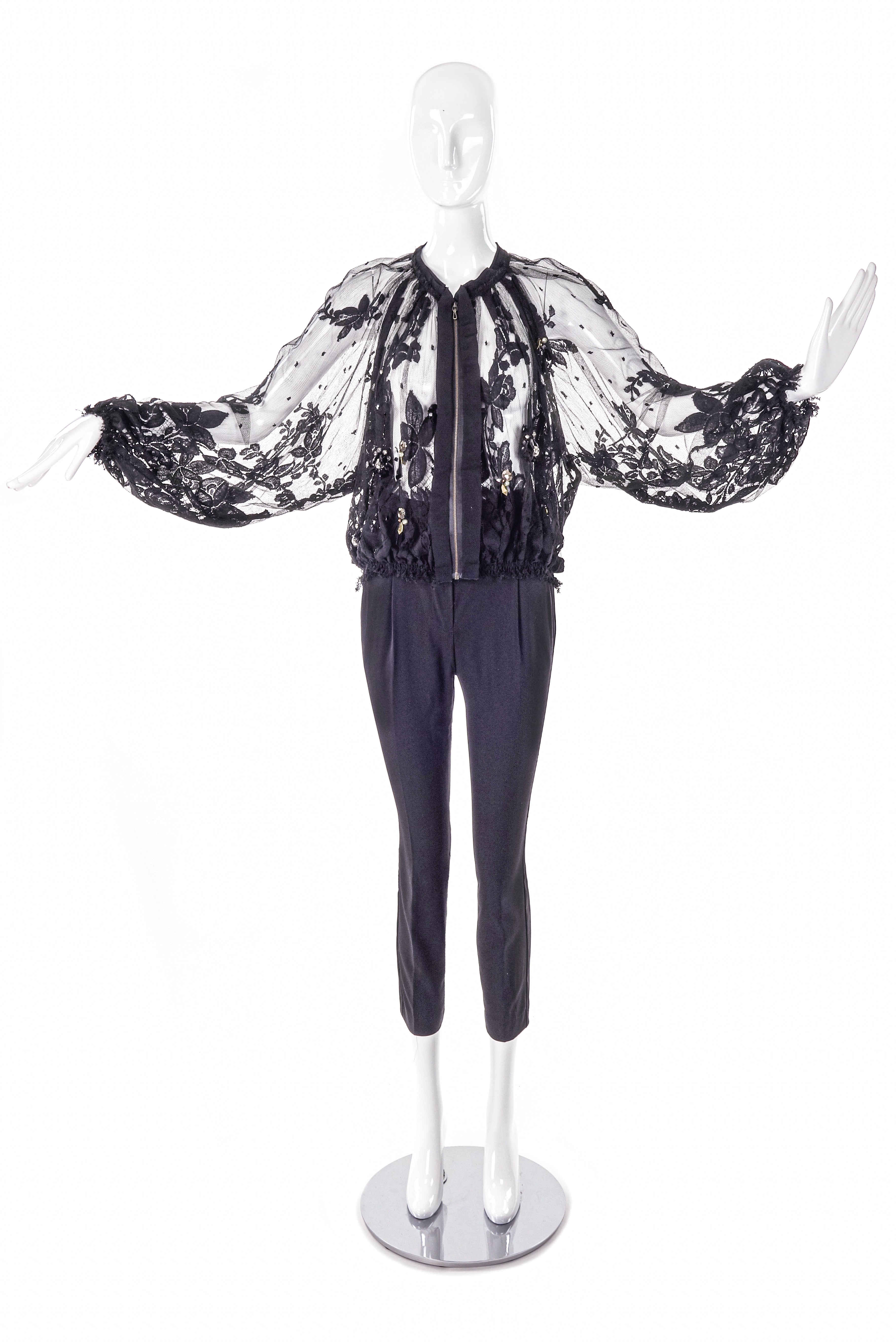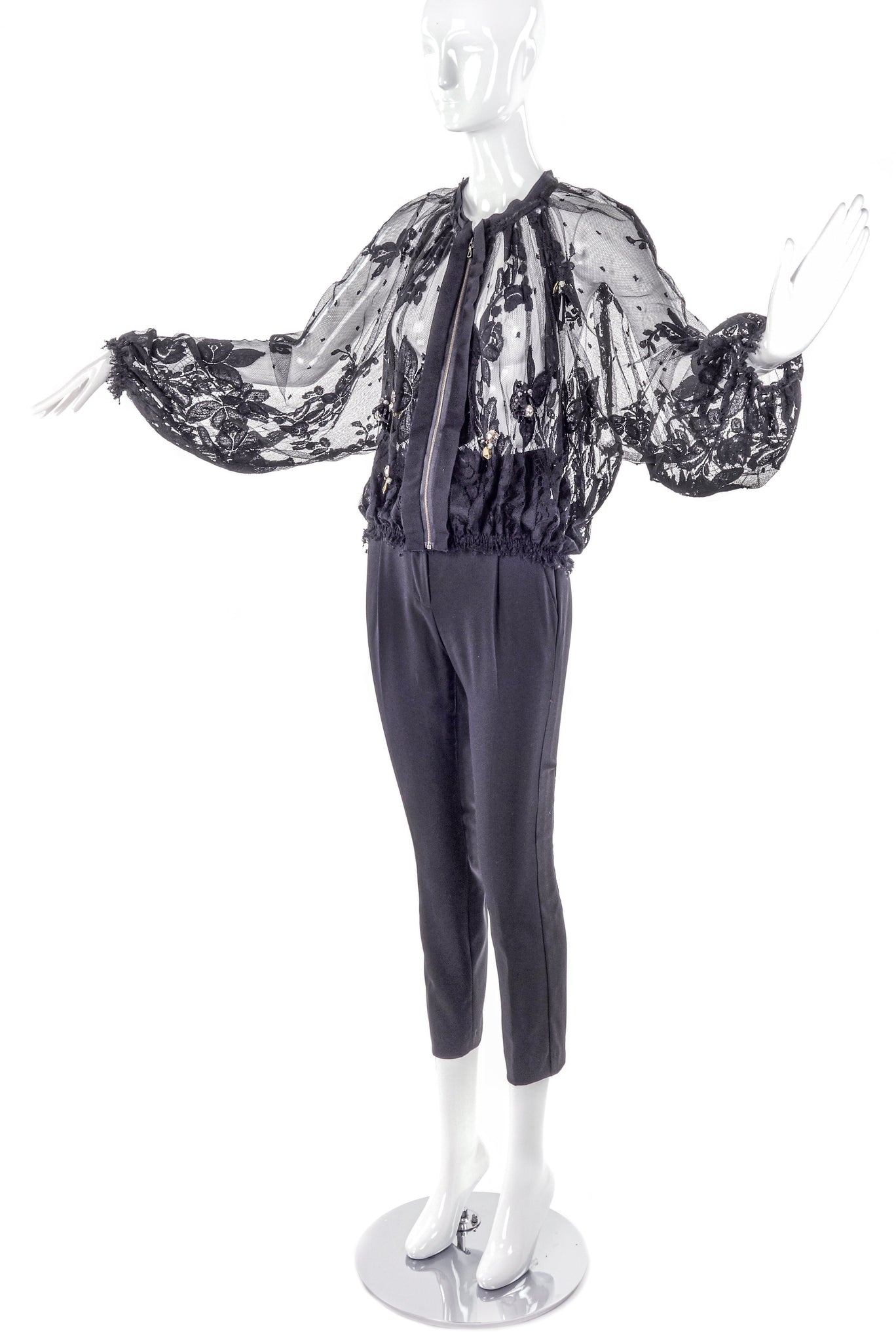 A Pre-Fall 2009 Lanvin by Alber Elbaz from Look 1 - Lace & swiss dot tulle bomber jacket with embroidery. Front zipper, satin piping, elastic waist and wrists.