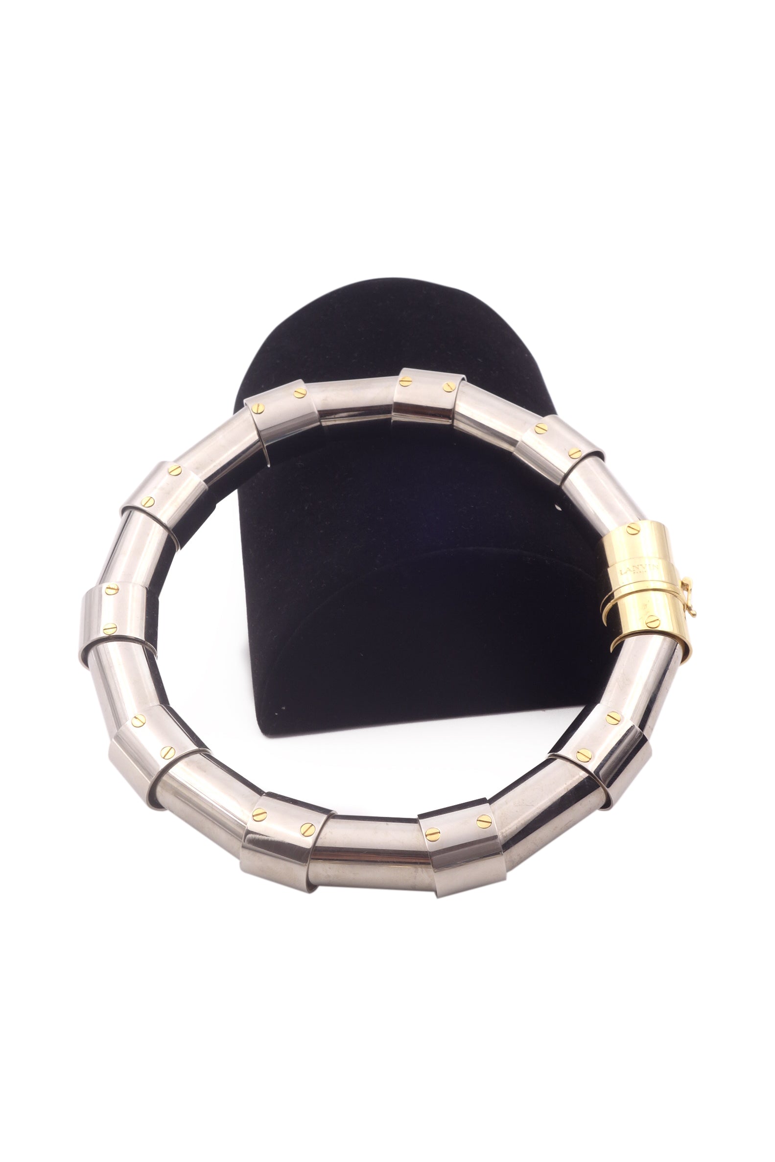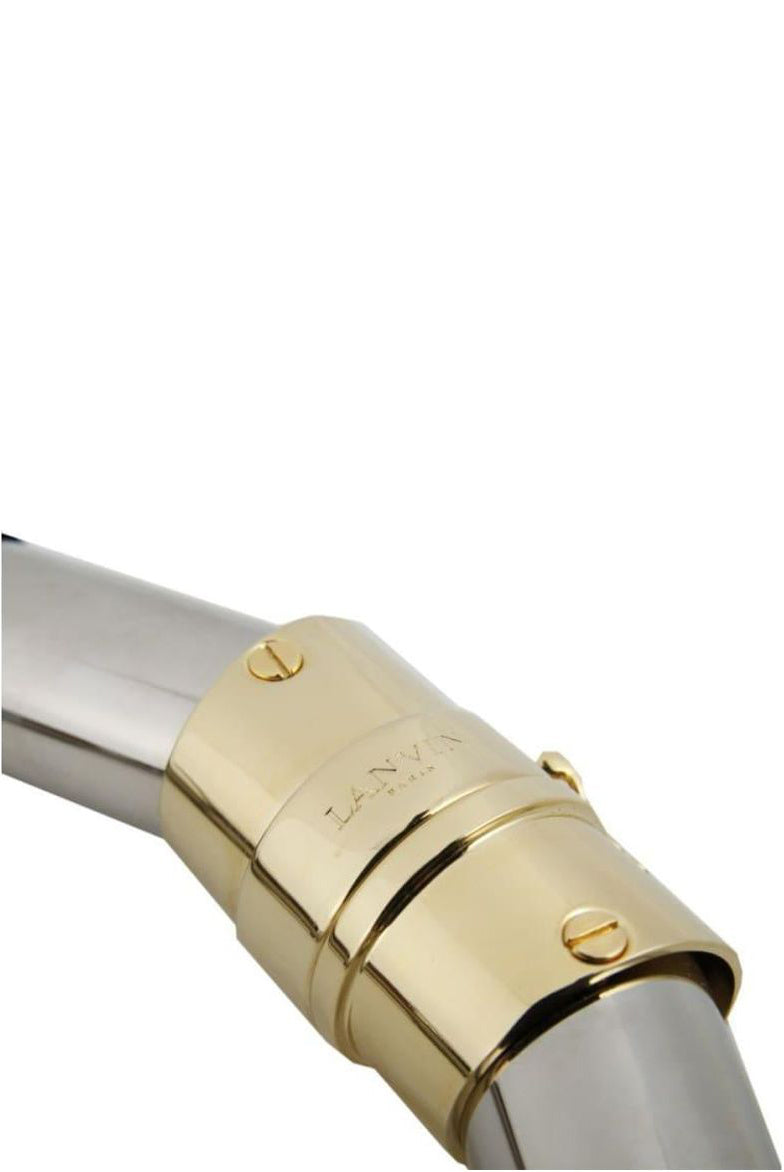 A Lanvin tubular necklace created from silver toned tubes that are riveted together with gold toned rivets. The uniquely cool necklace has a gold figure 8 safety clasp stamped Lanvin. From the Lanvin by Alber Elbaz Fall / Winter 2014 runway collection Look 31.