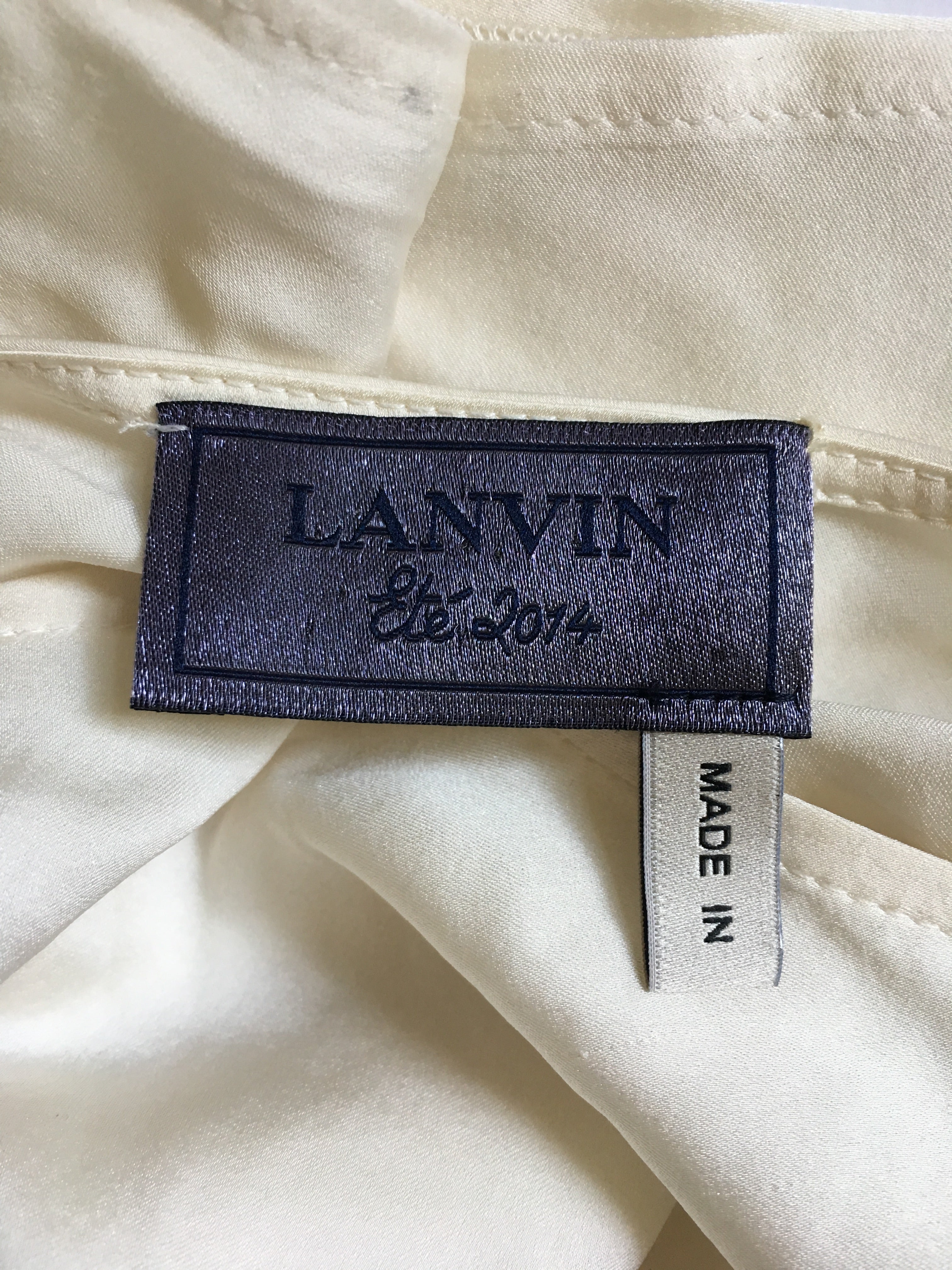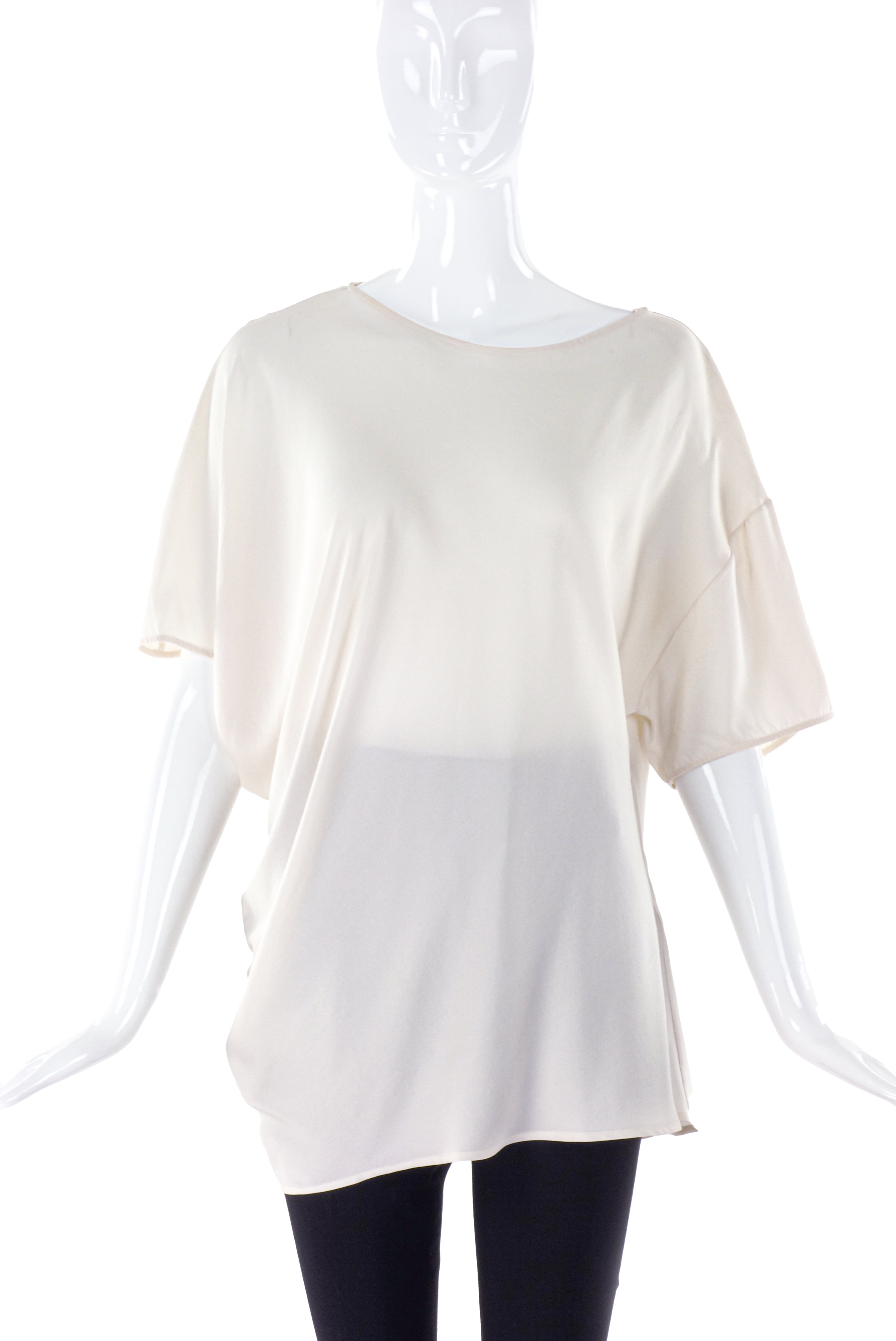 A Lanvin white silk asymmetrically crafted t-shirt. The silk top has an open boat neck style collar with an exaggerated short t-shirt style sleeve. The blouses gathered elegantly on the right side of the shirt to create a subtle asymmetrical drape. Circa 2014.