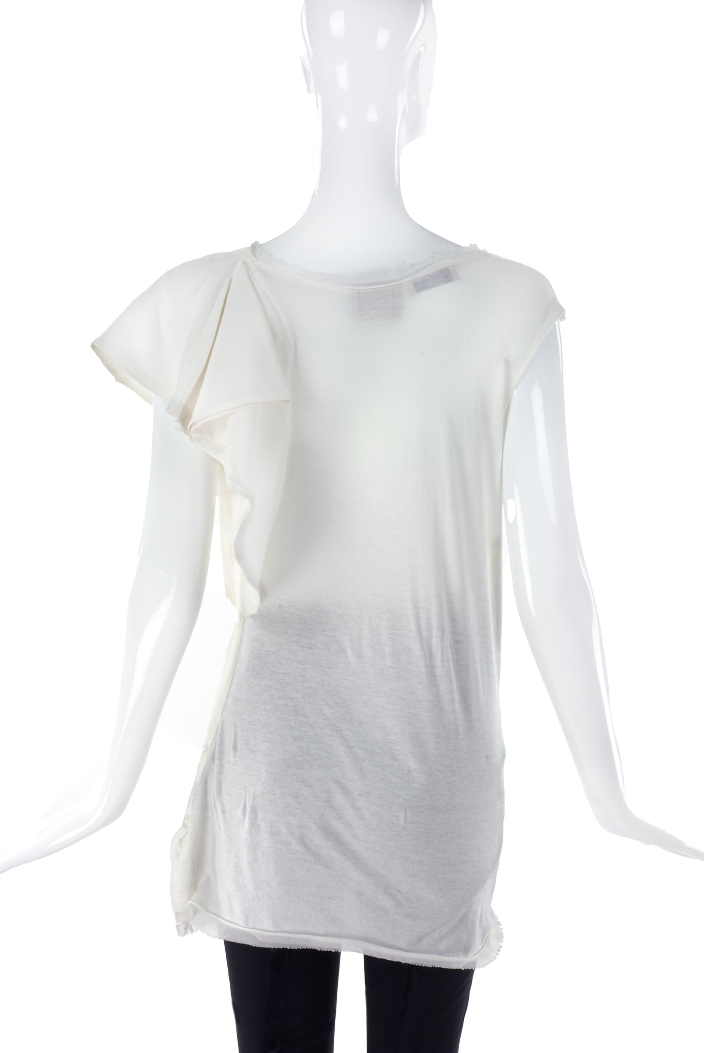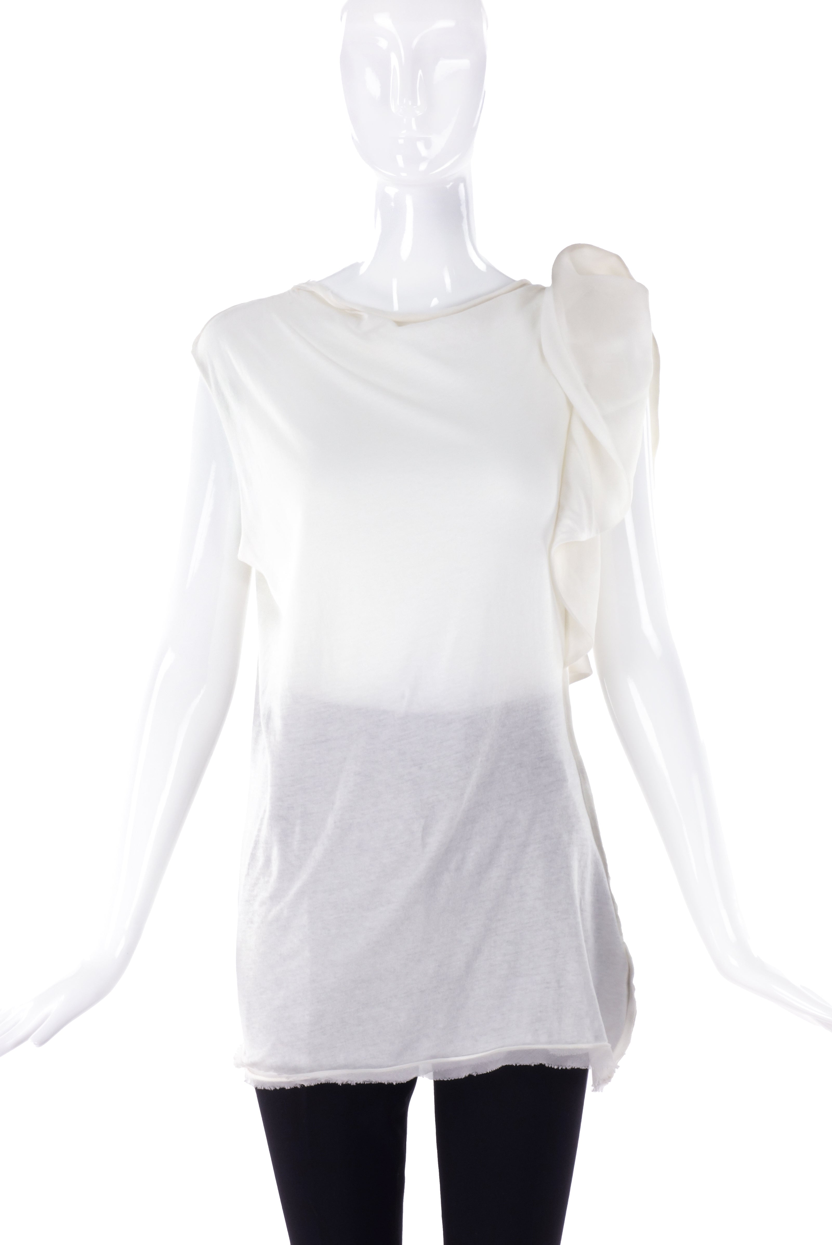 A Lanvin white cotton sleeveless t-shirt with an exaggerated and structured ruffle detail at the left shoulder. The t-shirt has raw edged seams along the sides of the shirt and at the hem of the top.