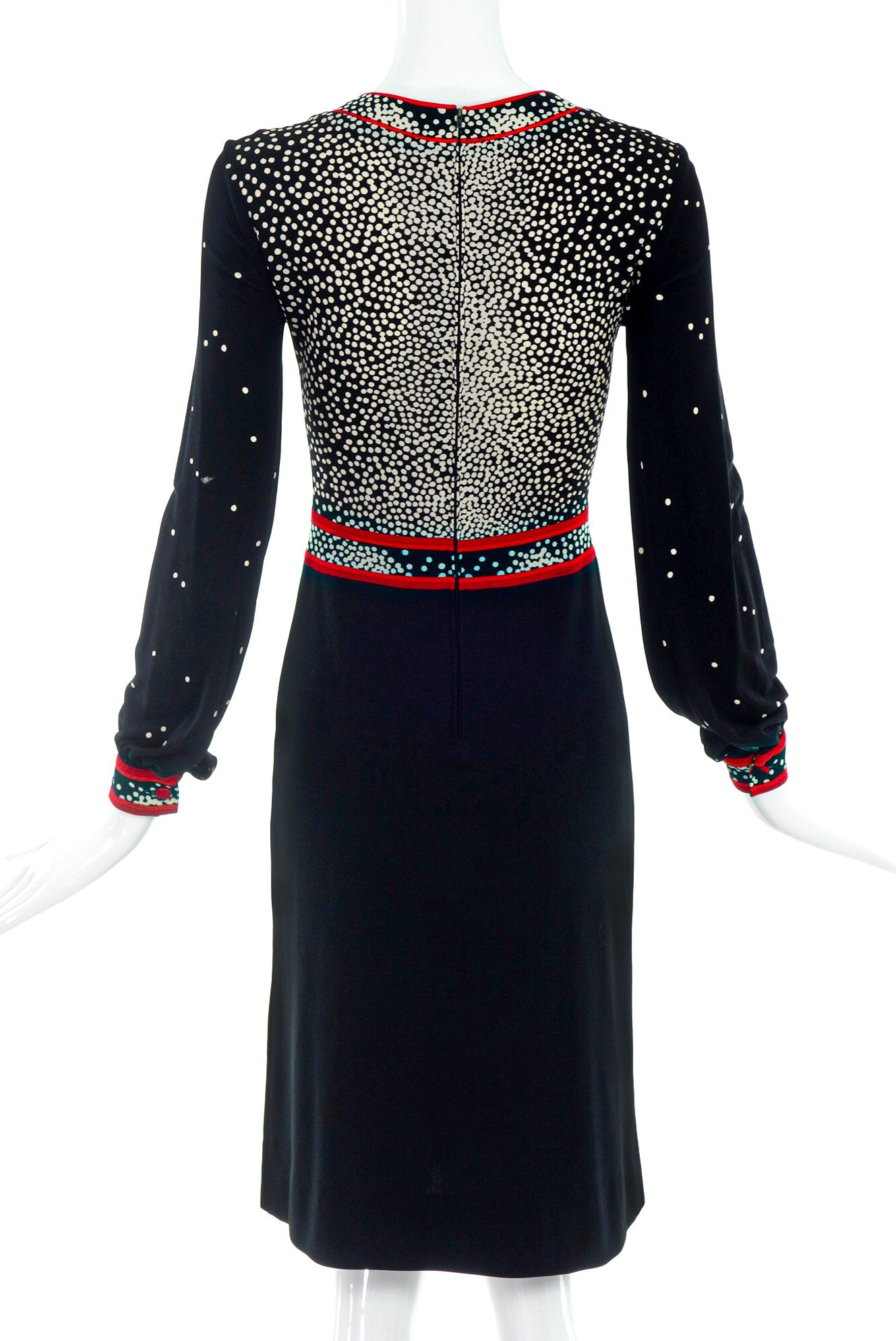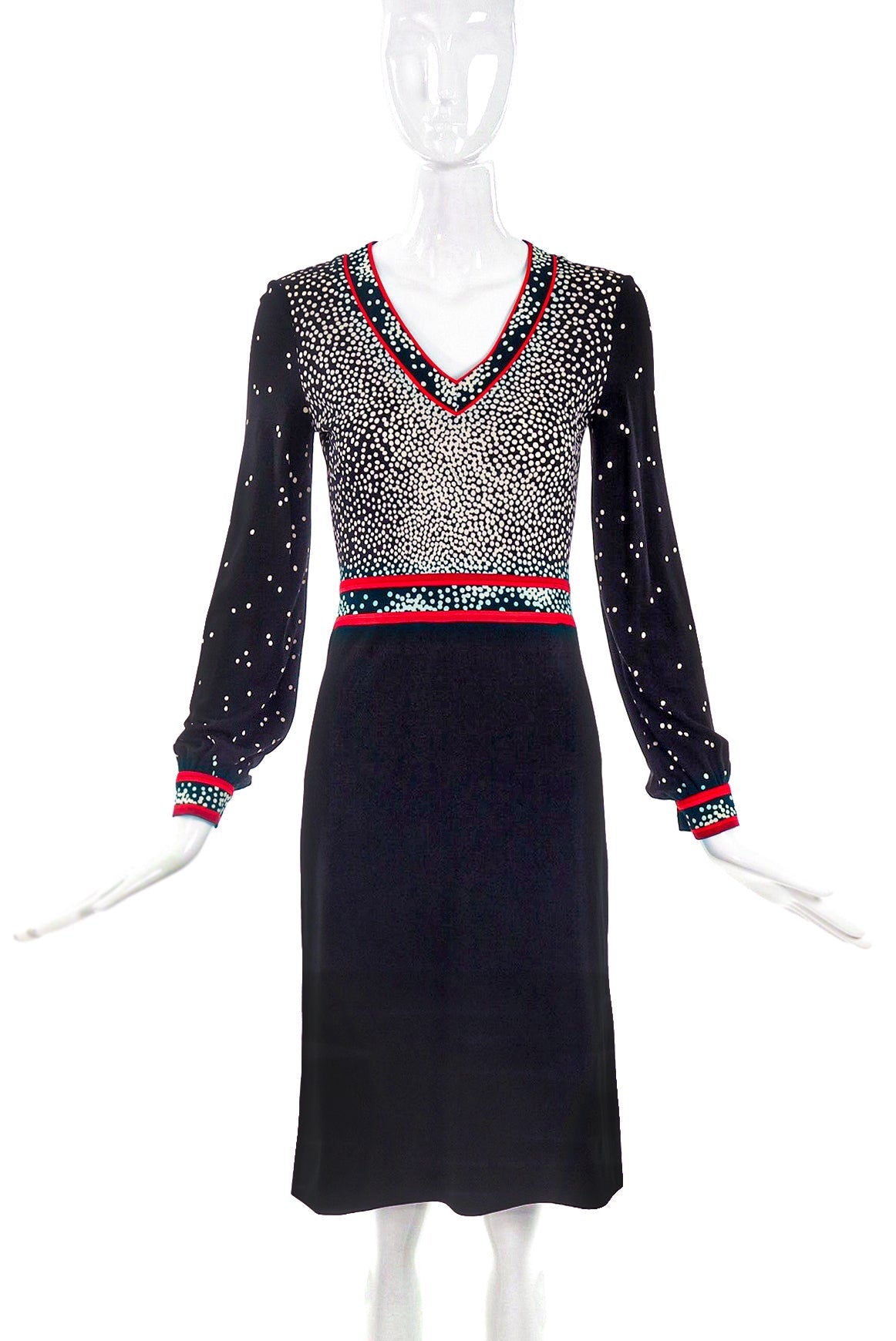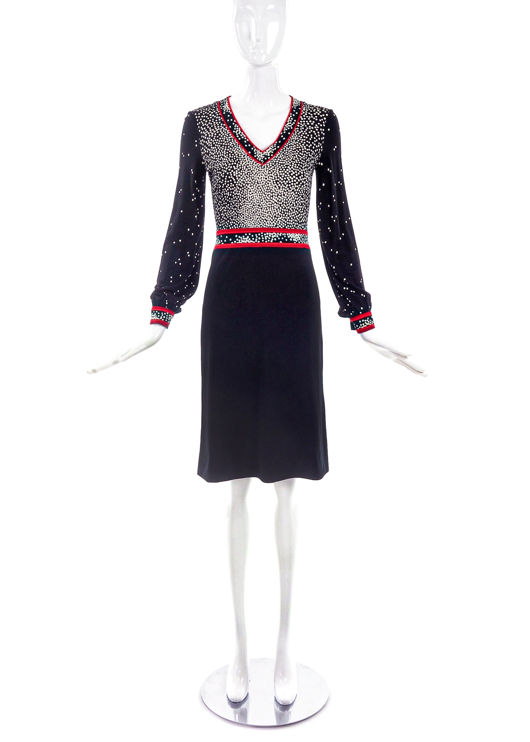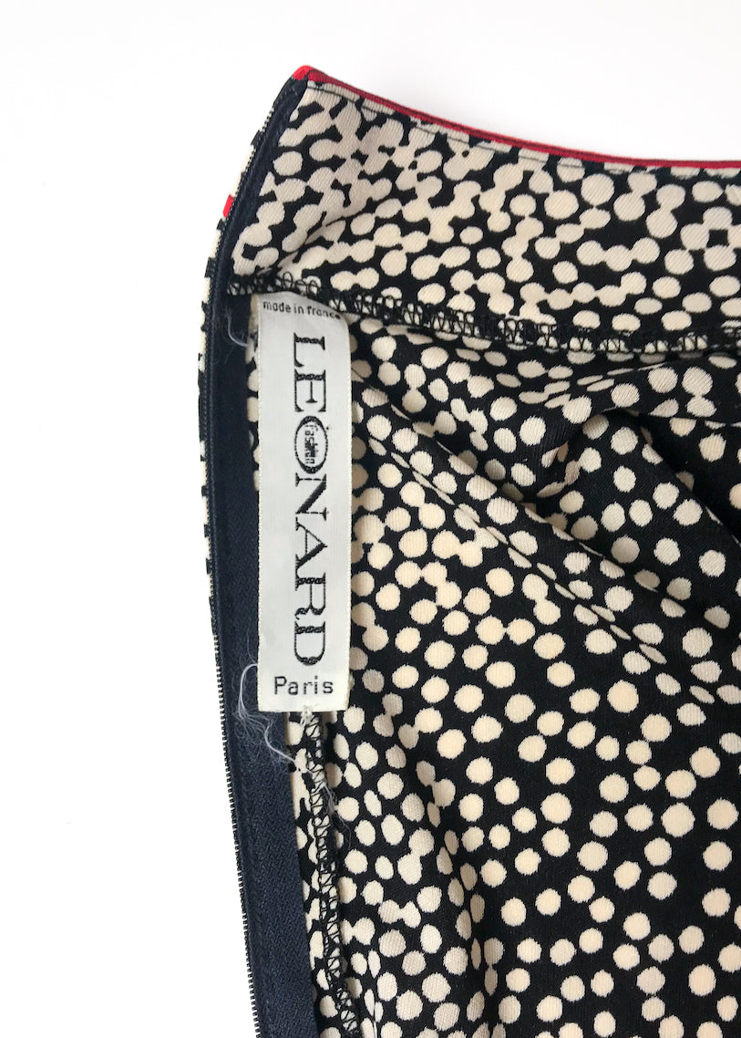 A vintage Leonard black silk jersey long sleeved dress, The dress has a clustered white polka dot print with vibrant red piping detailing along the waist, sleeve cuffs and at the v-neckline. Cuffs of the sleeve have a single red fabric covered button for closure. Invisible zipper down the back of the dress. Circa 1970s.