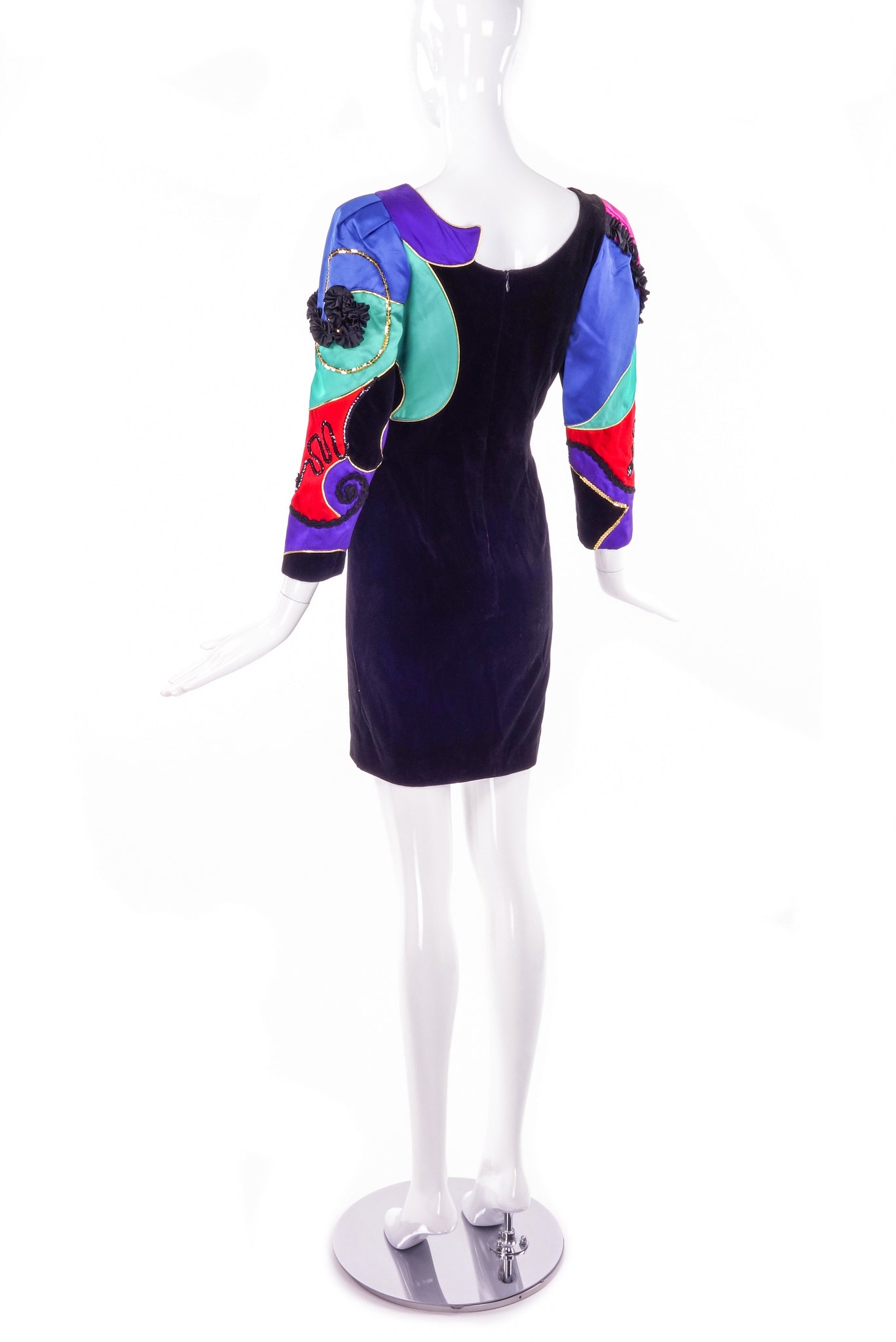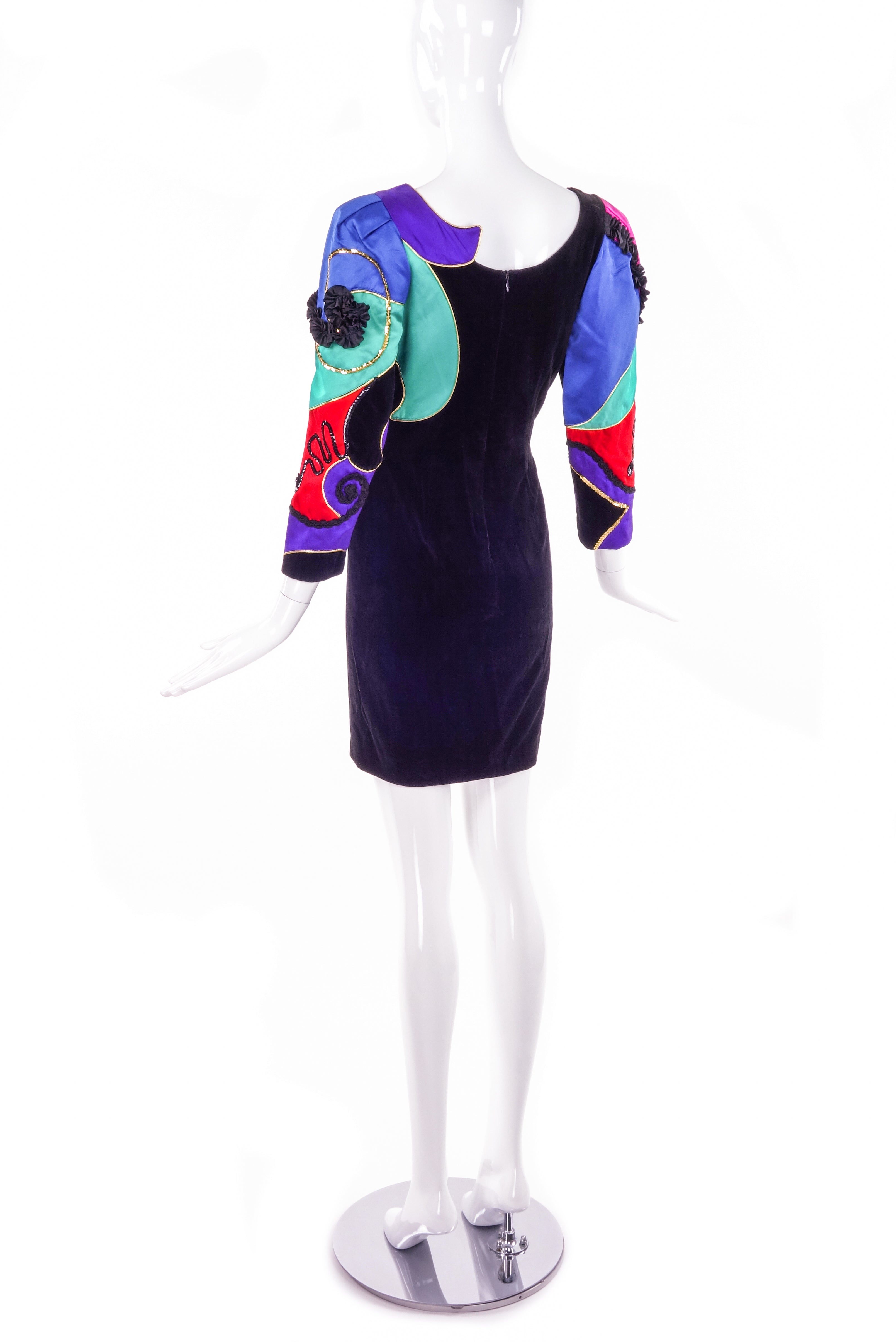 A cocktail dress by Louis Féraud with bright satin patchwork with the bottom half of the dress being black velvet. There is satin and braid black trimming with sequin and black beading star details. Circa 1980s.