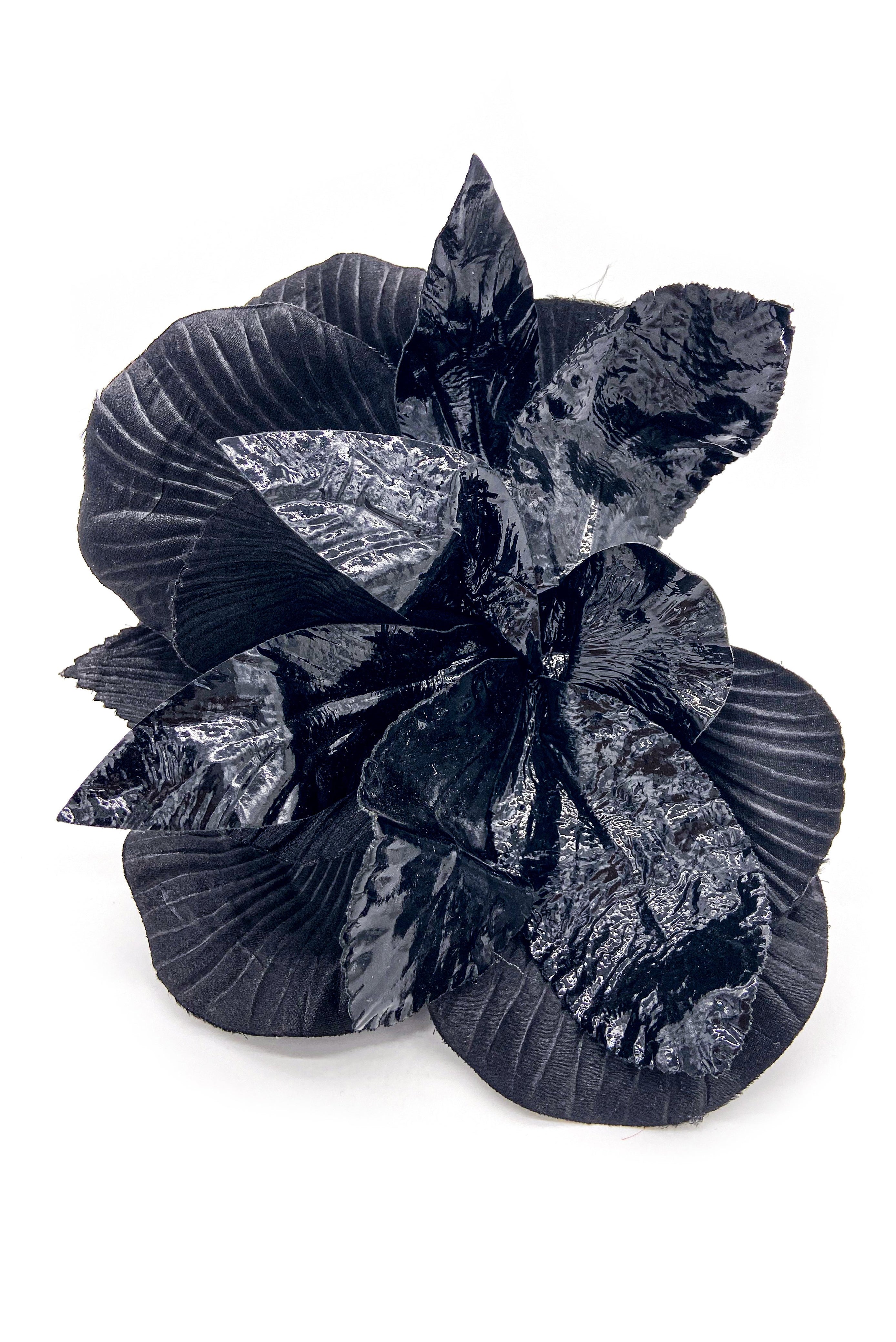 From luxury silk flower couturier M&S Smallberg; based in New York City. A dramatic black fabric flower hand-crafted with petals that have a shine to them against a backdrop of matte petals. Could be utilized as a corsage, brooch or hair accessory.