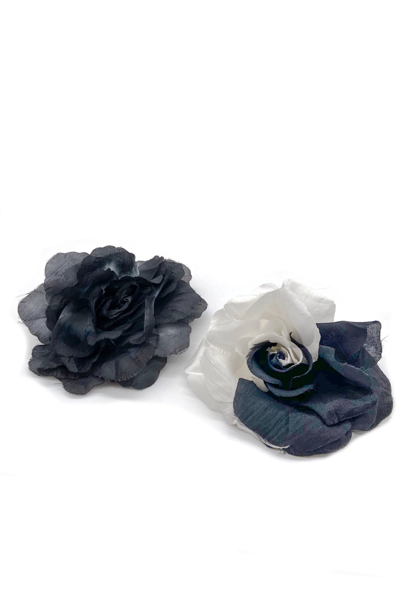 A pair of M&S Smallberg silk petal roses. The featured rose is a black and white contrasting, "Cruella de Vil" like rose with silk petals. The second rose has it's silk petals tie-dyed in black giving the flower and ombré effect. Are available for rental as a set or individual. Please inquire if interested.