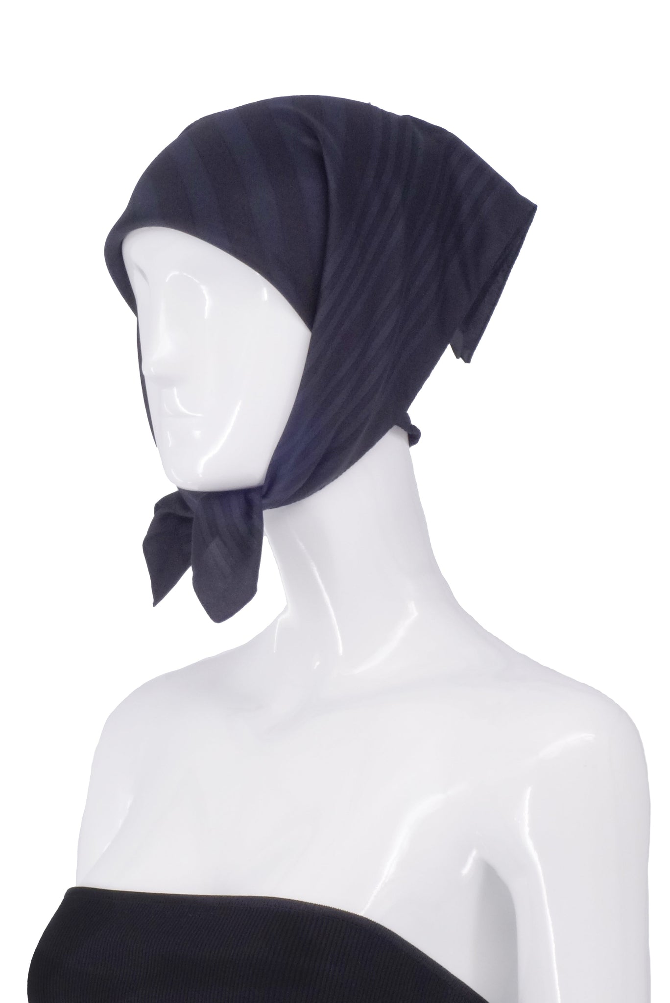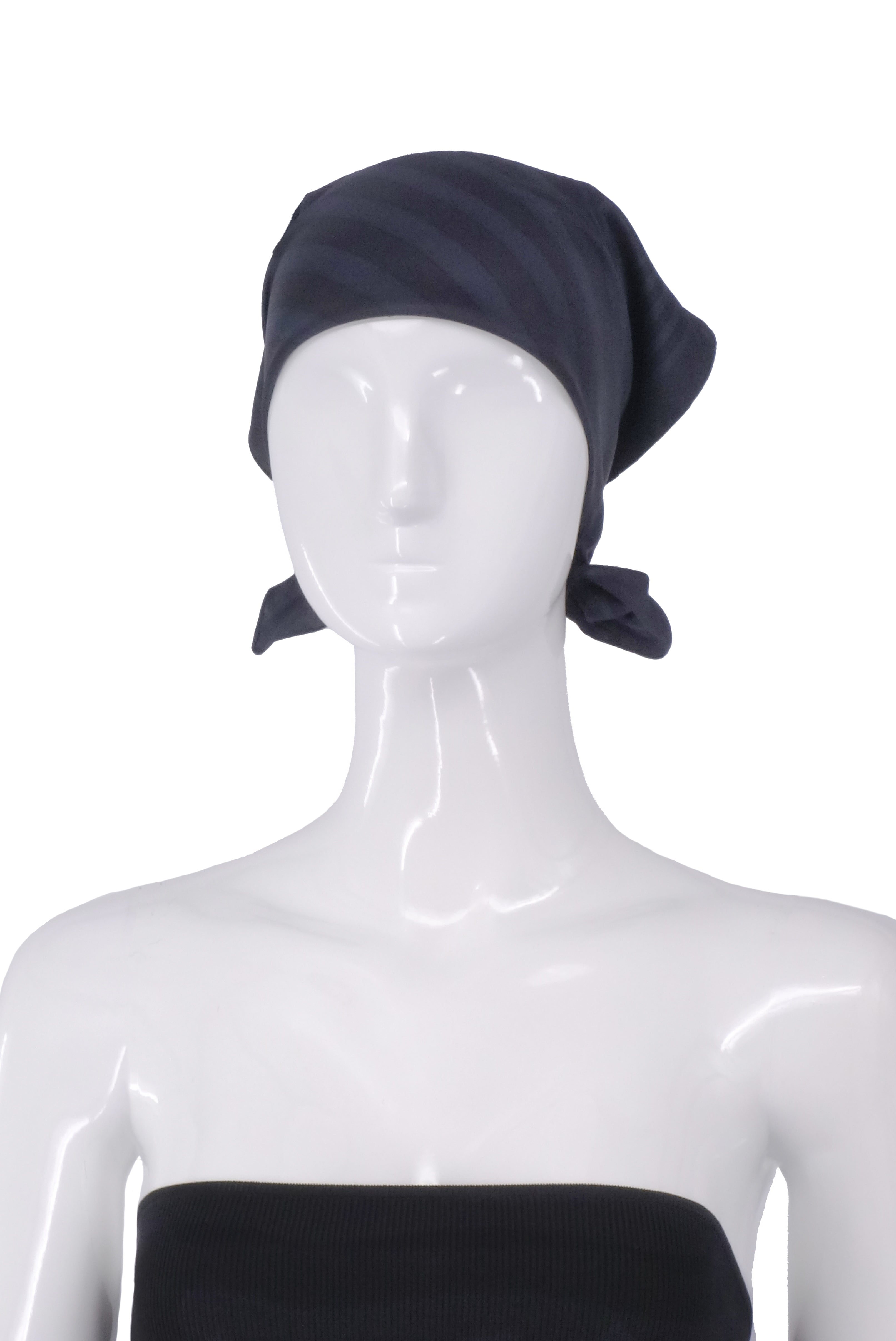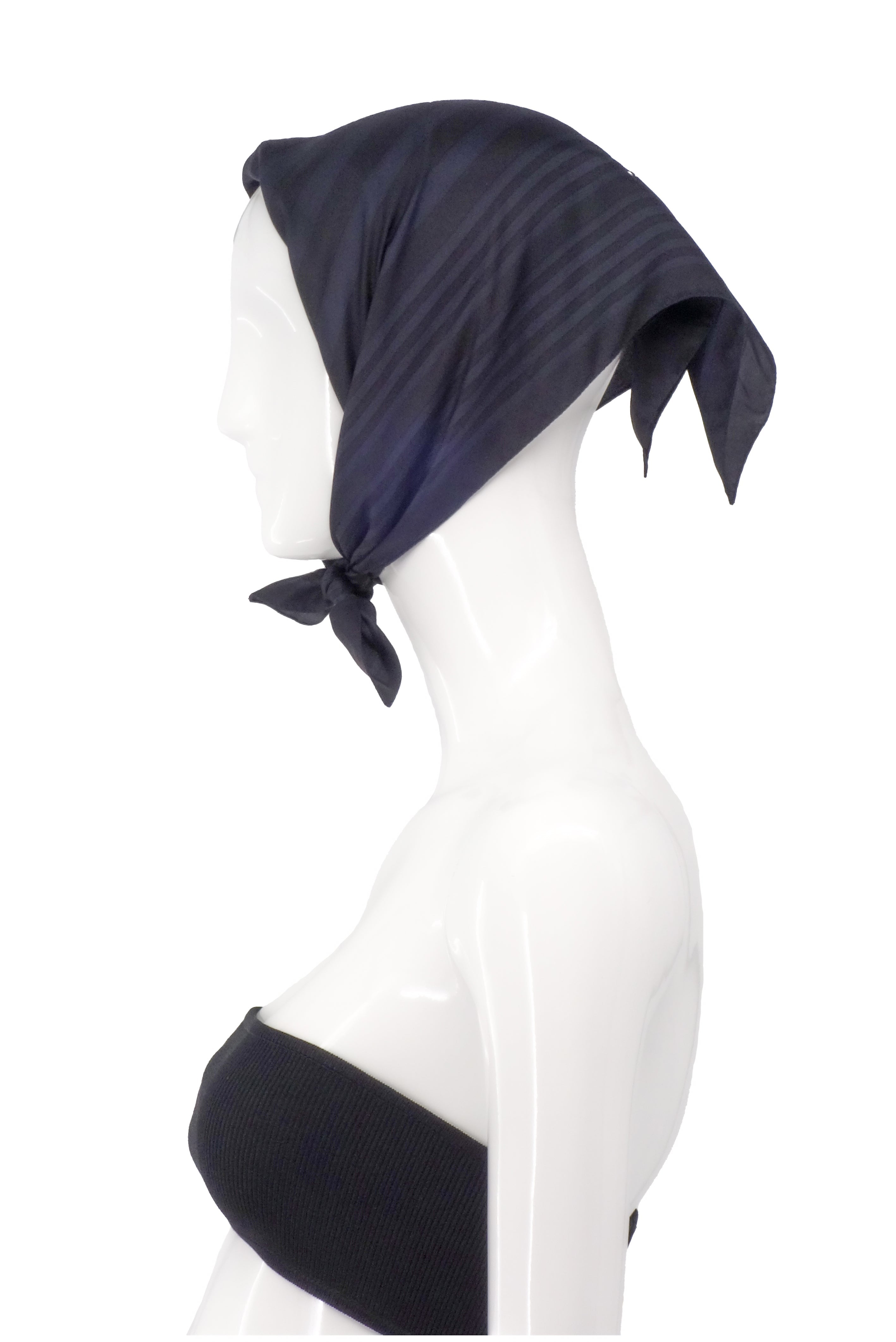 A Maison Martin Margiela navy blue silk headscarf with blue-toned stripe details. The headpiece has an elastic band attached for fit. From the Maison Martin Margiela Spring / Summer 2007 collection.