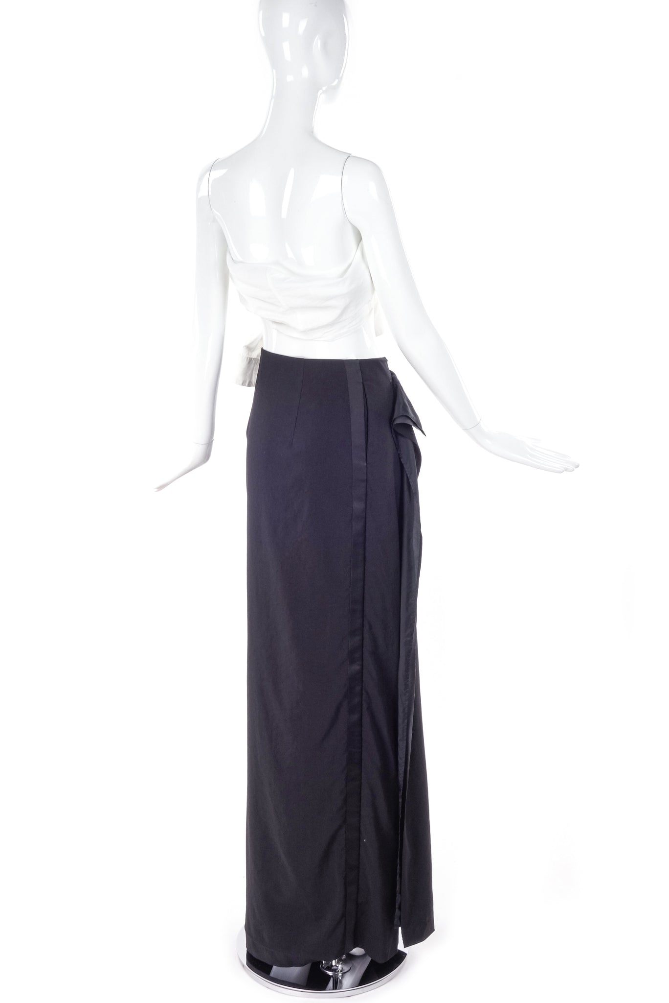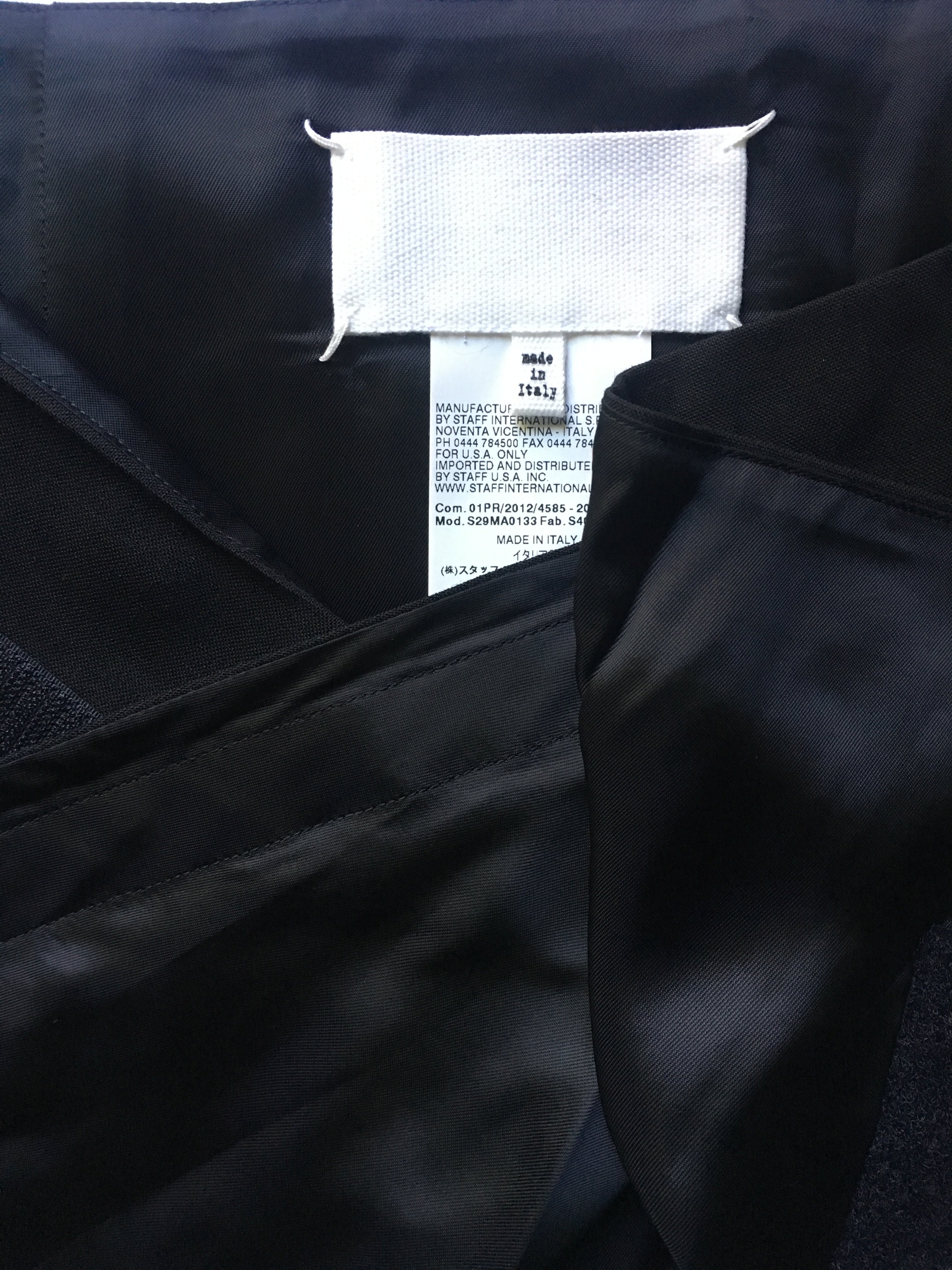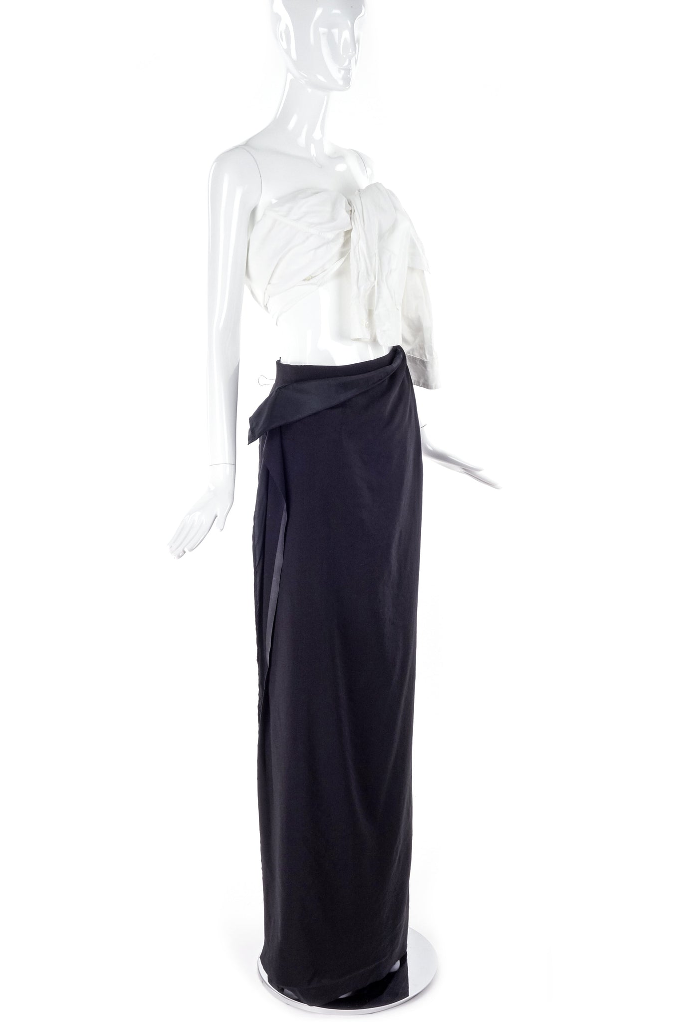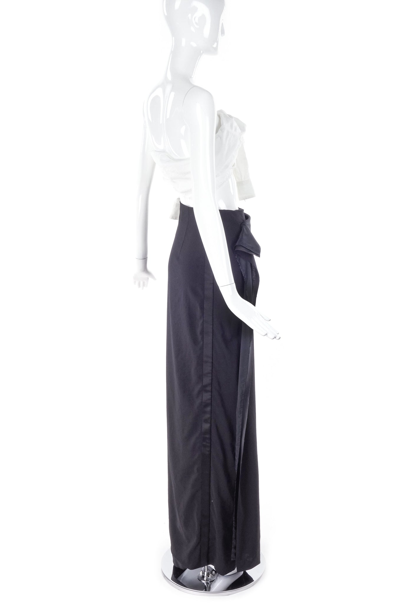 A wrap skirt by Maison Margiela, the skirt has a tuxedo stripe - overhanging draping on the side and a velcro closure.