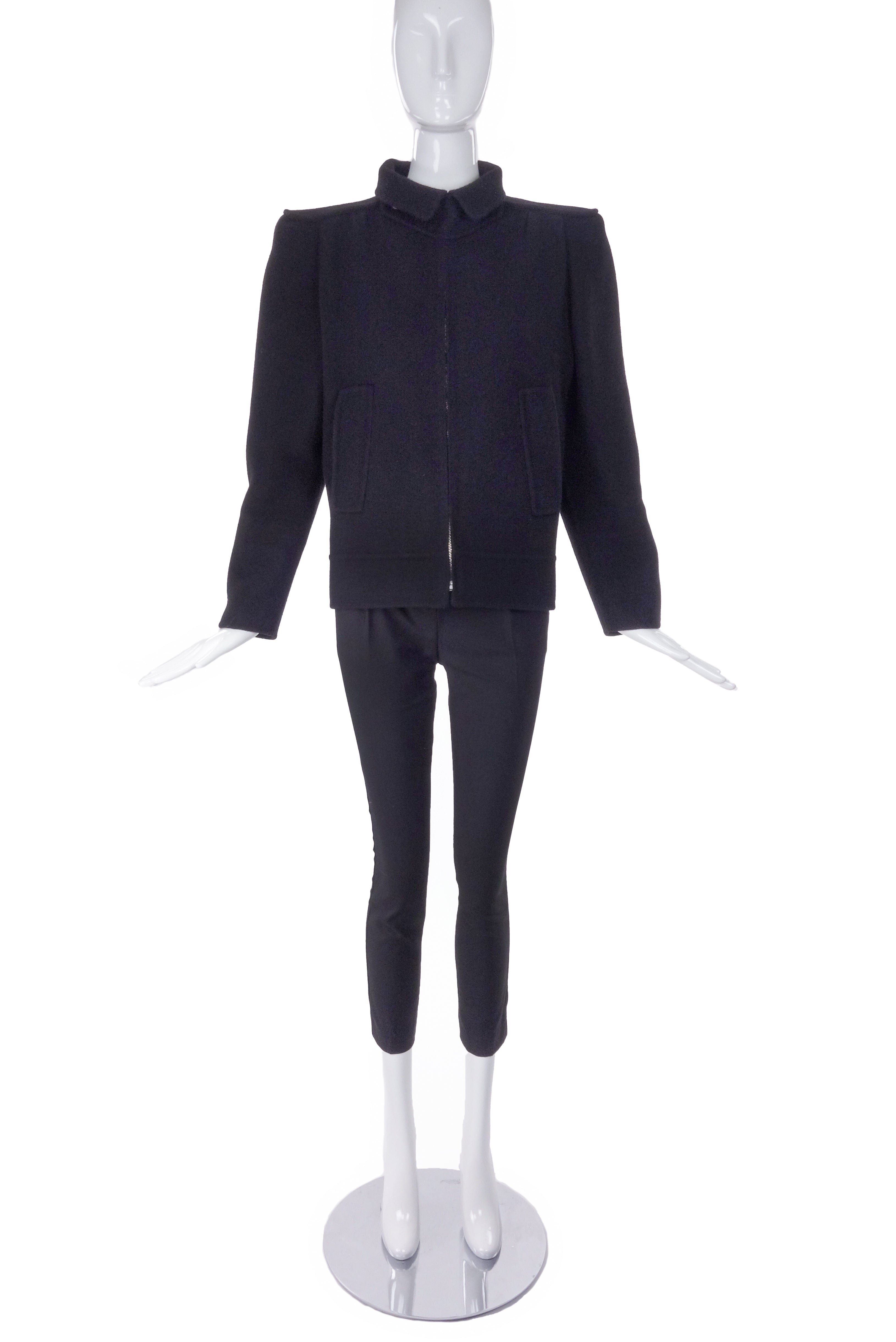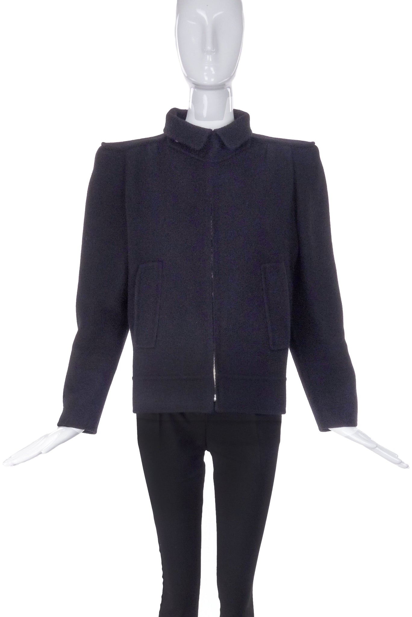 A Marc Jacobs black felted wool military, structured jacket. The jacket has a very geometric silhouette created from the sculptural construction. The jacket has an epaulet detail on each of the broadly cut shoulders and a silver toned zipper down the front with two angled pockets on each side. The collar of the jacket has a strap across the front of the neckline with a button closure. From the Marc Jacobs Fall / Winter 2009 collection.