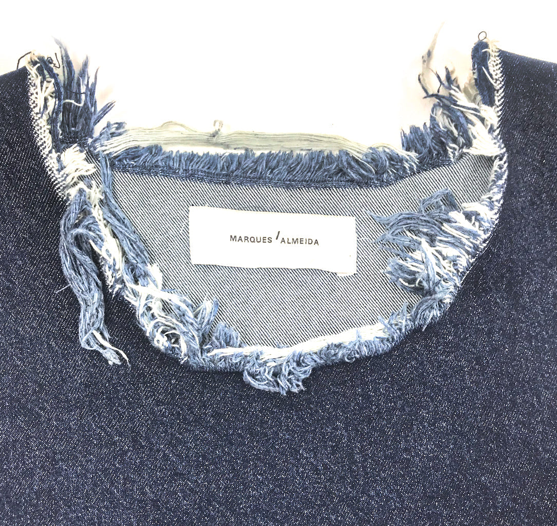 A classic blue denim shift dress by Marques Almeida with distressed and frayed hem and neckline.