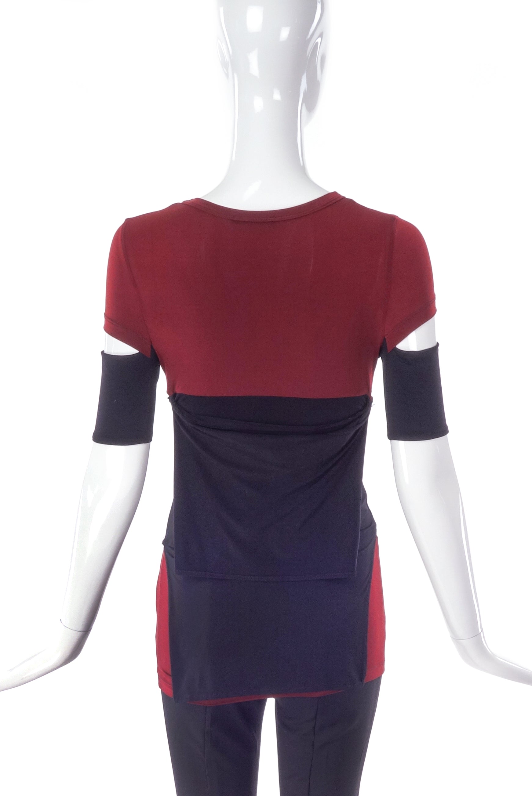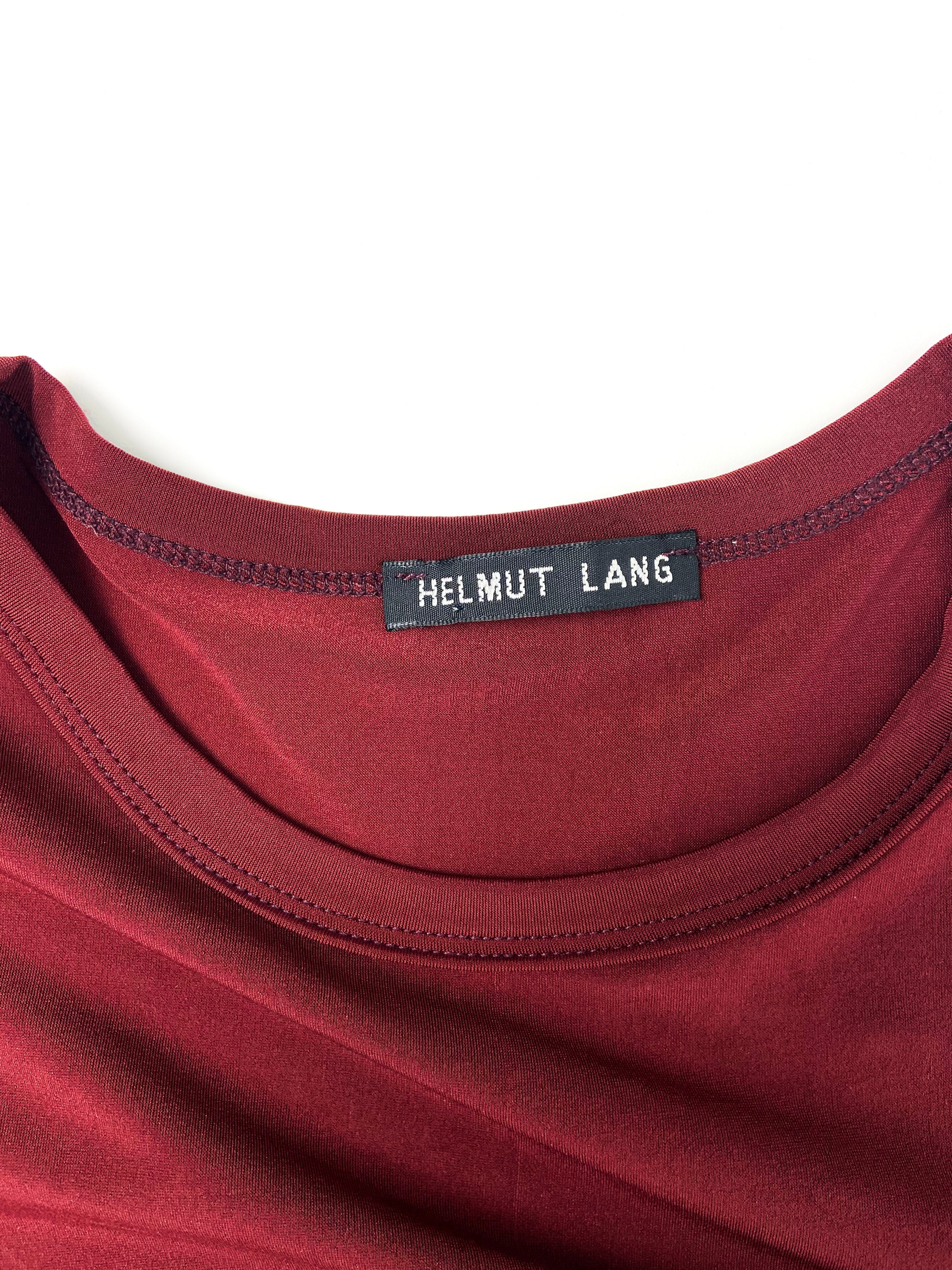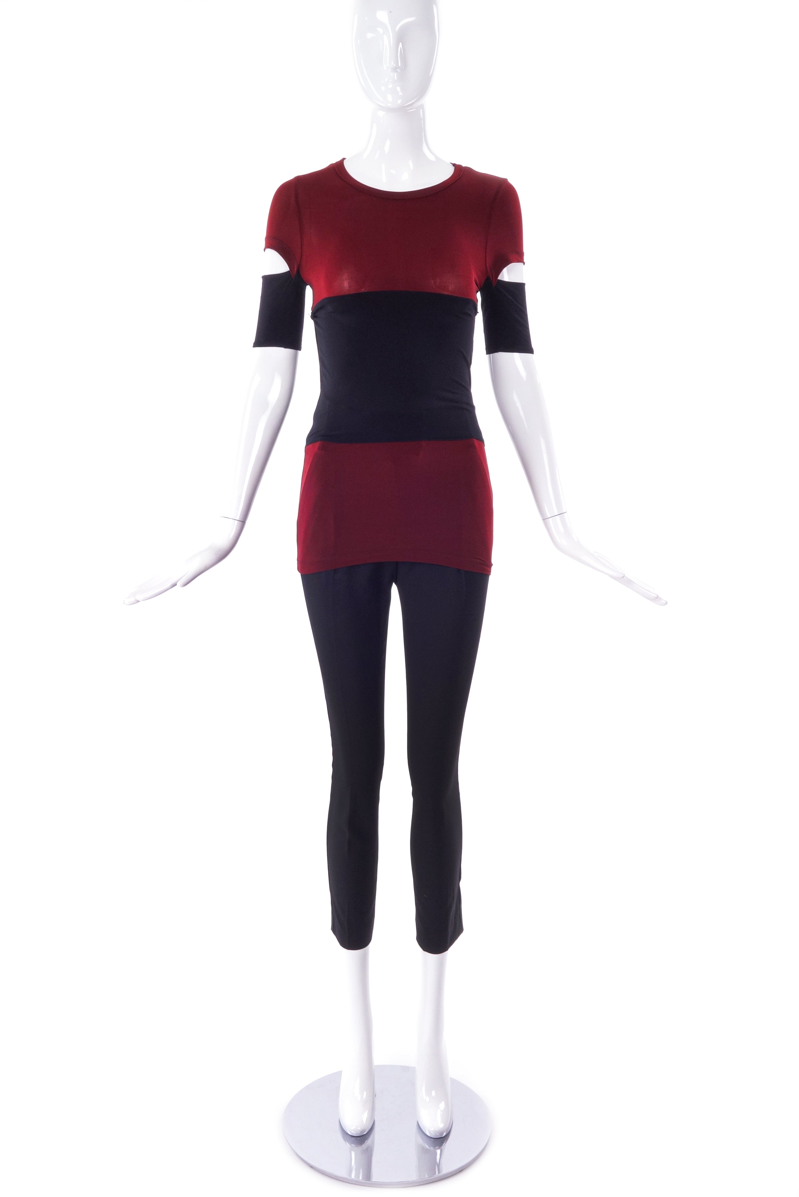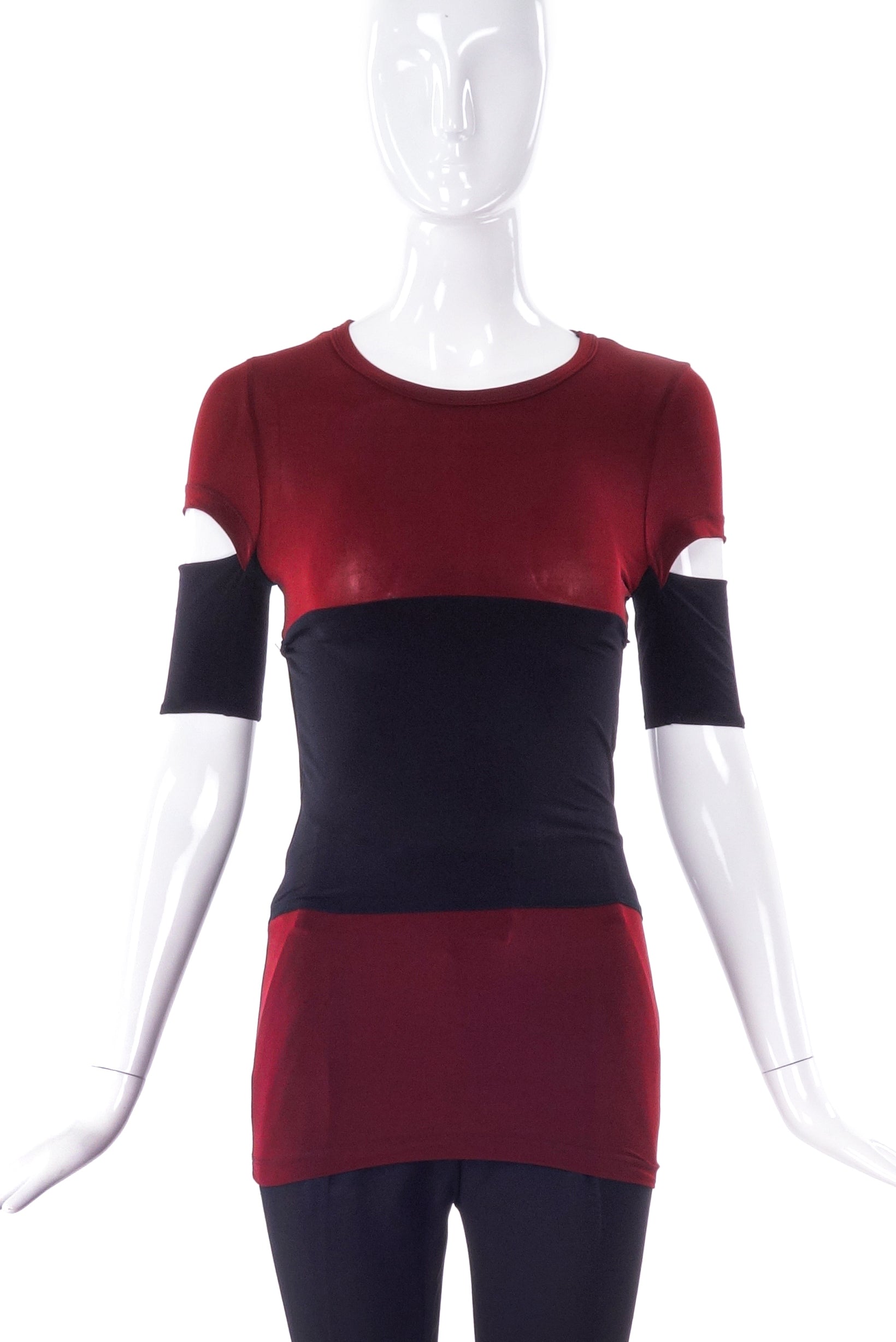 A Helmut Lang maroon cotton stretch t-shirt with a black stripe at midriff. The sleeves of the t-shirt have the classic Helmut Lang cut-out at the sleeve. Circa 1990's.