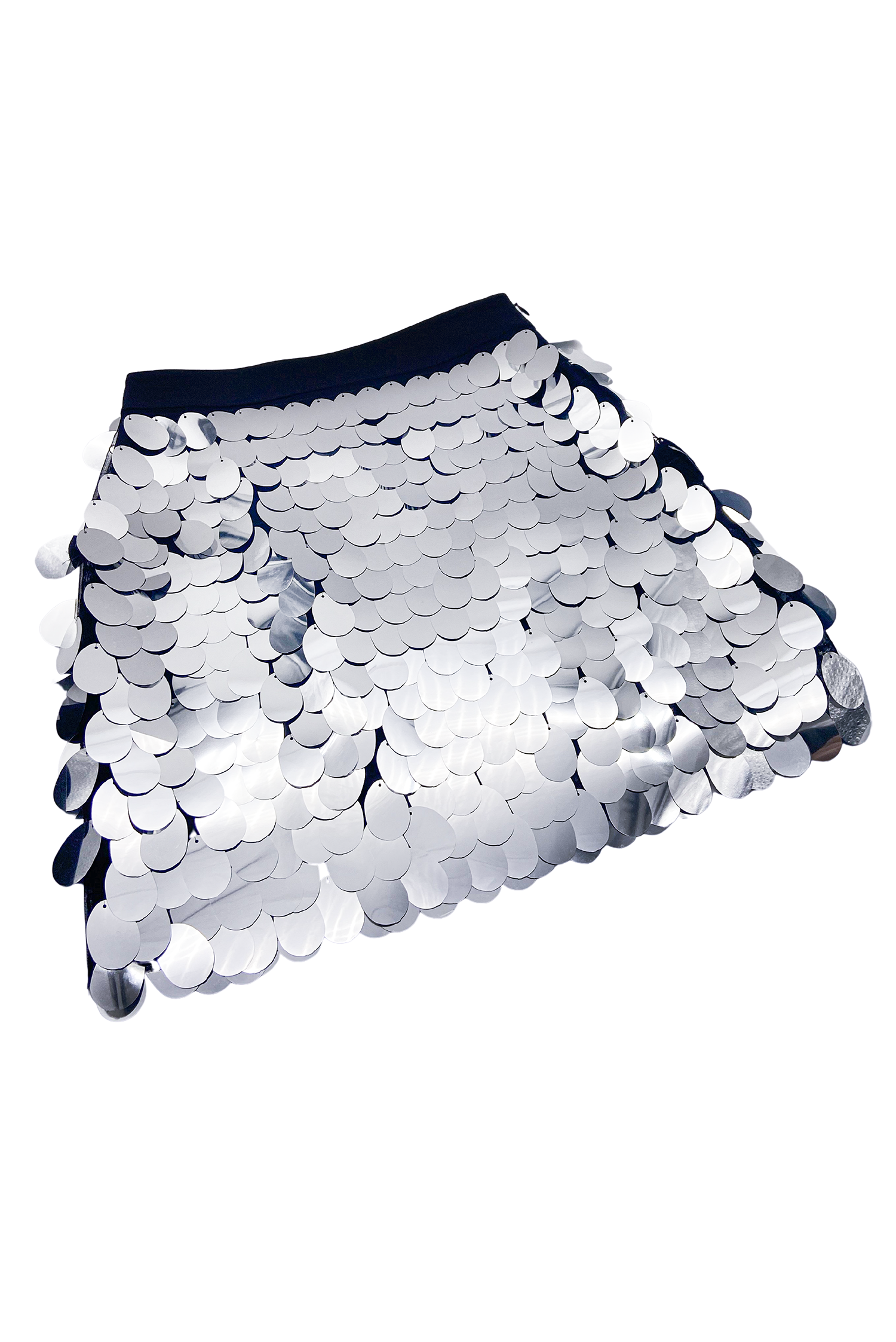 A Milly miniskirt that is covered in large silver oval paillettes all over the skirt. The skirt has a black grosgrain ribbon waist band with an invisible zipper down the left side of the skirt.