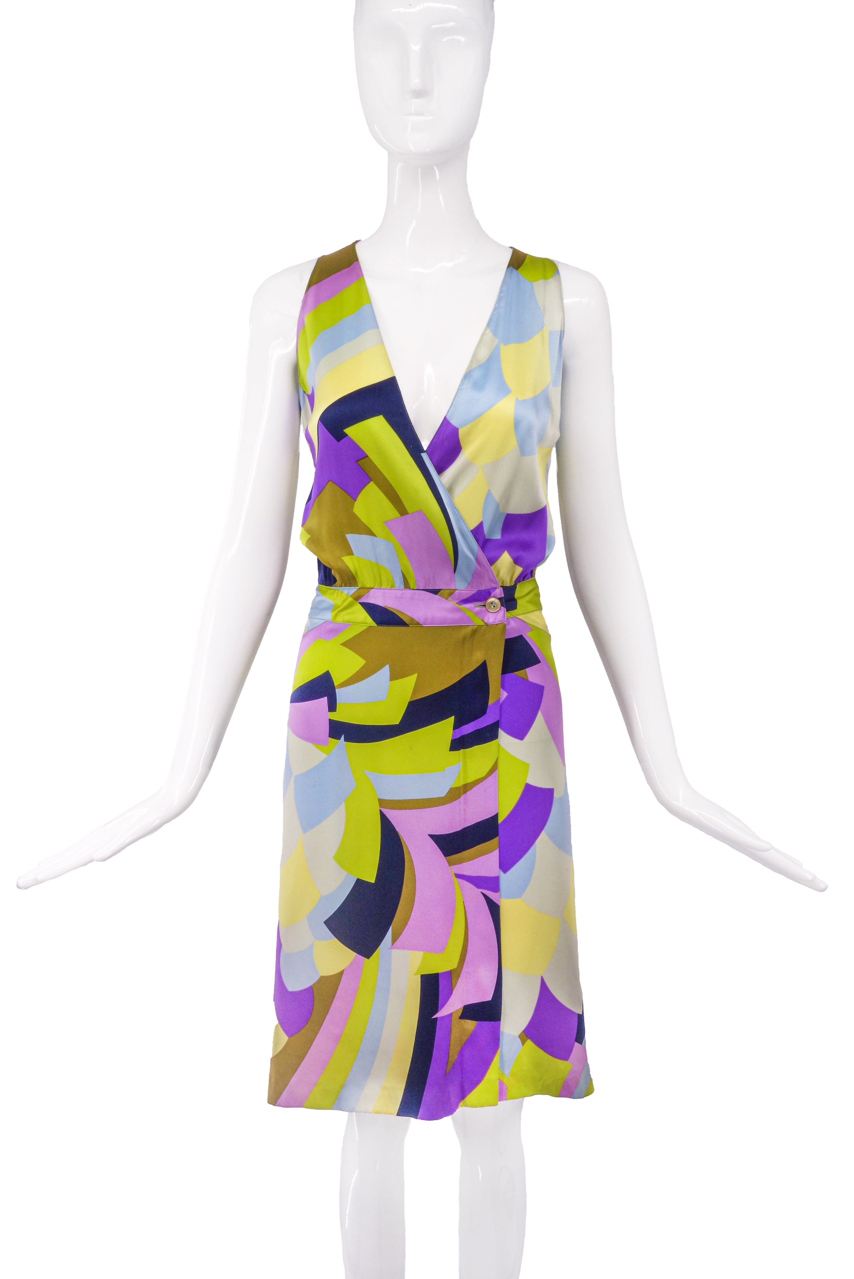A vintage Missoni multi-color 1960's retro print silk sheath dress. The dress has a v-neckline with a button closure on the left hip of the dress to create a wrap dress-like fit. Circa 1990's.