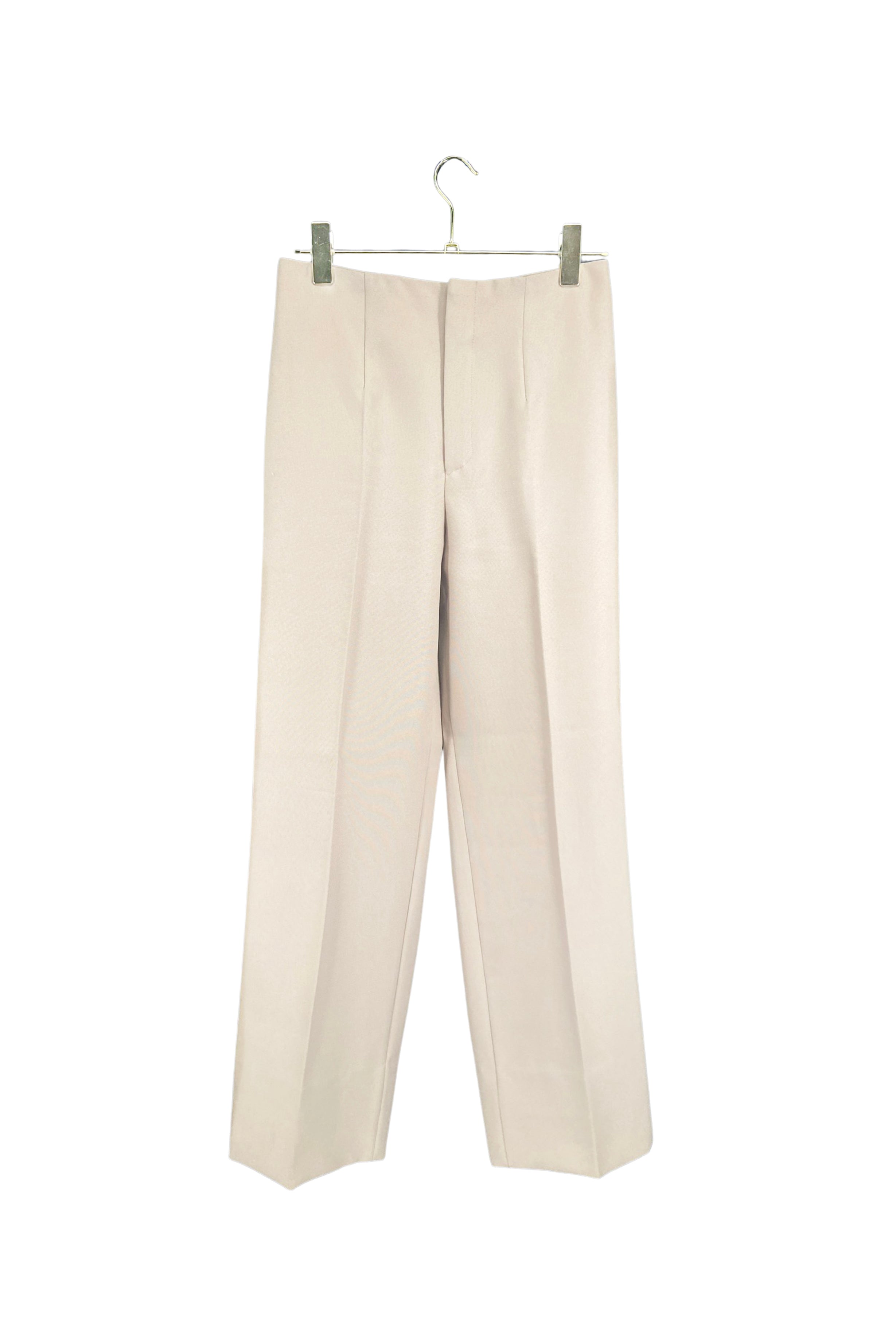 A pair of Miu Miu ivory trousers in the style of a 1970's "Leisure Suit". the trousers have dart detailing in the front of the hips with. sharp crease down the front of the trousers.