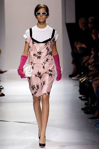 A Miu Miu bubblegum pink dress with a graphic star pattern. The dress has wide black straps at the slightly sweetheart neckline to create a V shape in the back of the dress. The dress has two structured ruffles going up the side seams of the dress coming from the natural waistline. From the Miu Miu Spring / Summer 2006 collection Look #2 worn by Freja Beha Erichsen.