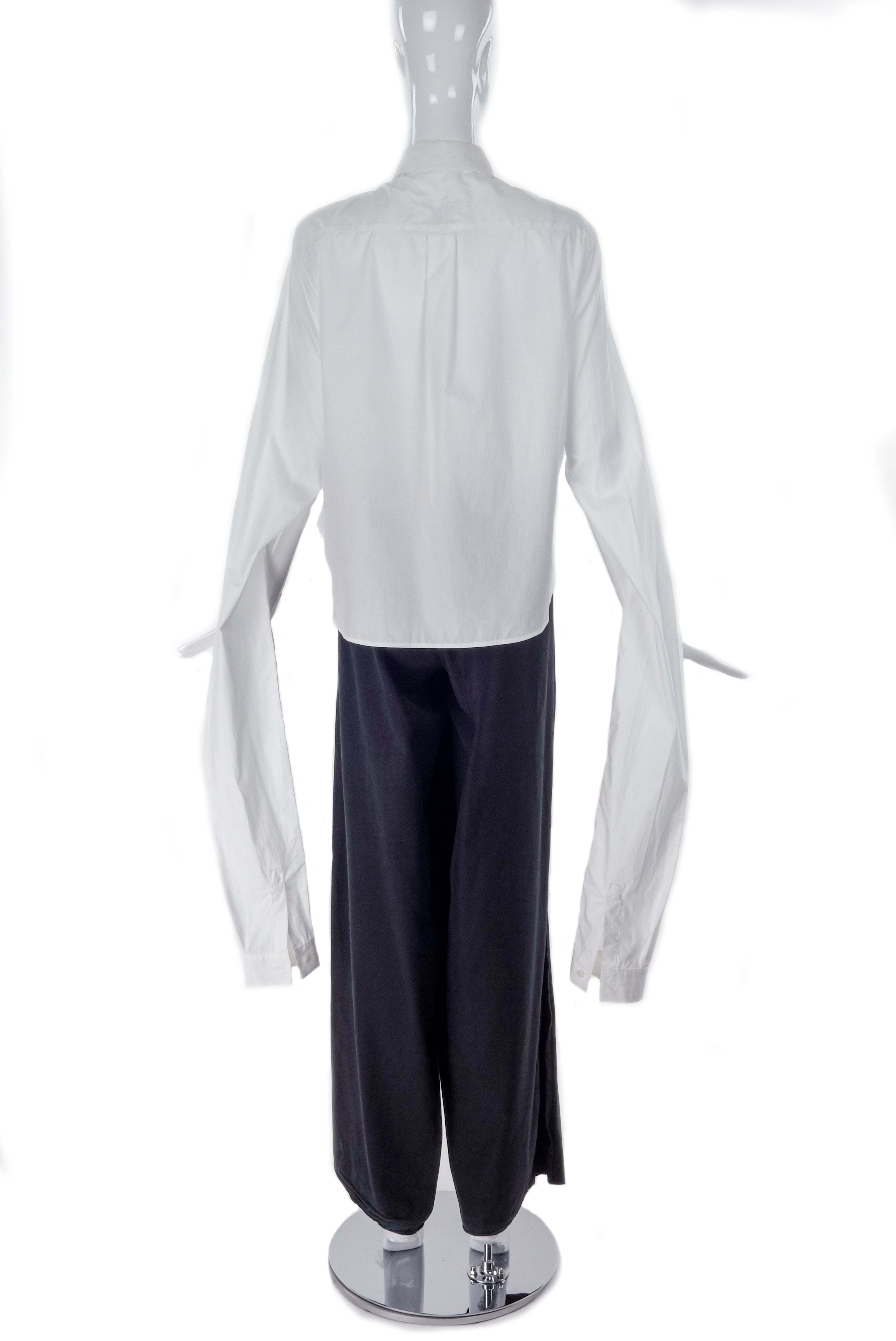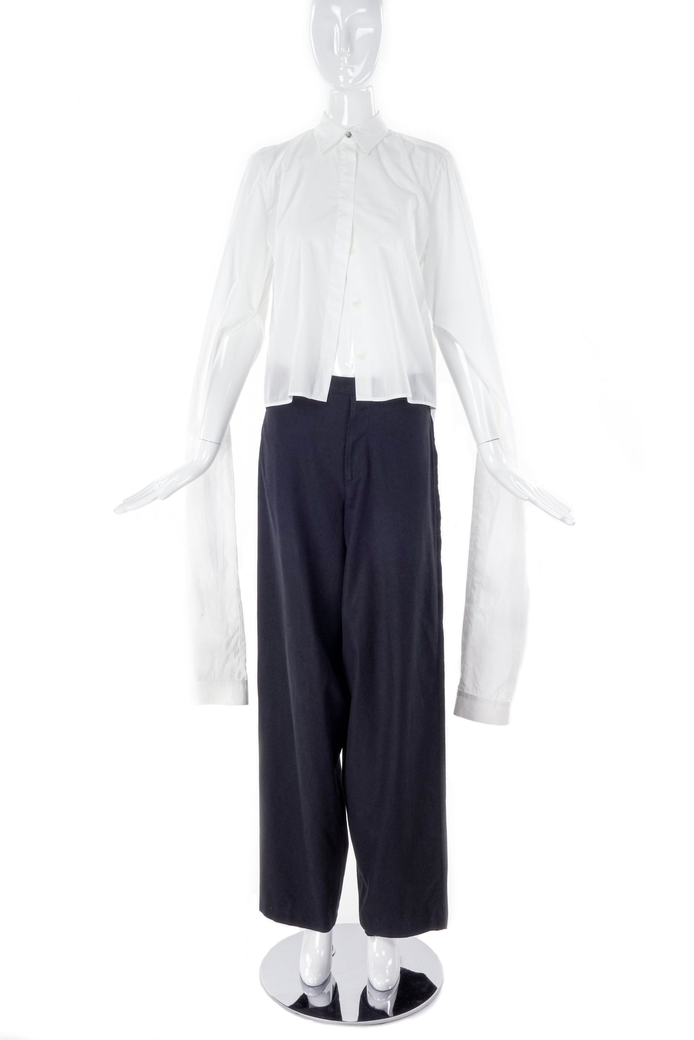 A MM6 Margiela white cotton button up shirt with elongated, oversized sleeves that drape down past the wrist. The hem of the shirt hits at a proper waist. The sleeves have an opening for the arms about in the middle of the exaggerated length sleeve.
