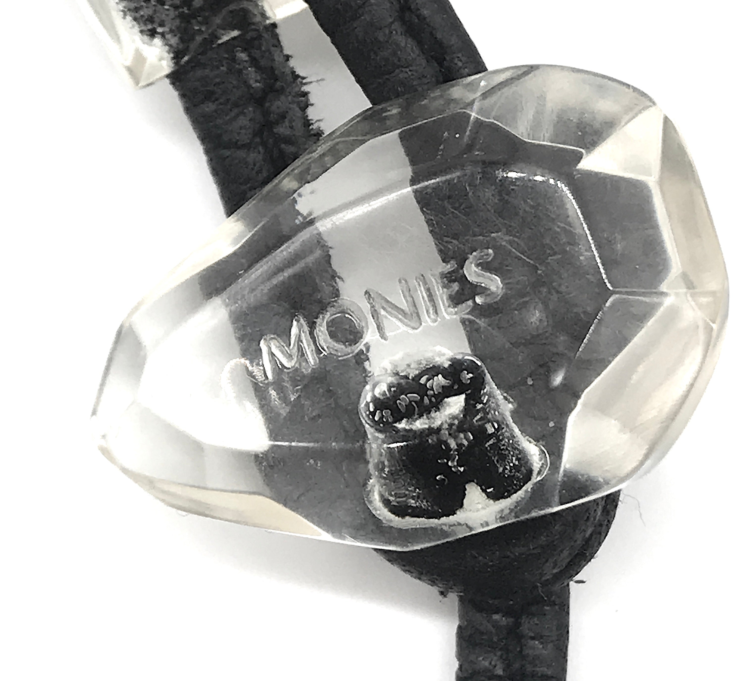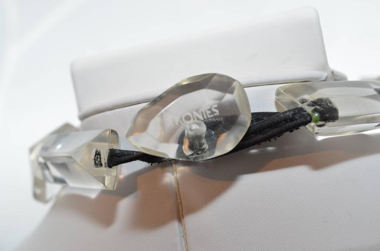 A Monies statement necklace with clear, geometric lucite crystals in a variance of sizes on a leather cord with a certified stamped closure.