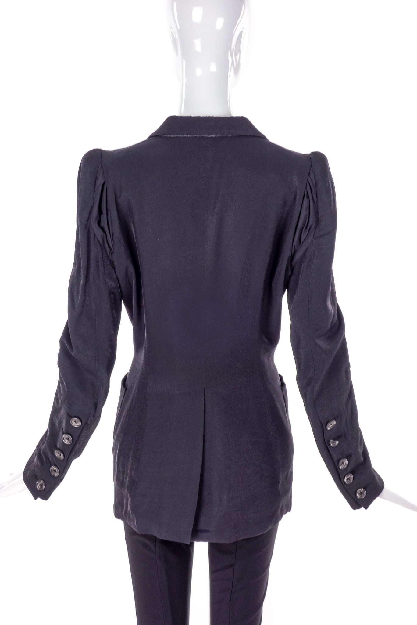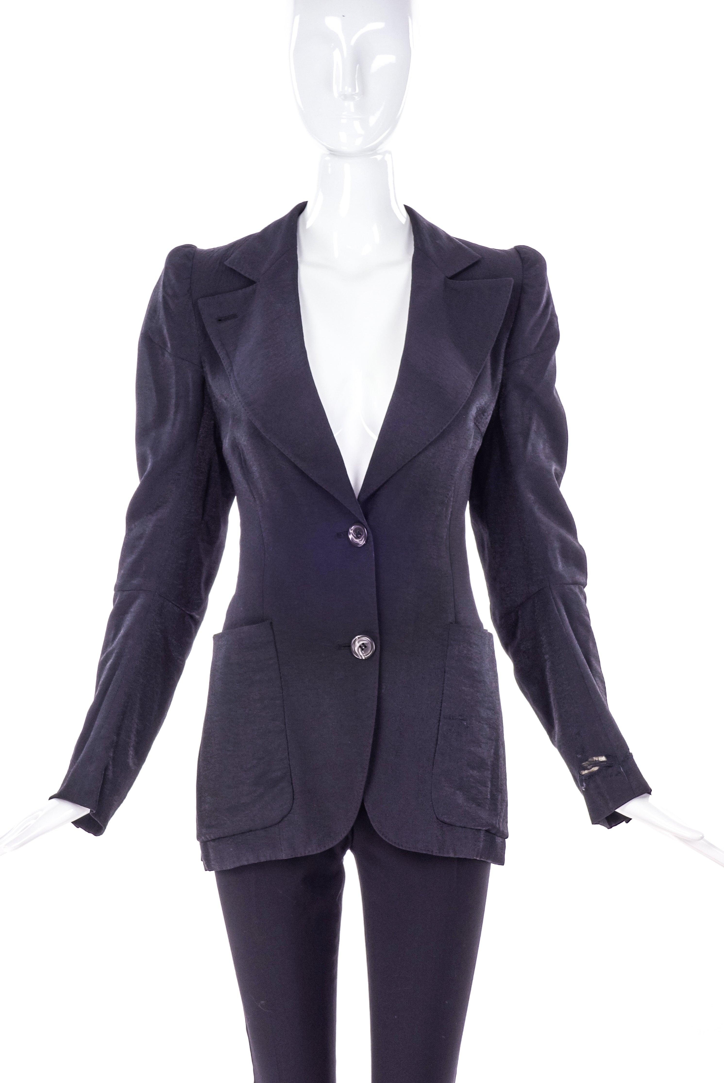 A Maison Martin Margiela faded black, single breasted blazer with two buttons down the front of the blazer and an exaggerated notched lapel. The jacket has the iconic rounded constructed shoulders which gives the sleeve a structured pouf at the shoulder seam. From the legendary Maison Martin Margiela Spring / Summer 1992 "Margiela by Candlelight" collection.