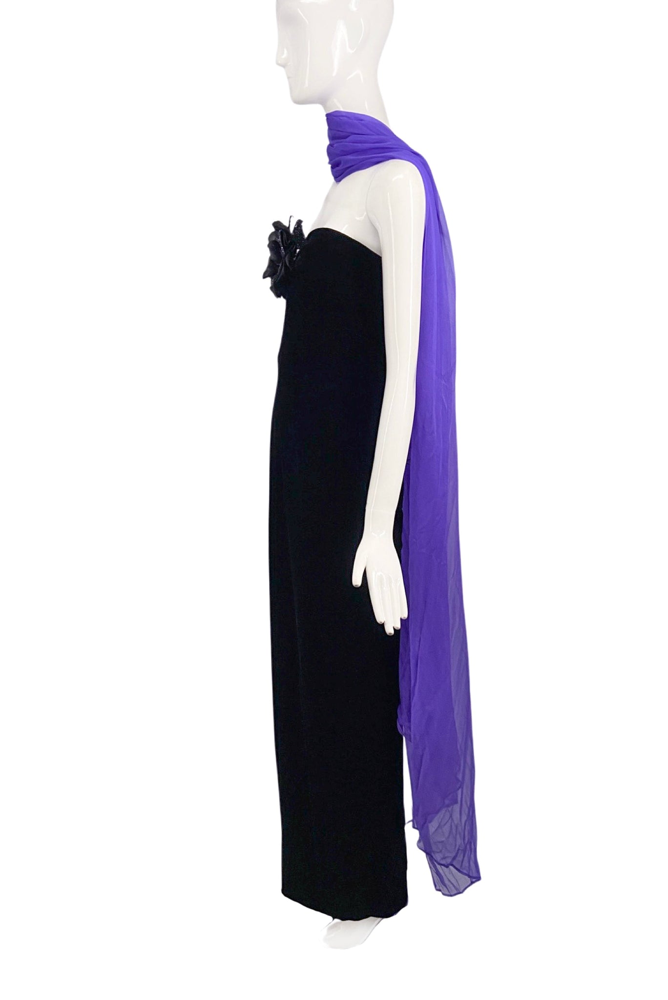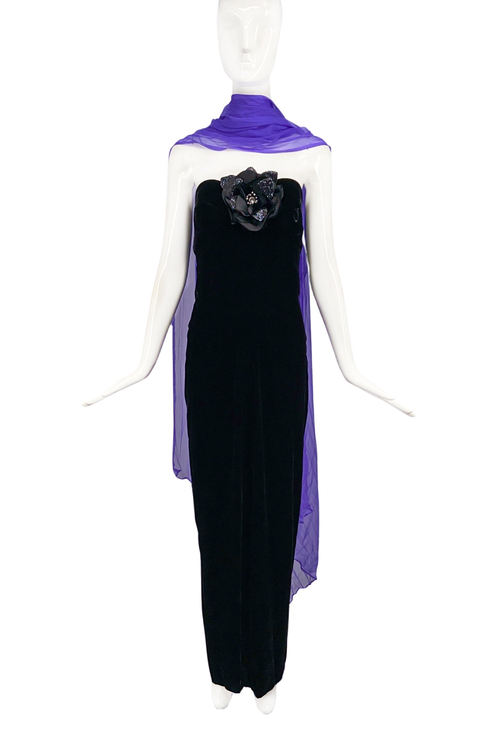 Nina Ricci Black Velvet Bustier Dress Gown with Glitter Flower and Purple Chiffon Scarf