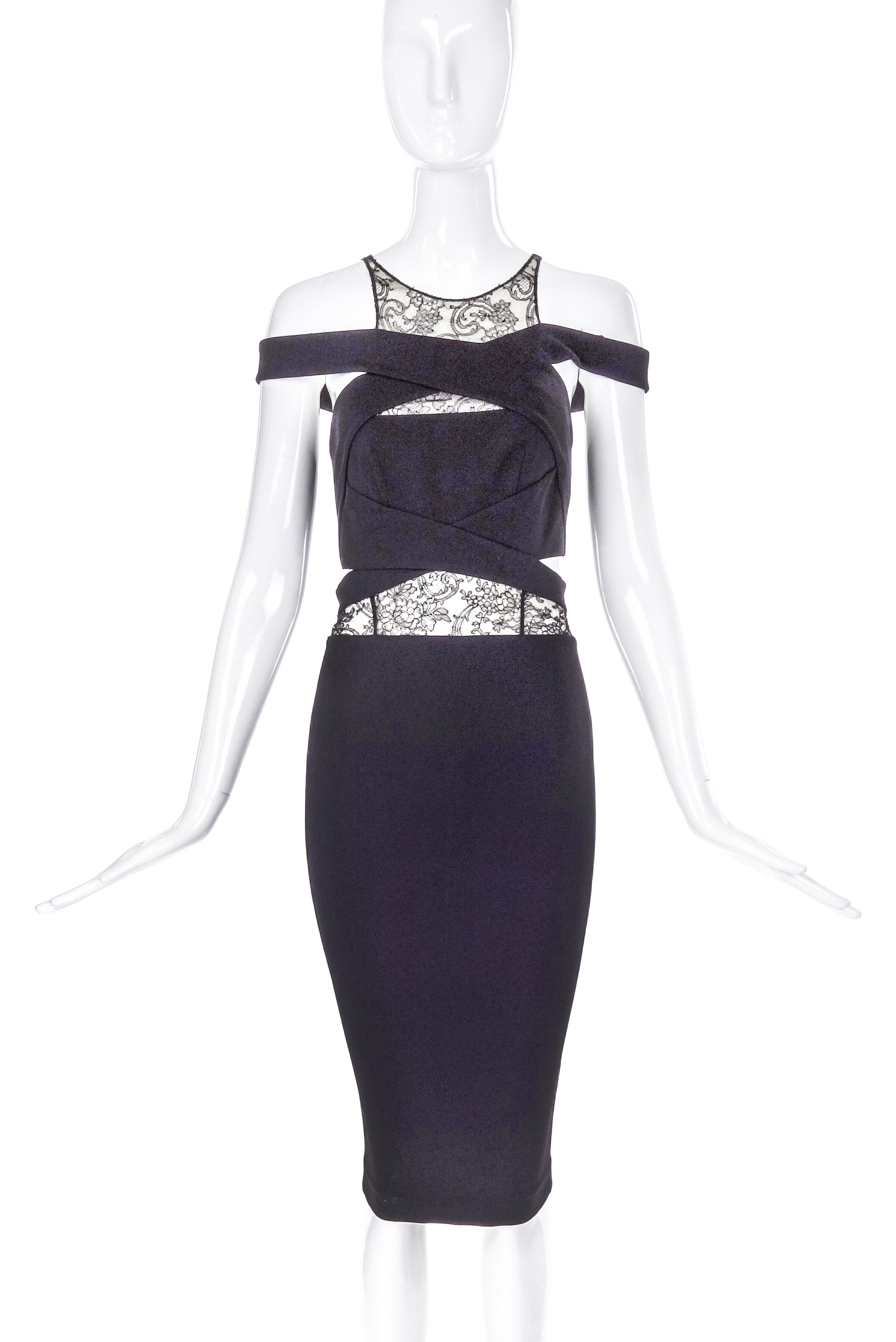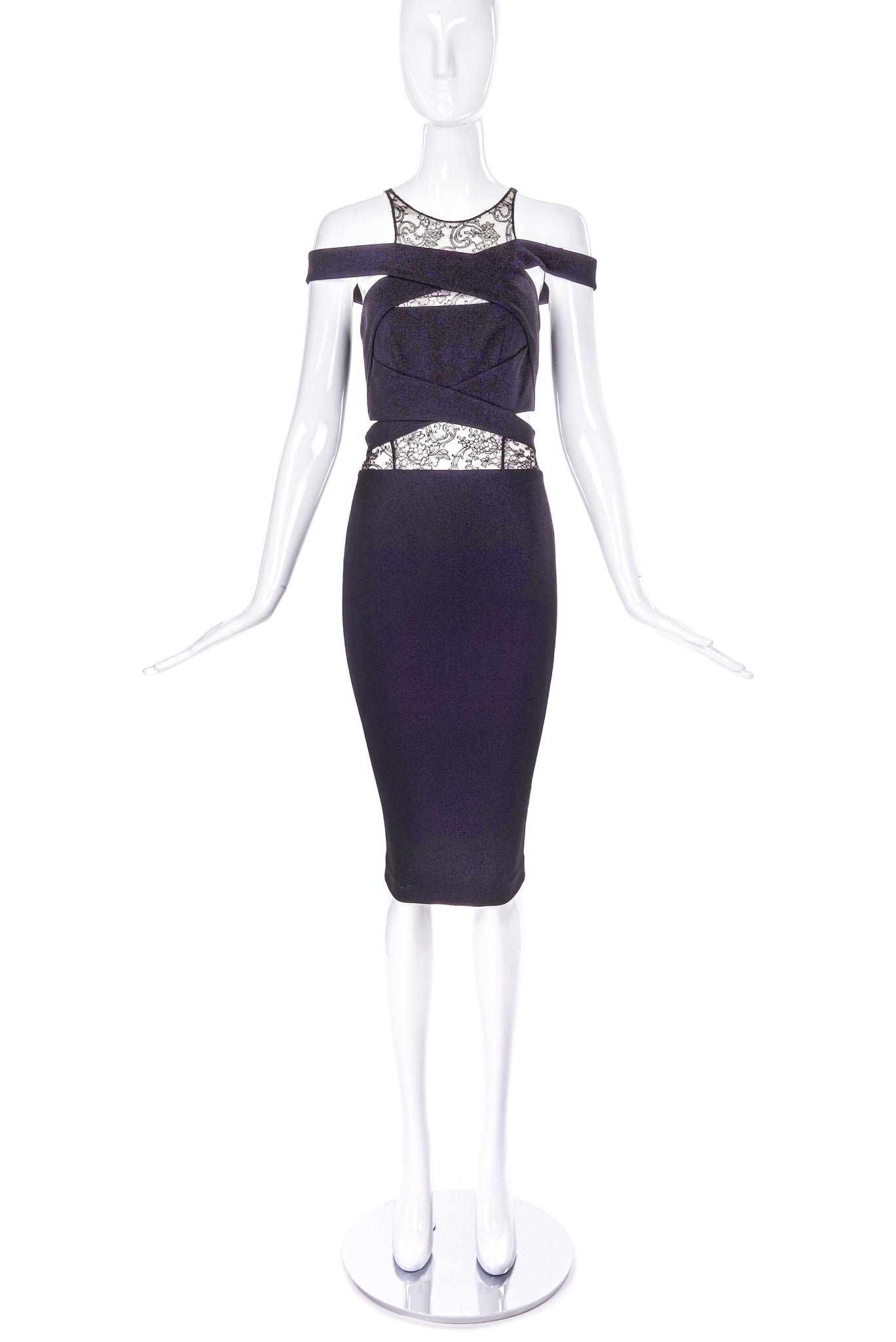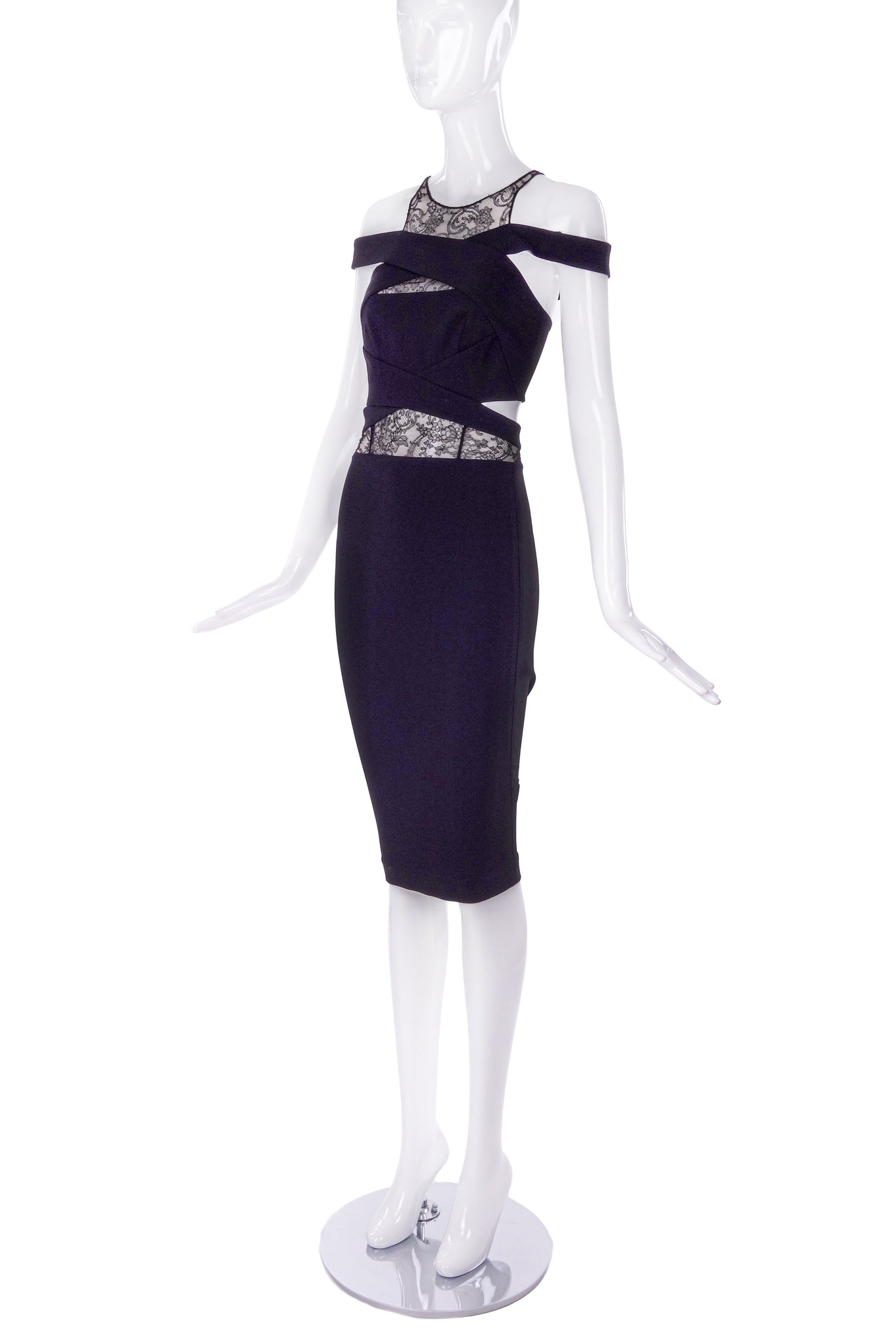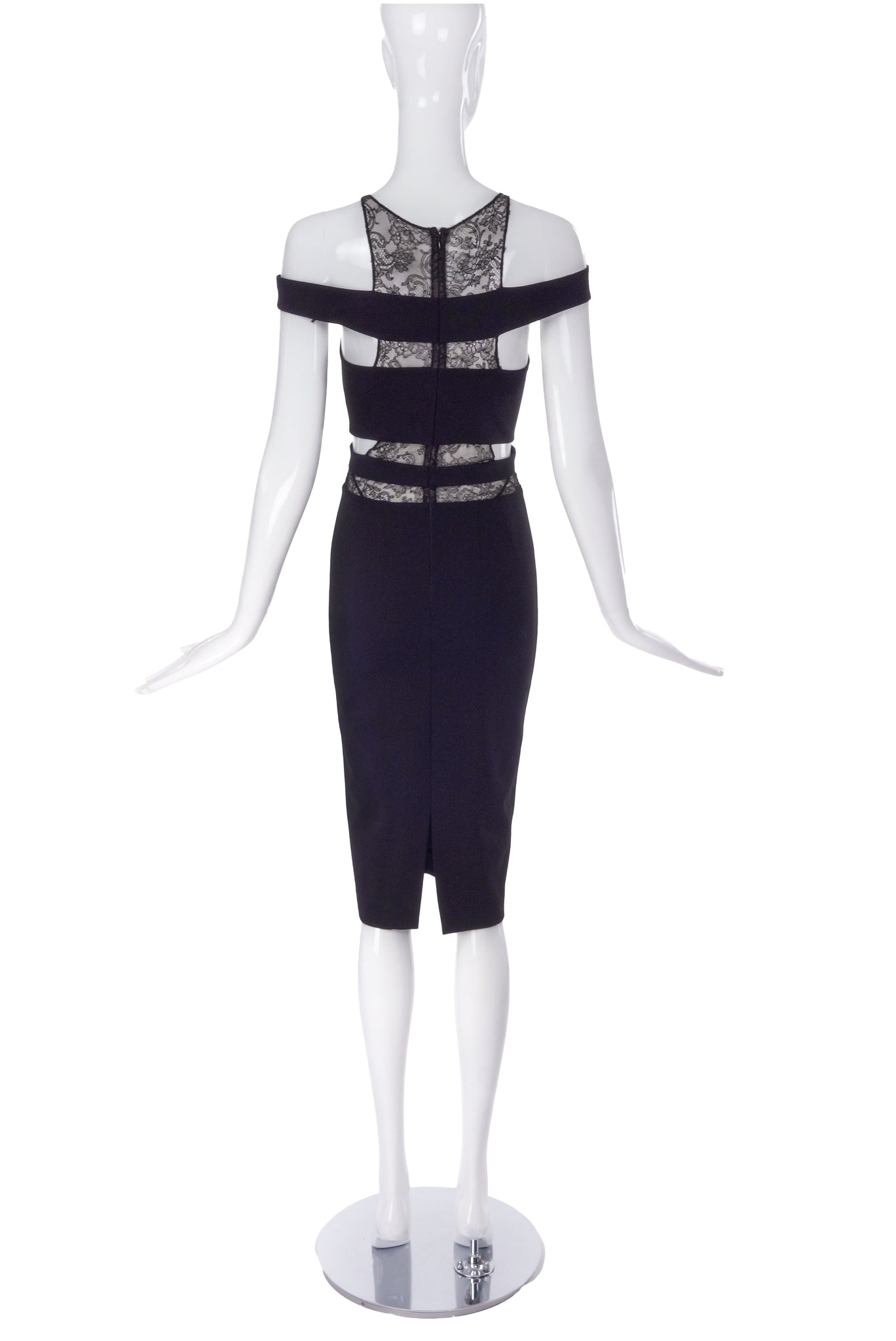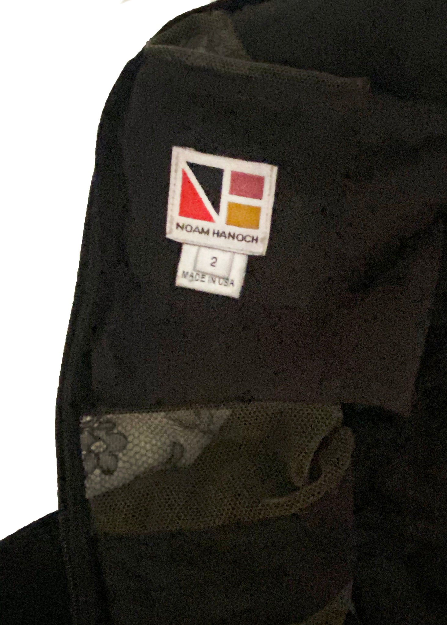 A Noam Hanoch graphic knee-length, black bodycon dress . This dress is a body conscious and fitted with black lace against tan tulle insert details throughout the torso. Off the shoulder straps intertwine across the bust to create an interesting and flattering shape along the bust. Dress has hidden zipper in back and hook and eye closure at neckline.