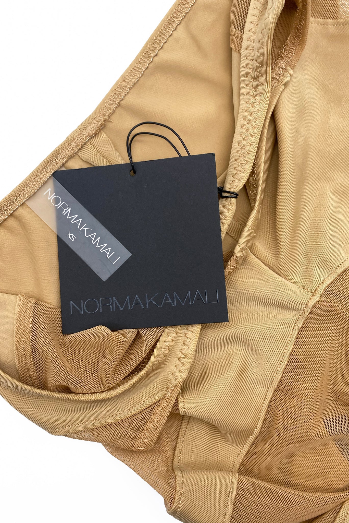 A Norma Kamal bodysuit in a tan nude-tone. The one shoulder bodysuit has two sheer panels going up the body for a flattering peek-a-boo detail.