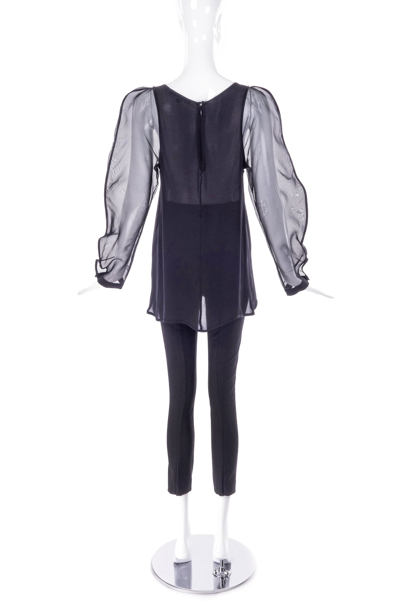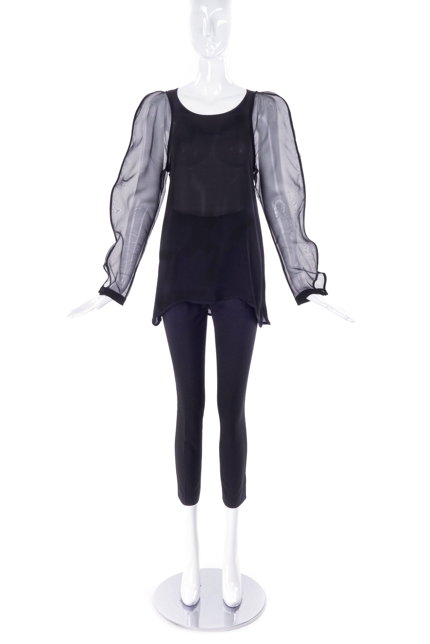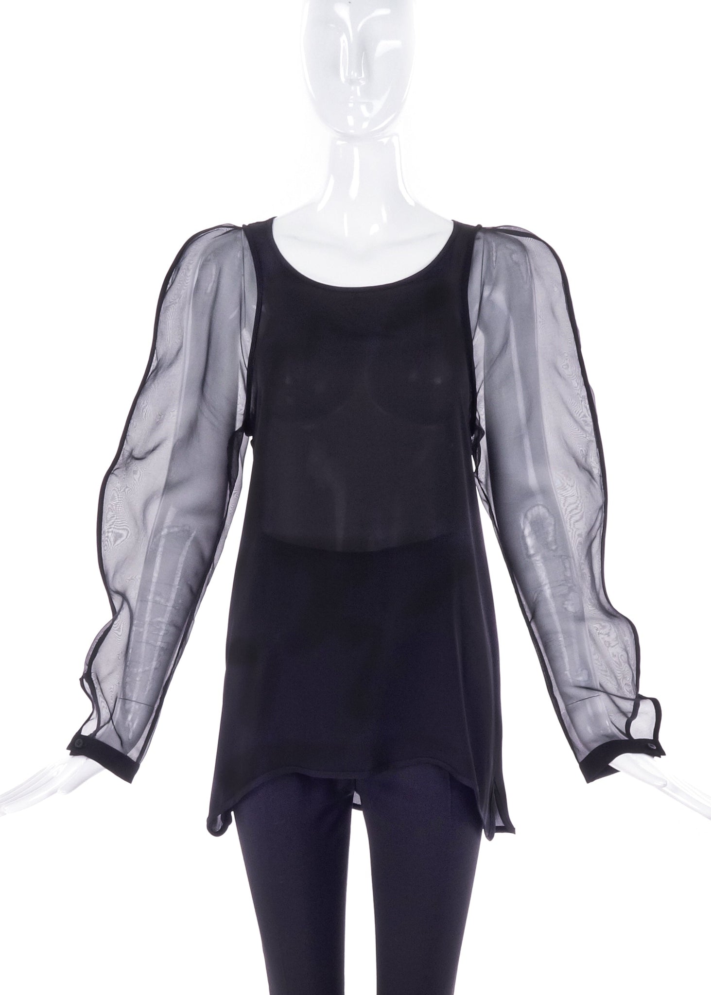 An Ohne Titel black chiffon top with oversized organza bishop style organza sleeves. The sleeves have a single button closure at the cuff of the sleeve. The back of the top has a hook and eye at the neckline along with an invisible zipper down the back of the top.
