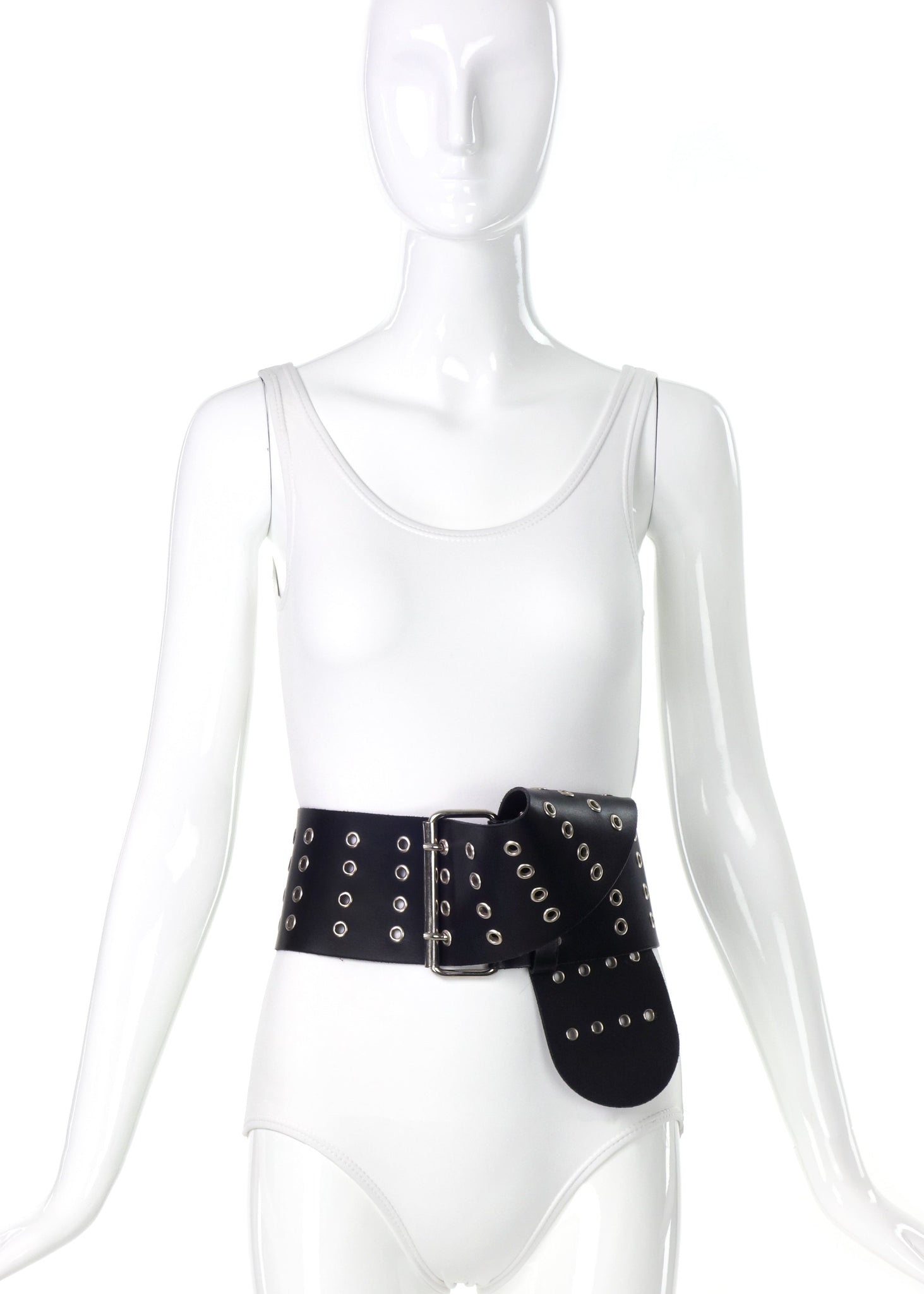 An oversized black leather, waist cinching belt with silver grommet details and a silver toned large belt buckle with two buckle tongues that fits into grommets throughout belt.