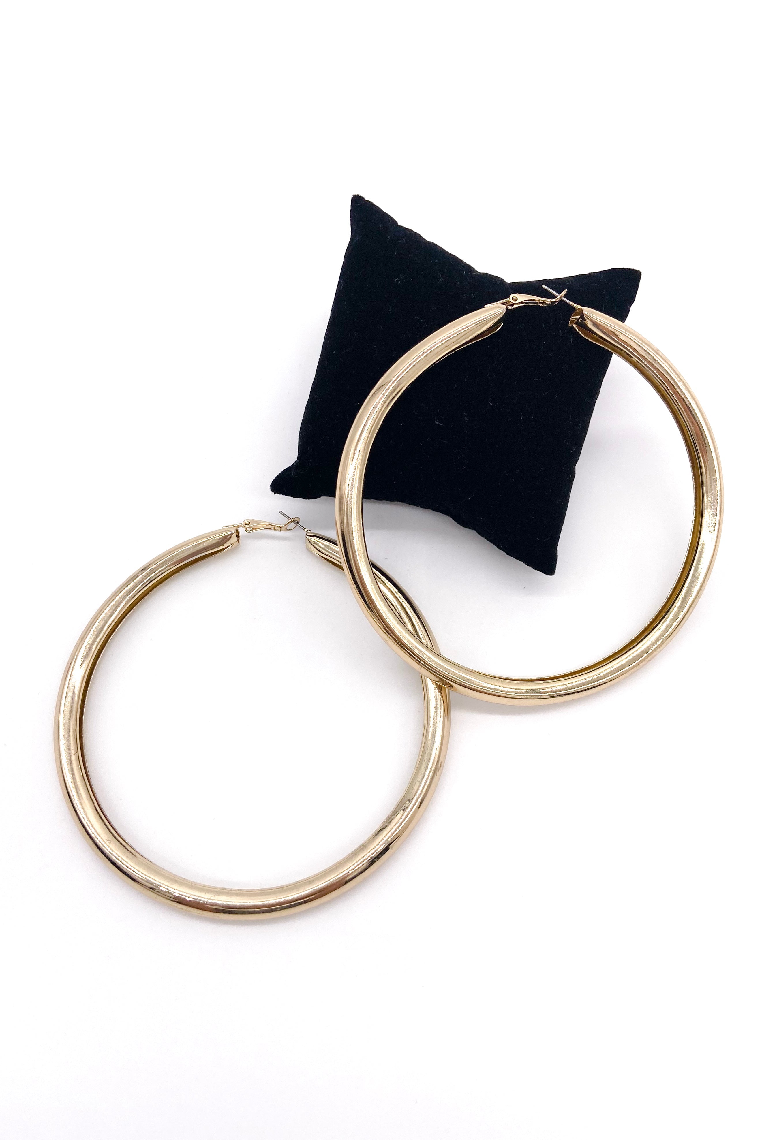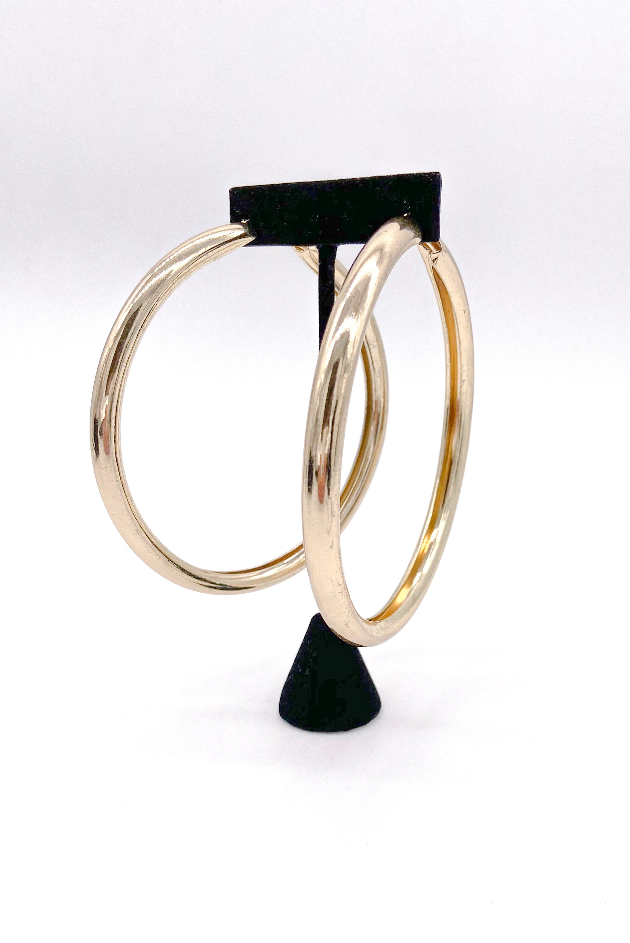 A pair of vintage gold, oversize round hoop earrings. The earrings have a snap bar backing.