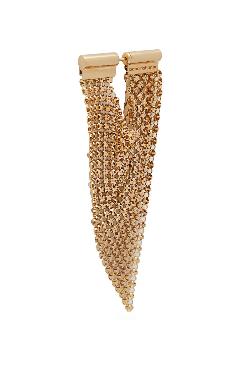Paco Rabanne by Julien Dossena  singular chainmail mesh with rhinestone crystals set into the gold mesh. This earring has a bar stud stamped Paco Rabanne for pierced ears. These earrings are Spring / Summer 2020 collection.