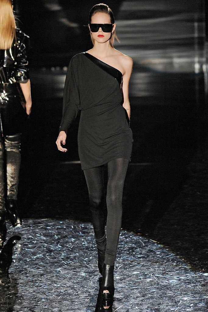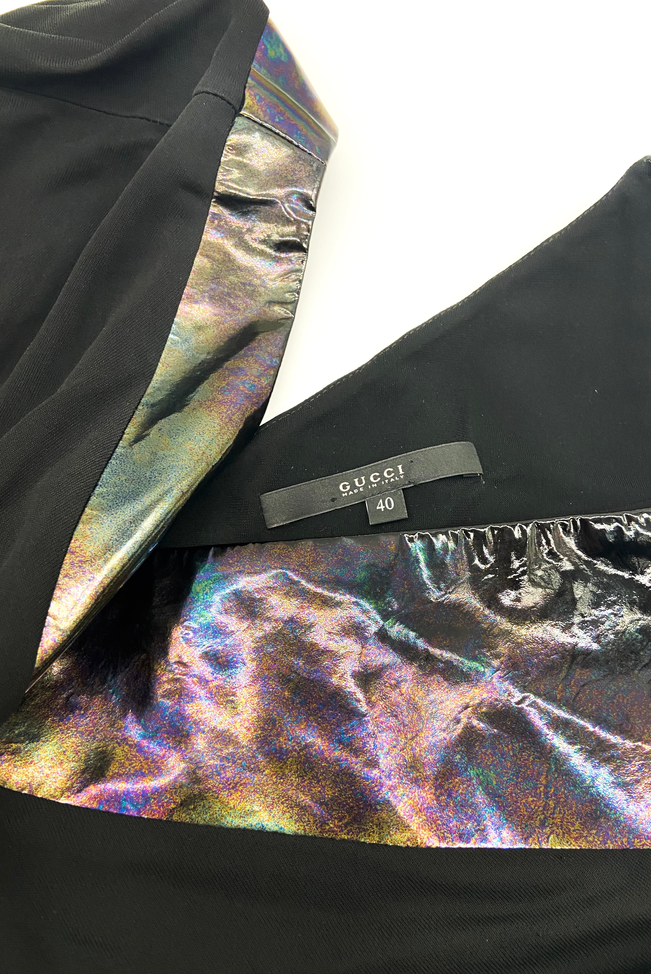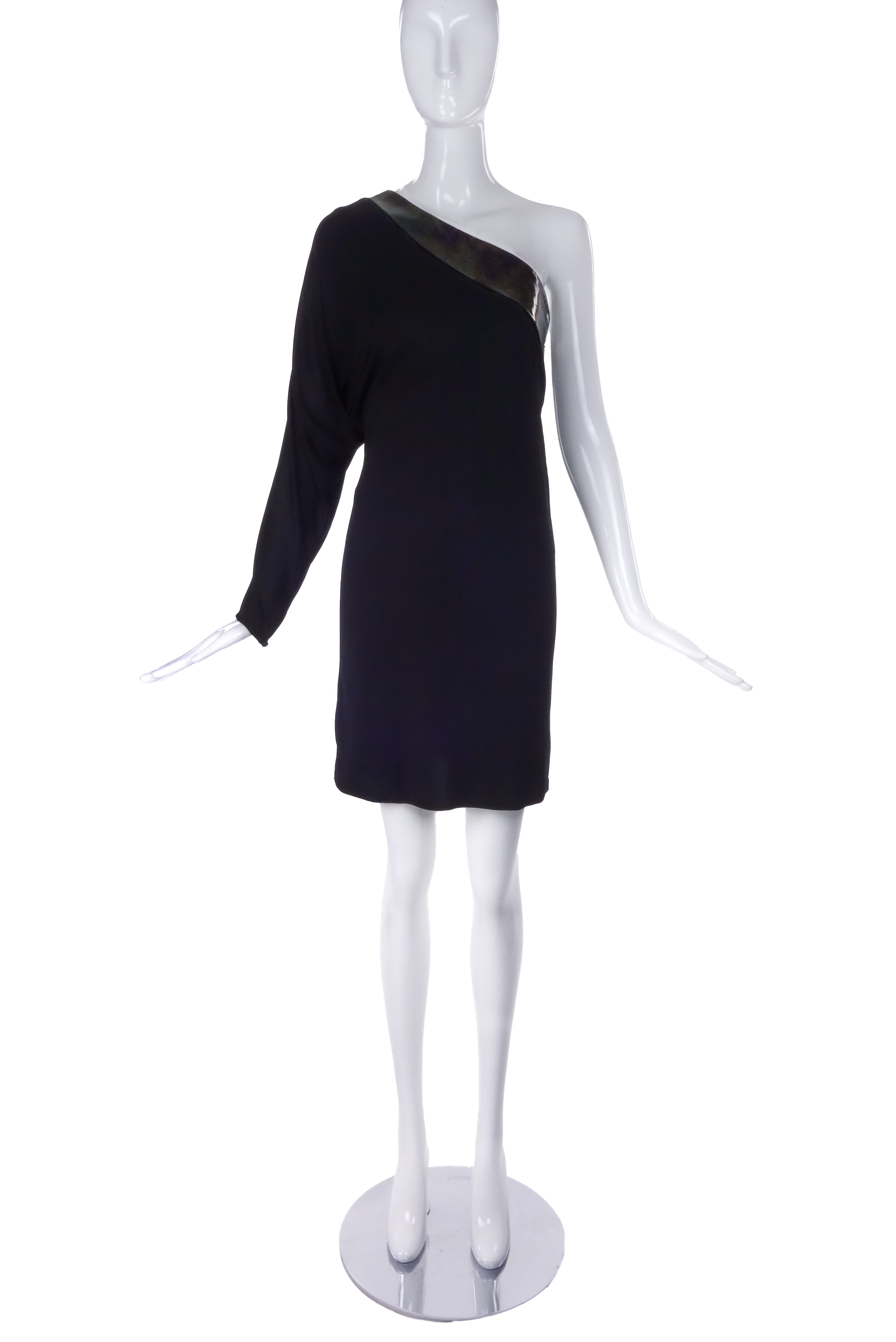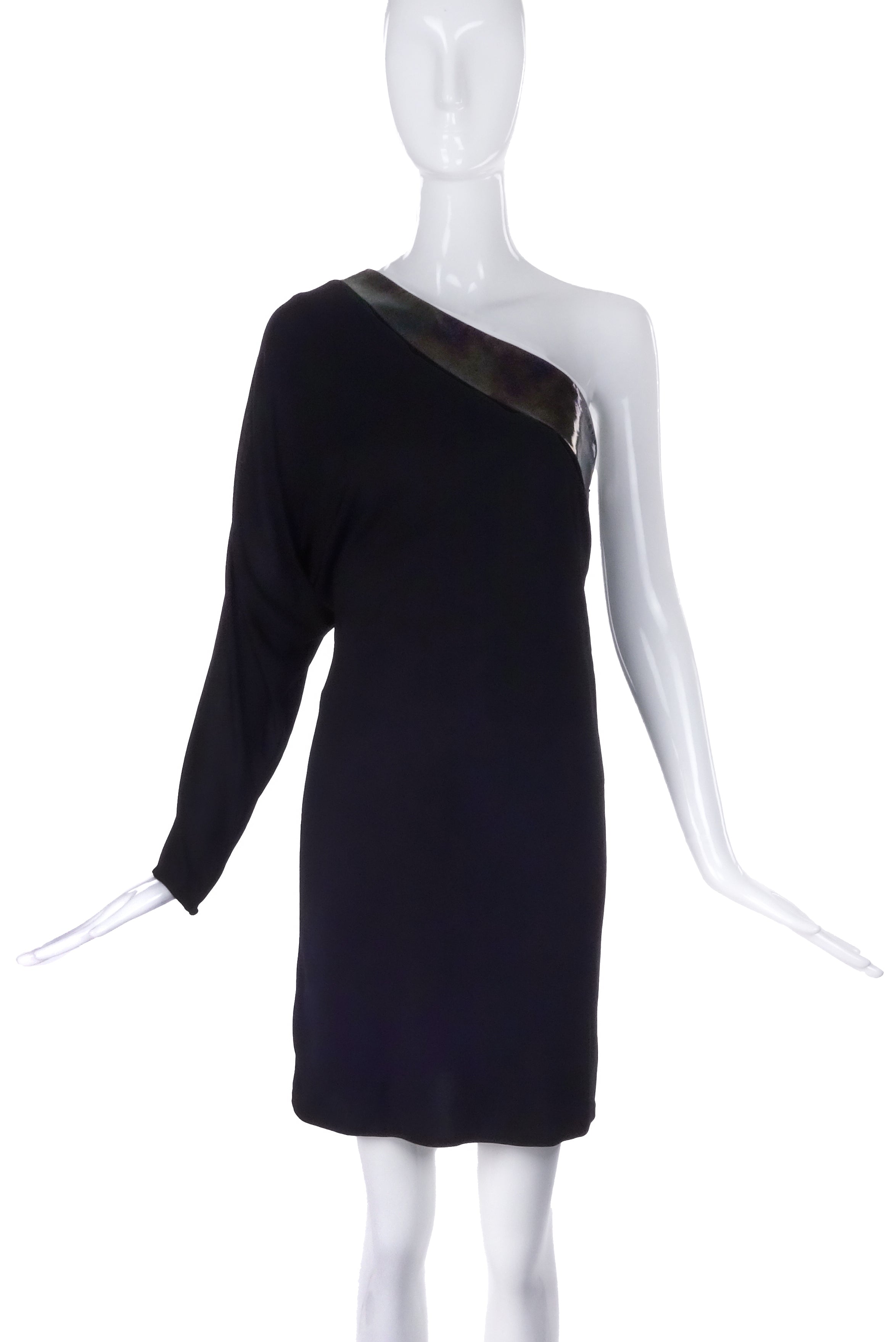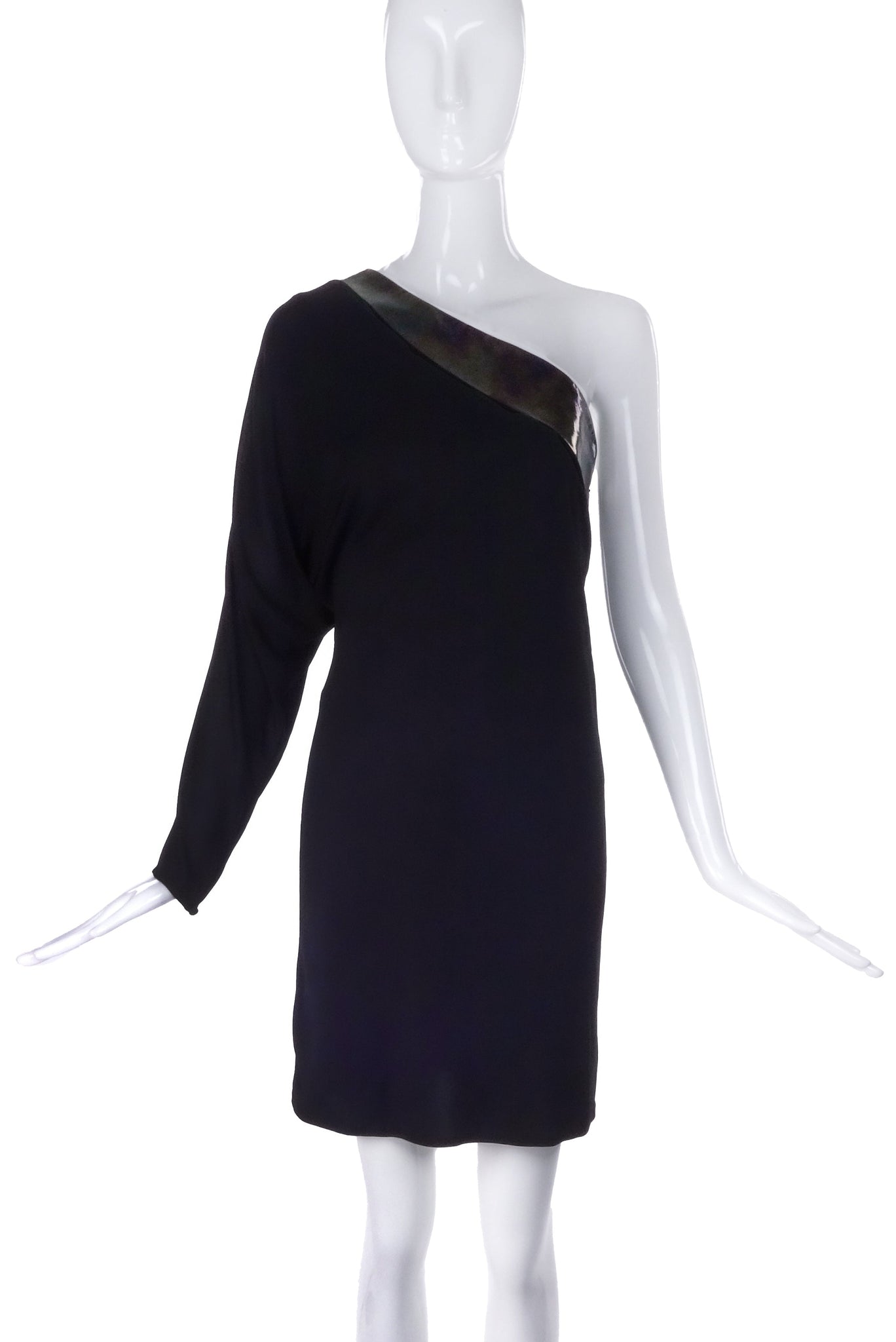 Black sexy Gucci one shoulder asymmetric dress from the Fall / Winter 2009 collection. The dress has a wide patent leather trim around the neckline.