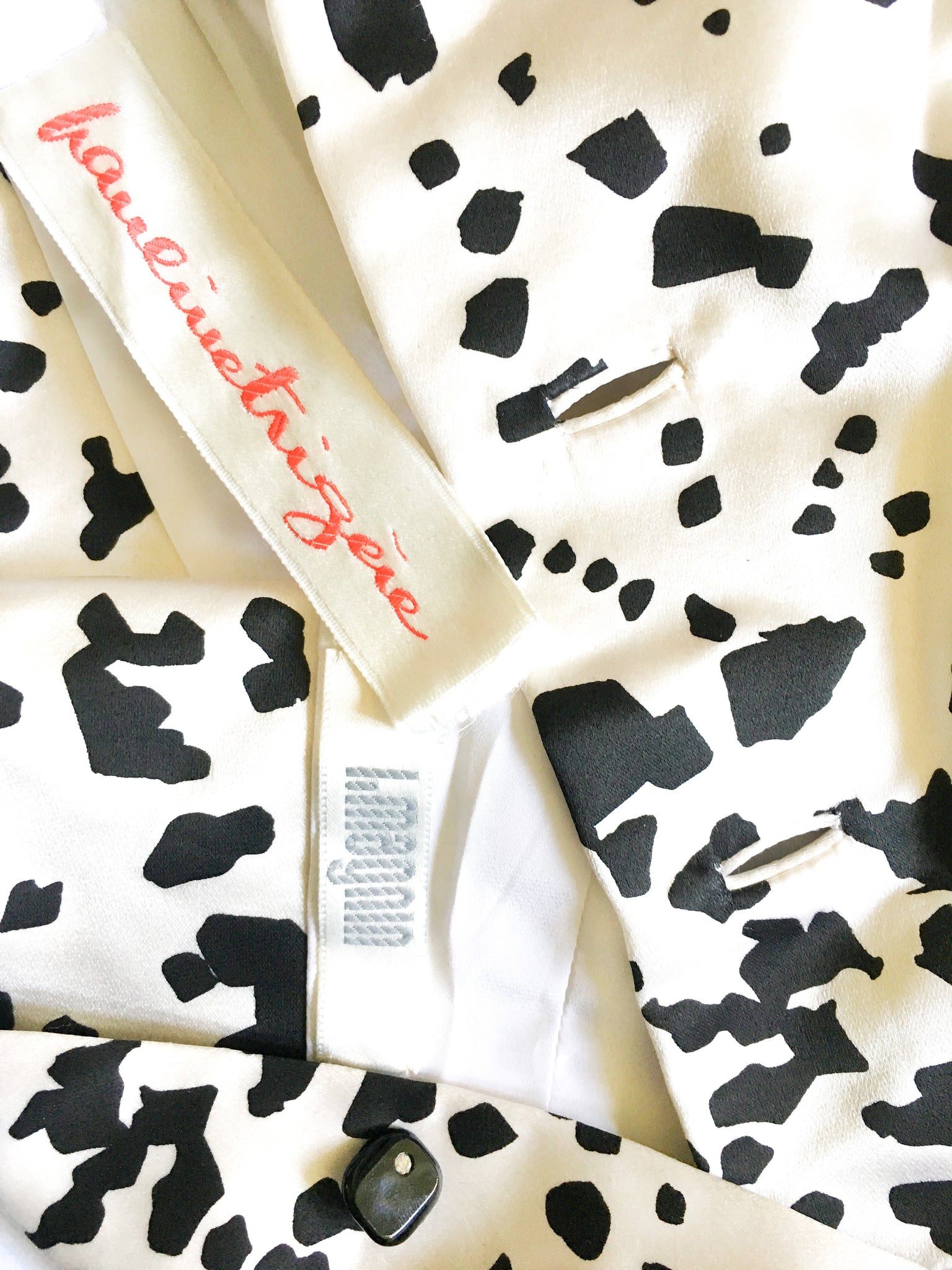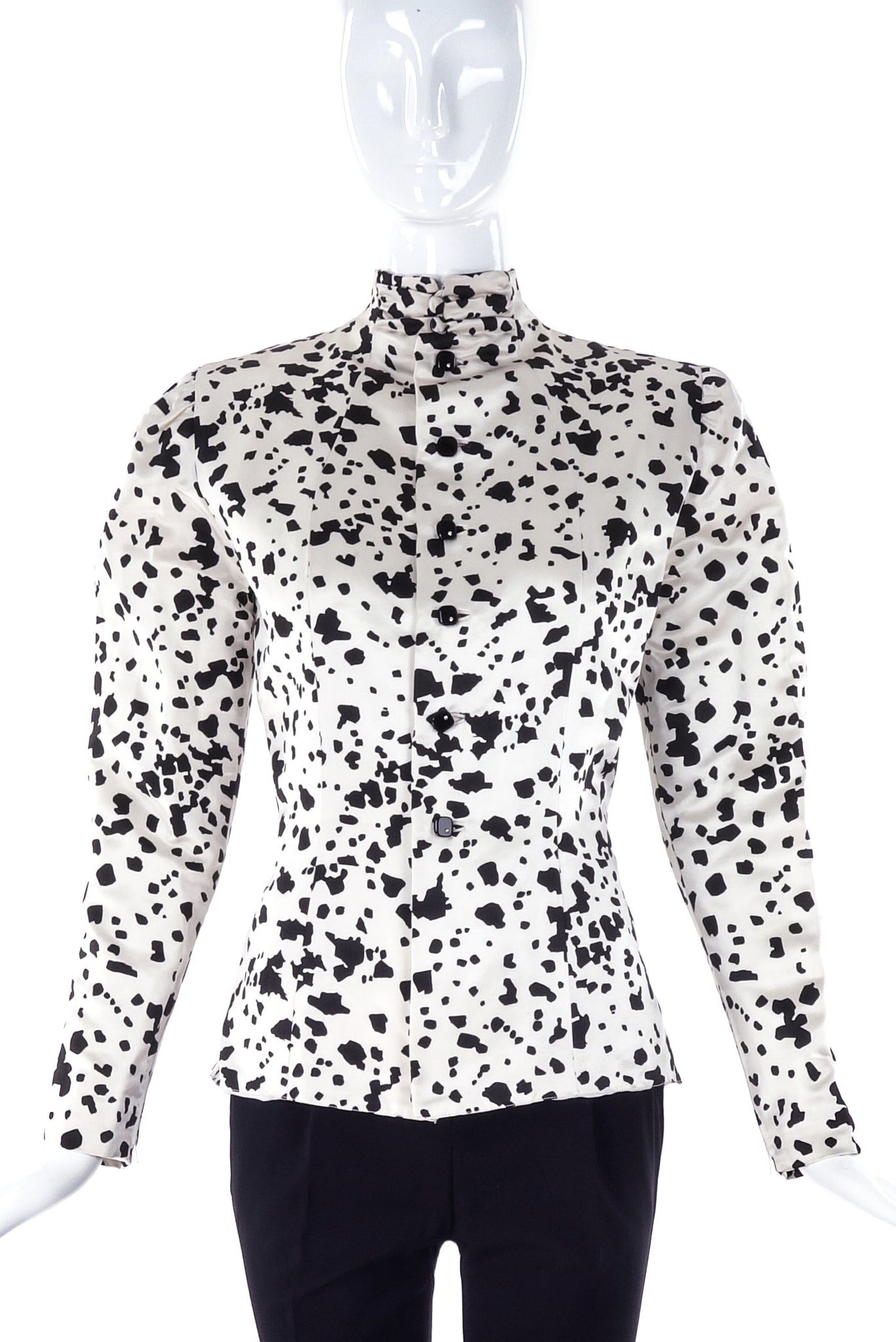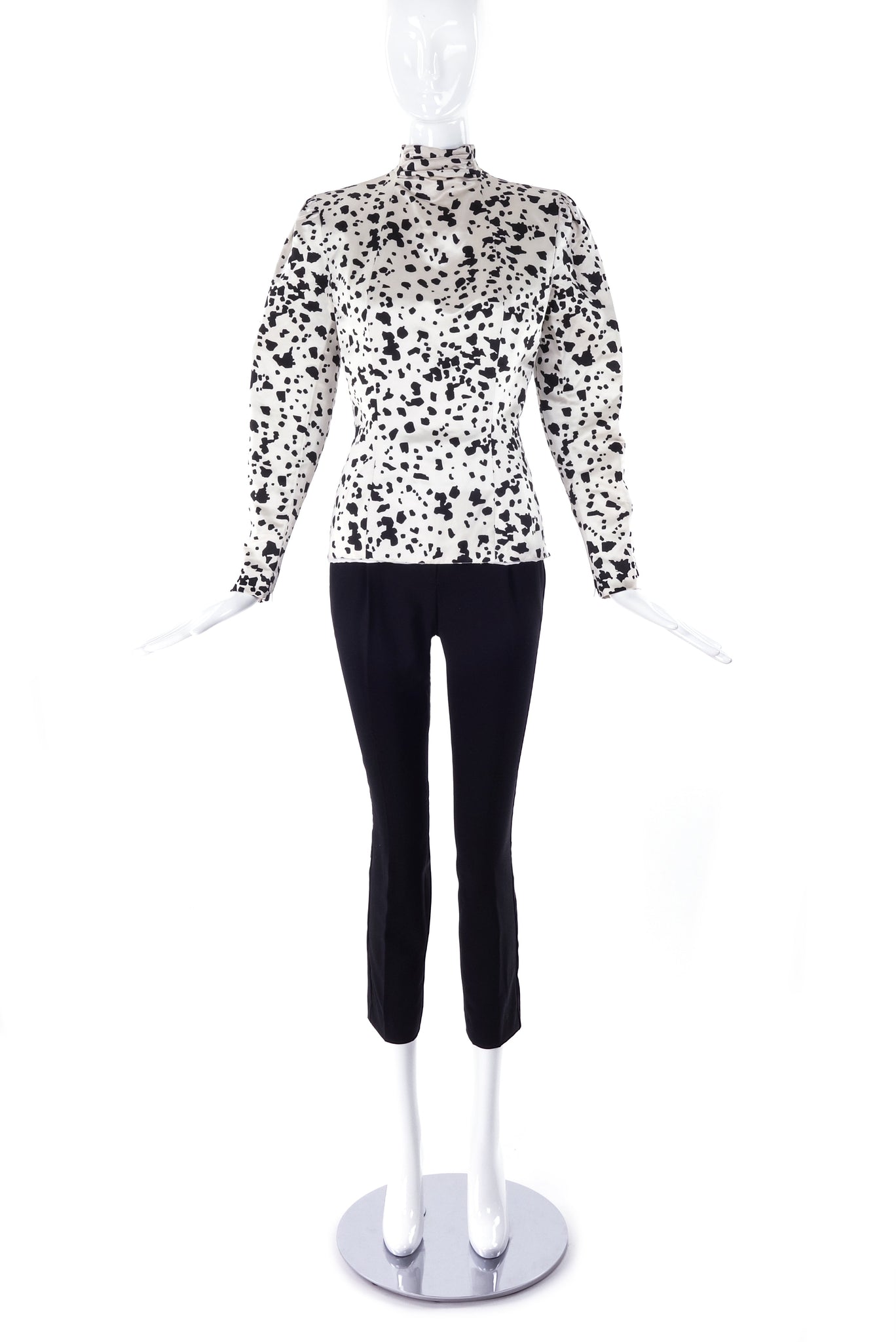A Pauline Trigère black and white satin fitted blouse with a mock neck and a exaggerated sleeve. The satin fabric has a dalmatian-like print to the blouse. The back of the blouse along the backside of the neck and the sleeves have invisible zippers.