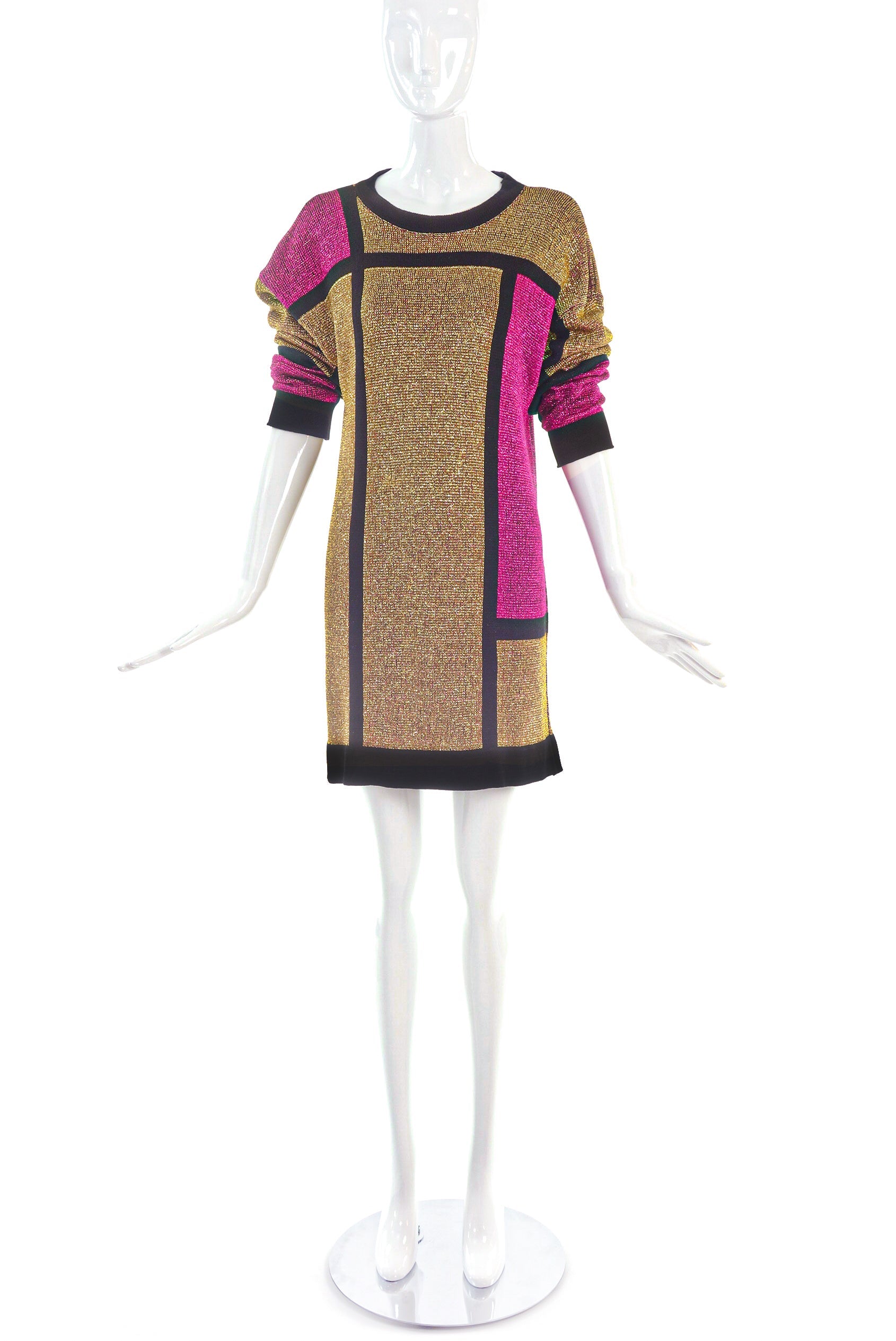 A vintage Pierre Cardin gold lurex knit sweater shift dress. The gold lurex dress has a geometric design created from black lines and hot pink squares to create a "Mondrian" effect. The dress has an open boat neckline and is long sleeved with ribbed details at the cuff.