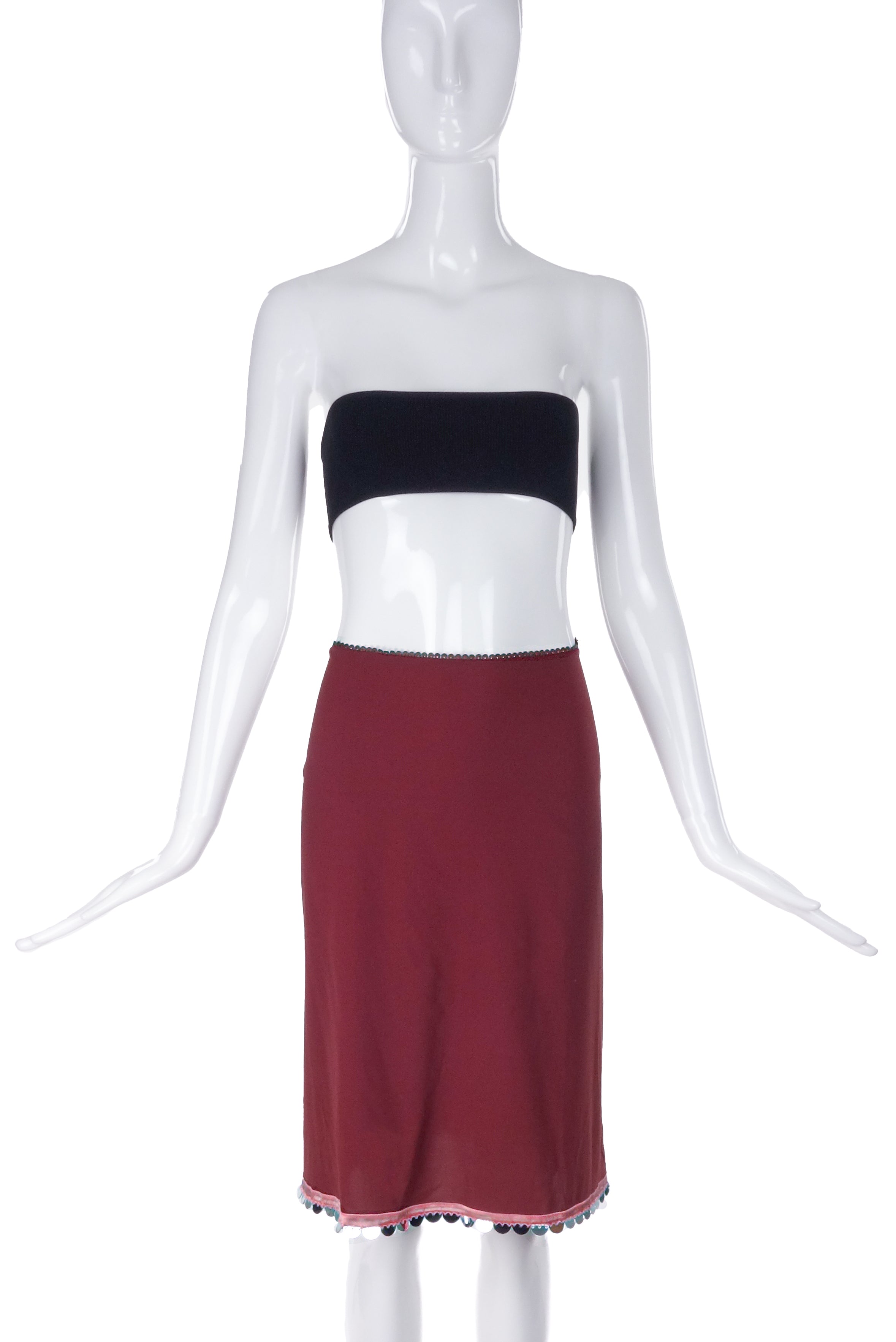 A vintage Prada burgundy knee-length skirt with a dazzling bohemian feeling silver mirror paillette detail along the pink ribbon trimmed hem.