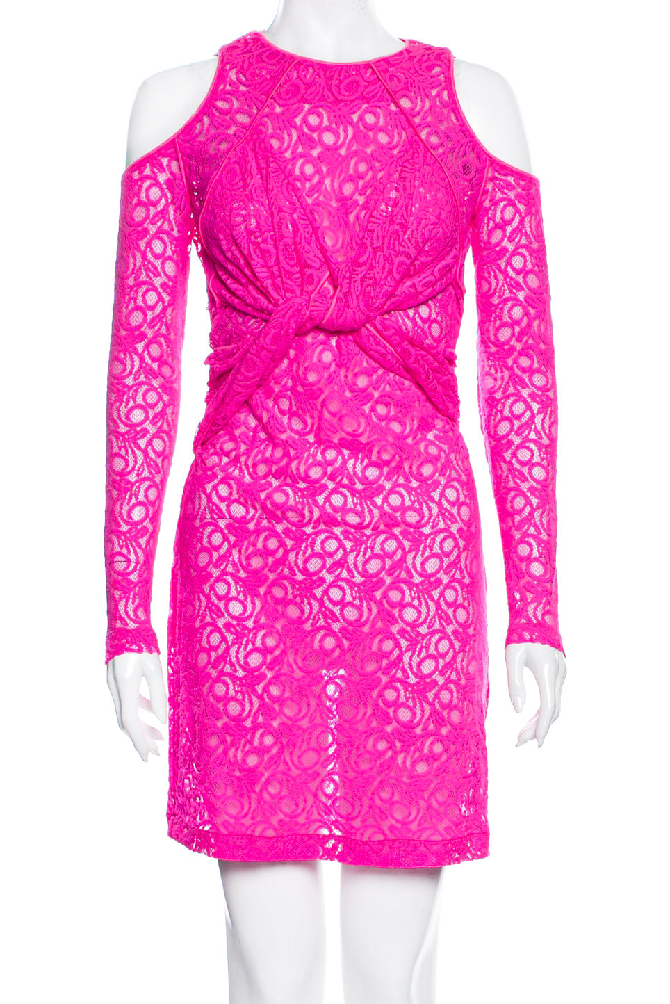 A Preen by Thornton Bregazzi bright hot pink lace mini dress with long sleeves with a "cold-shoulder" cut out detail. The body con style dress has a twist knot detail at the bust.