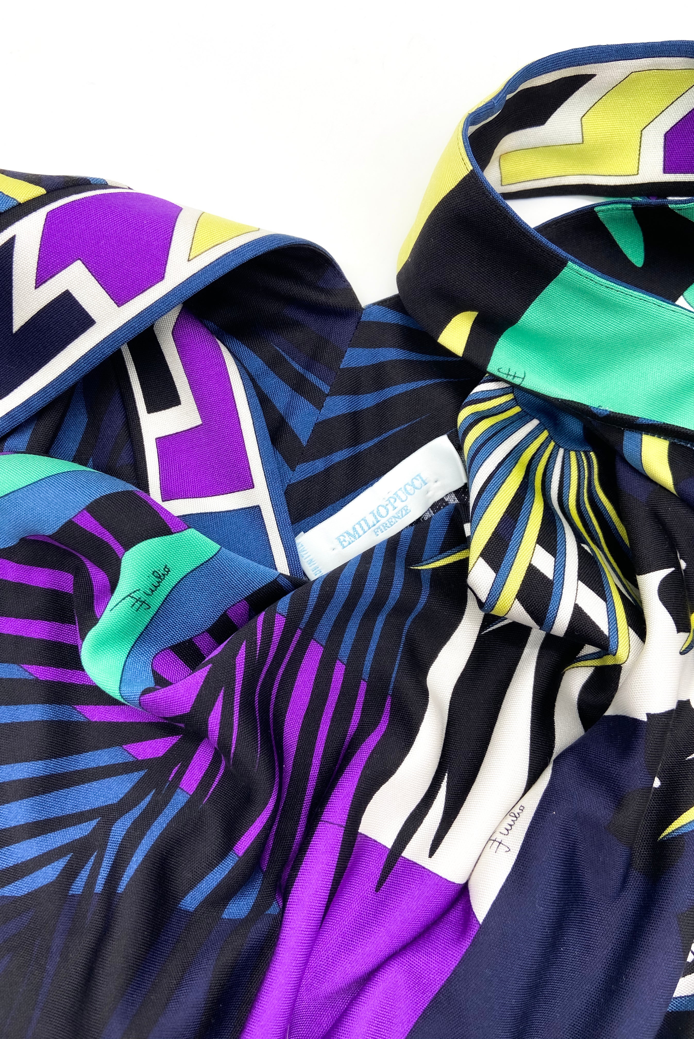 An vintage Emillio Pucci silk jersey empire waisted a-line dress with a v-neckline. The dress has a pattern of palm trees mixed with graphic abstract shapes in yellow, green, purple, pink, black and white color tones. The neckline and the empire waist have a triangular geometric pattern.