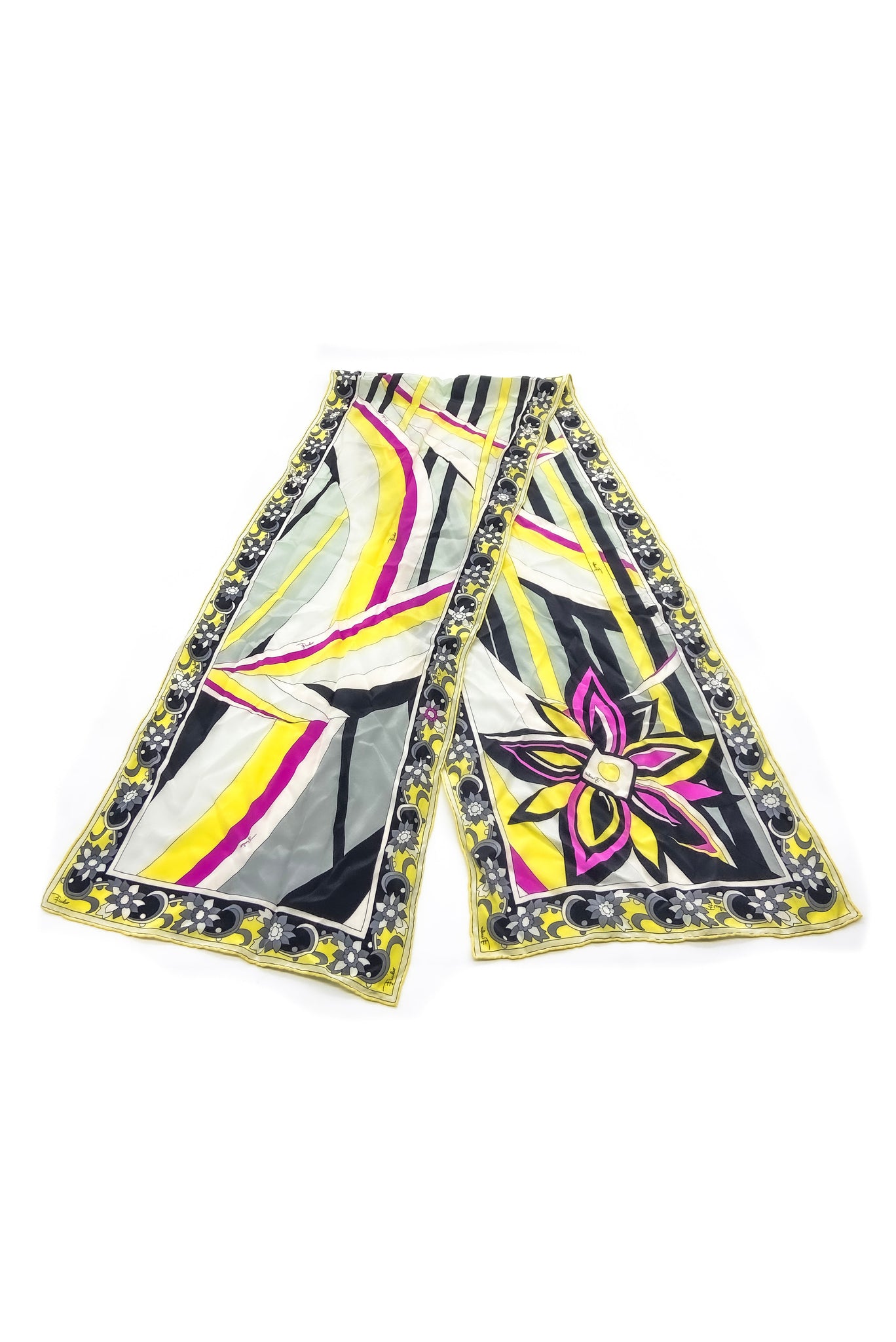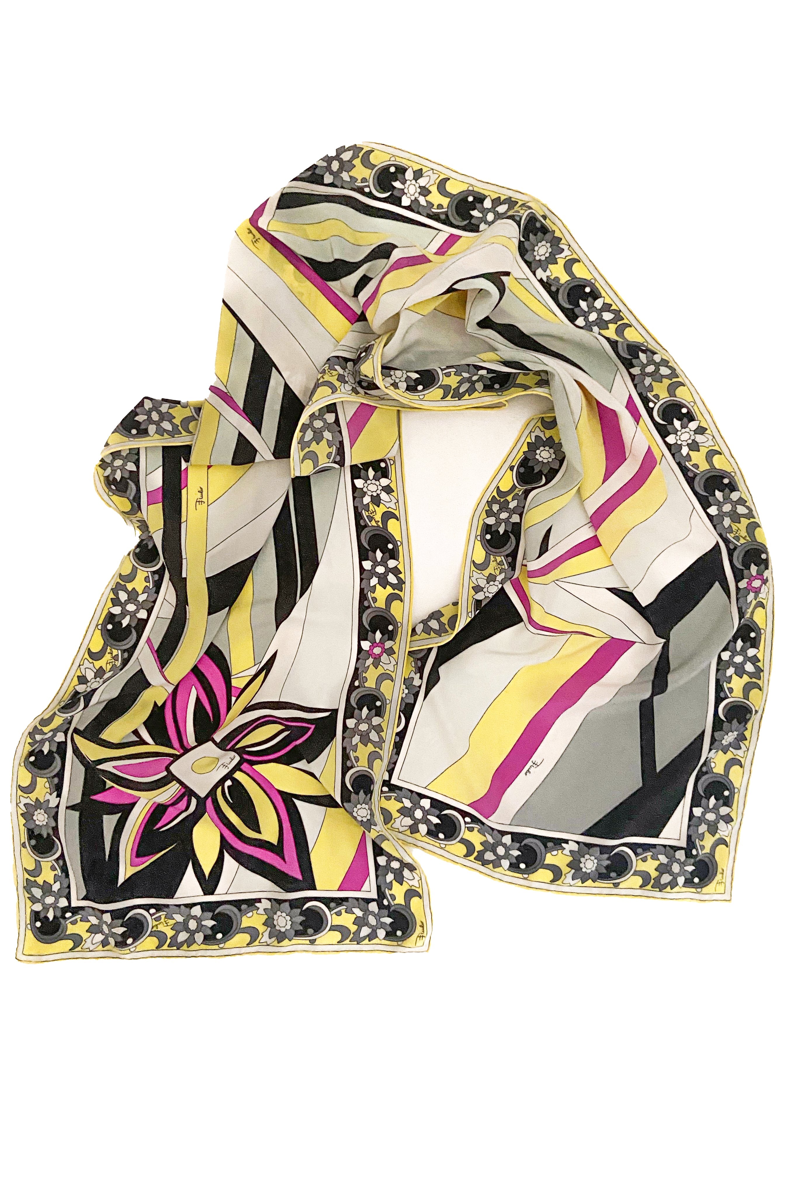 A Pucci elongated rectangular scarf with a classic geometric pattern created from yellow, pink, grey and black tones. The skinny style scarf has a geometric floral burst in one corner with a border using the floral motif in grey, black and yellow.