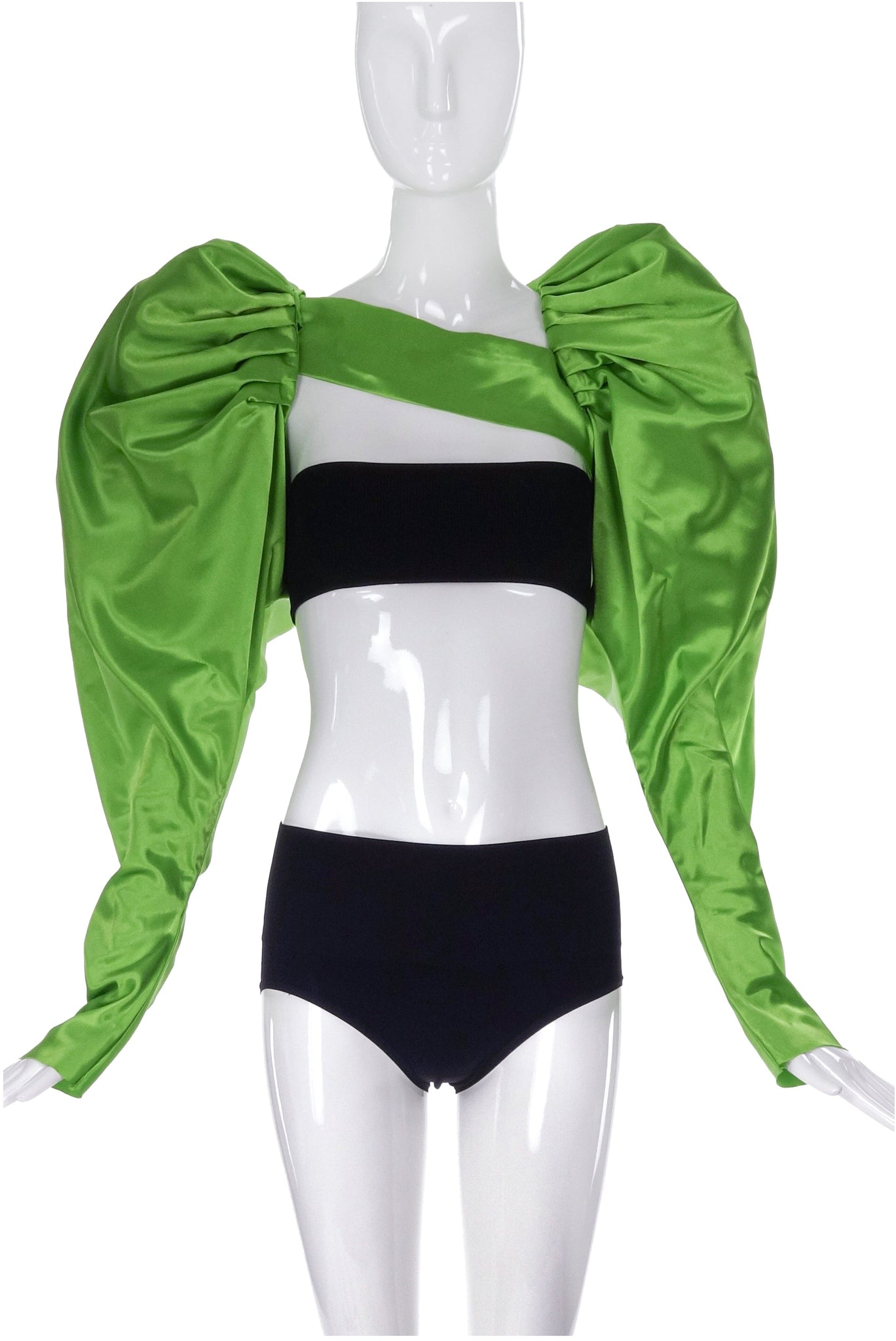 A set of satin oversized gigot or "leg of mutton" style sleeves. The sleeves have a satin band between to anchor the sleeves onto the body. We have a a vibrant red set seen pictured on the opening photo. Also available is a lime green set of sleeves.