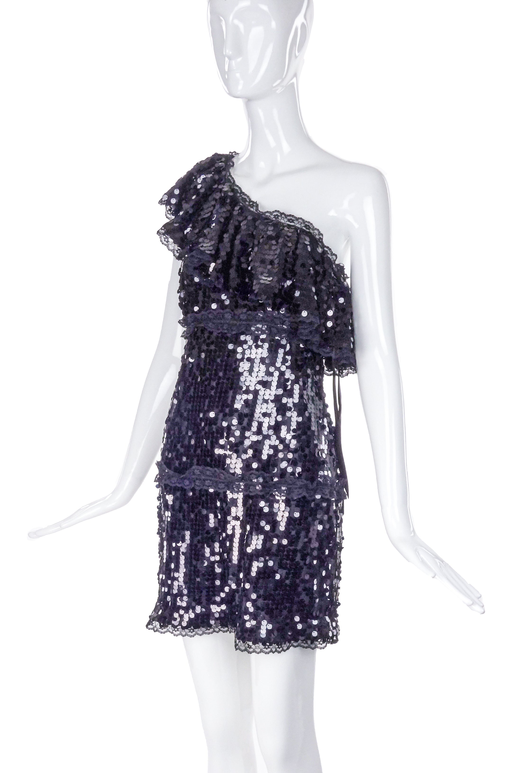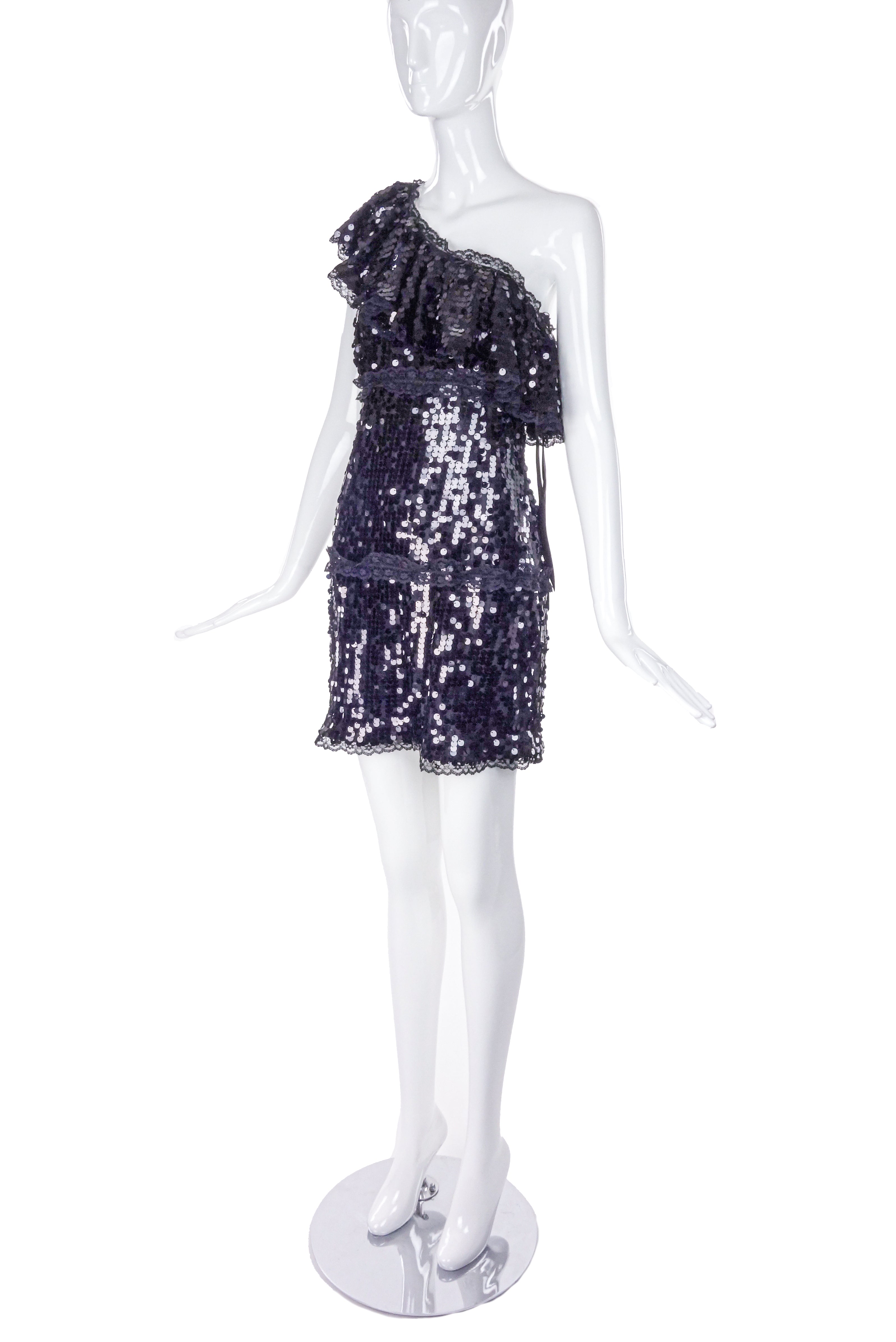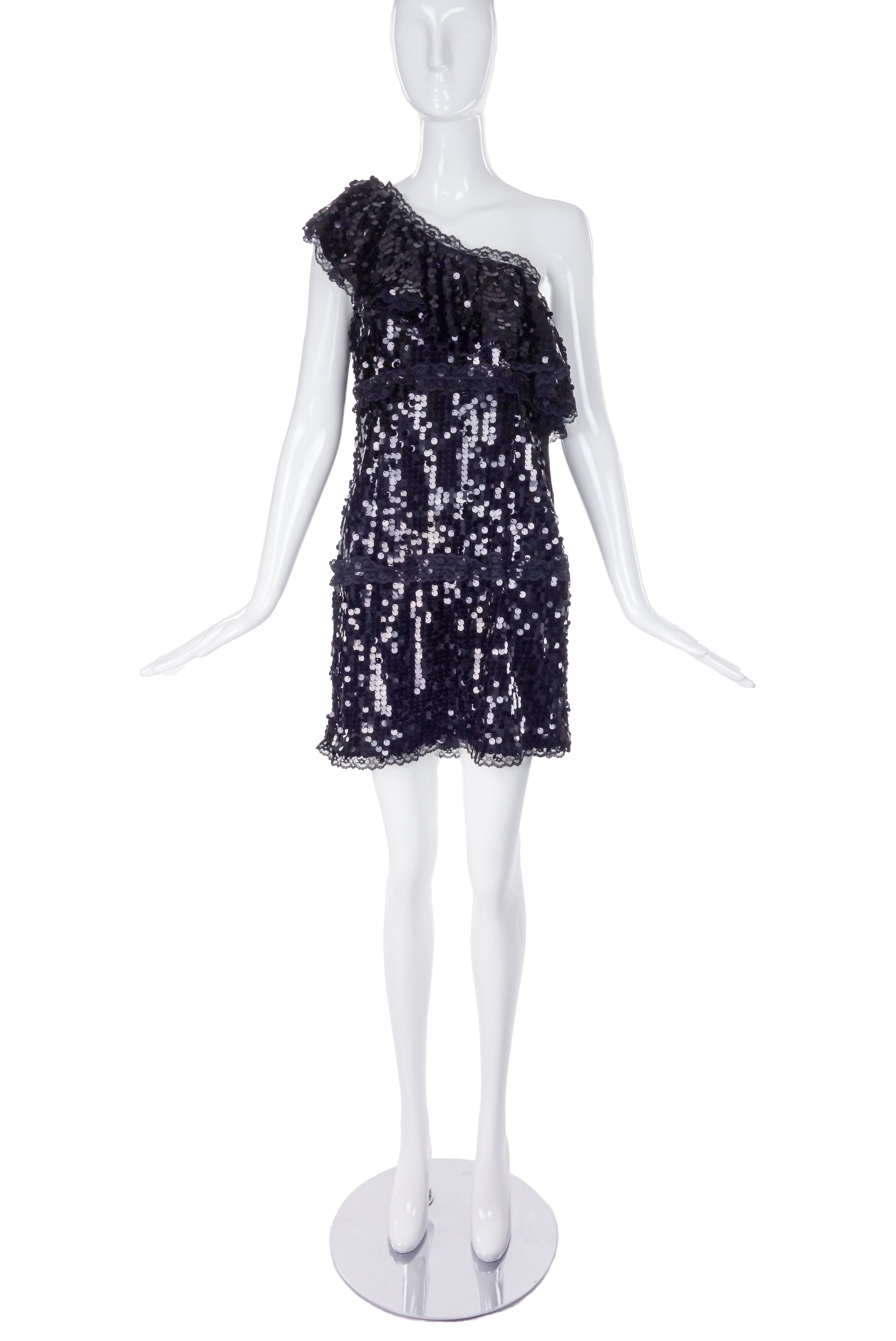 A Valentino Red black mini sequin paillette embellished one shoulder mini dress. The one shoulder has a ruffle detail along the neckline along with black lace detailing creating tiers in the dress and at the hem. The dress has a zipper down the side of the dress with a black satin ribbon tie detail on zipper.