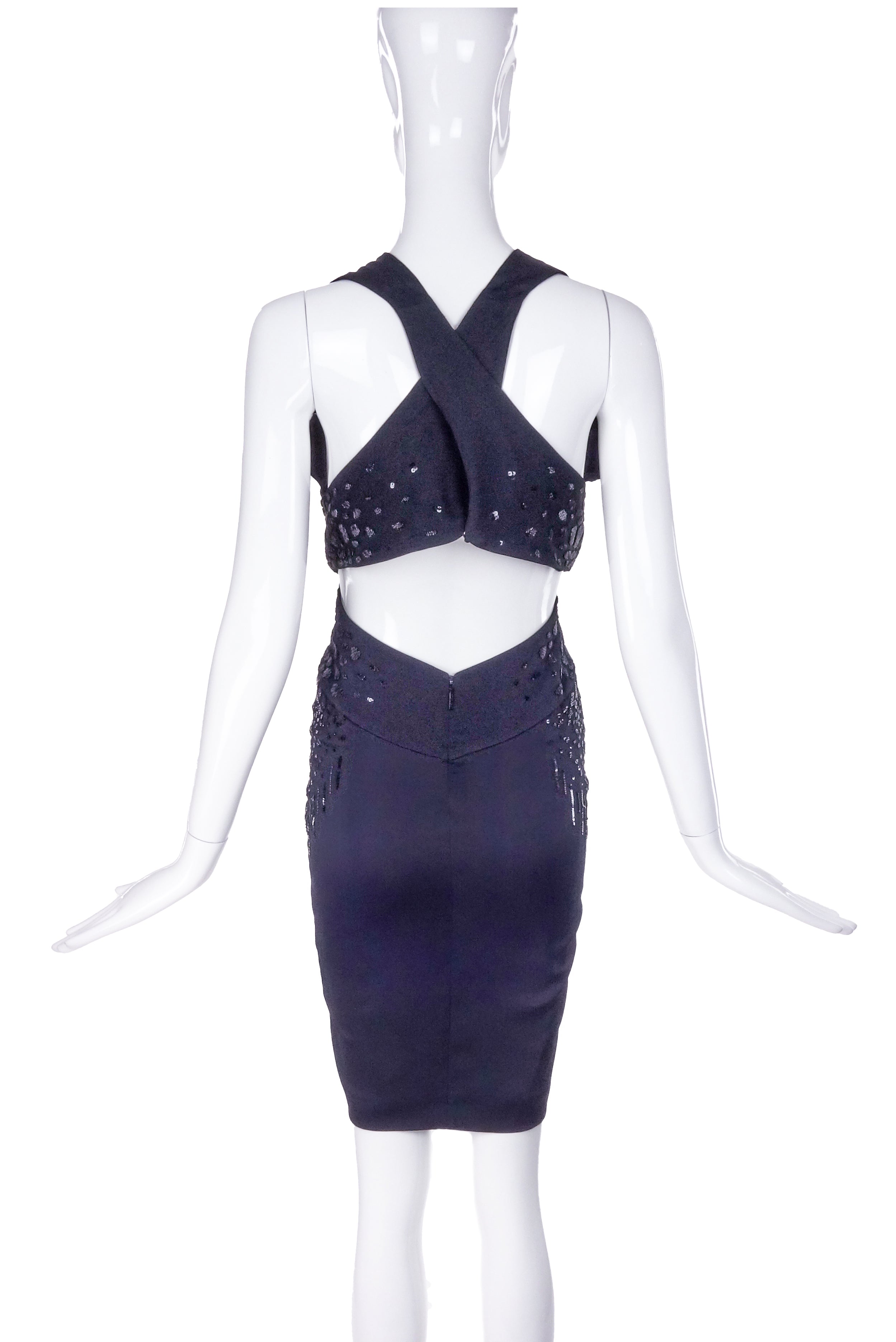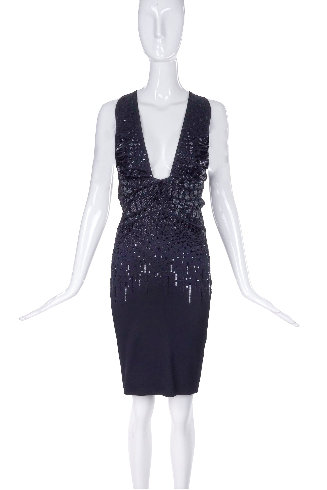 A Roberto Cavalli black fitted cocktail dress with a plunging V neckline and and open back with cross straps. The fitted sheath dress as intricate bead and sequin details throughout the bodice in an Crocodile like print which flows into the skirt of the dress and disperses over the hips. The back of the dress has a plunging back detail with an invisible zipper stamped Roberto Cavalli.