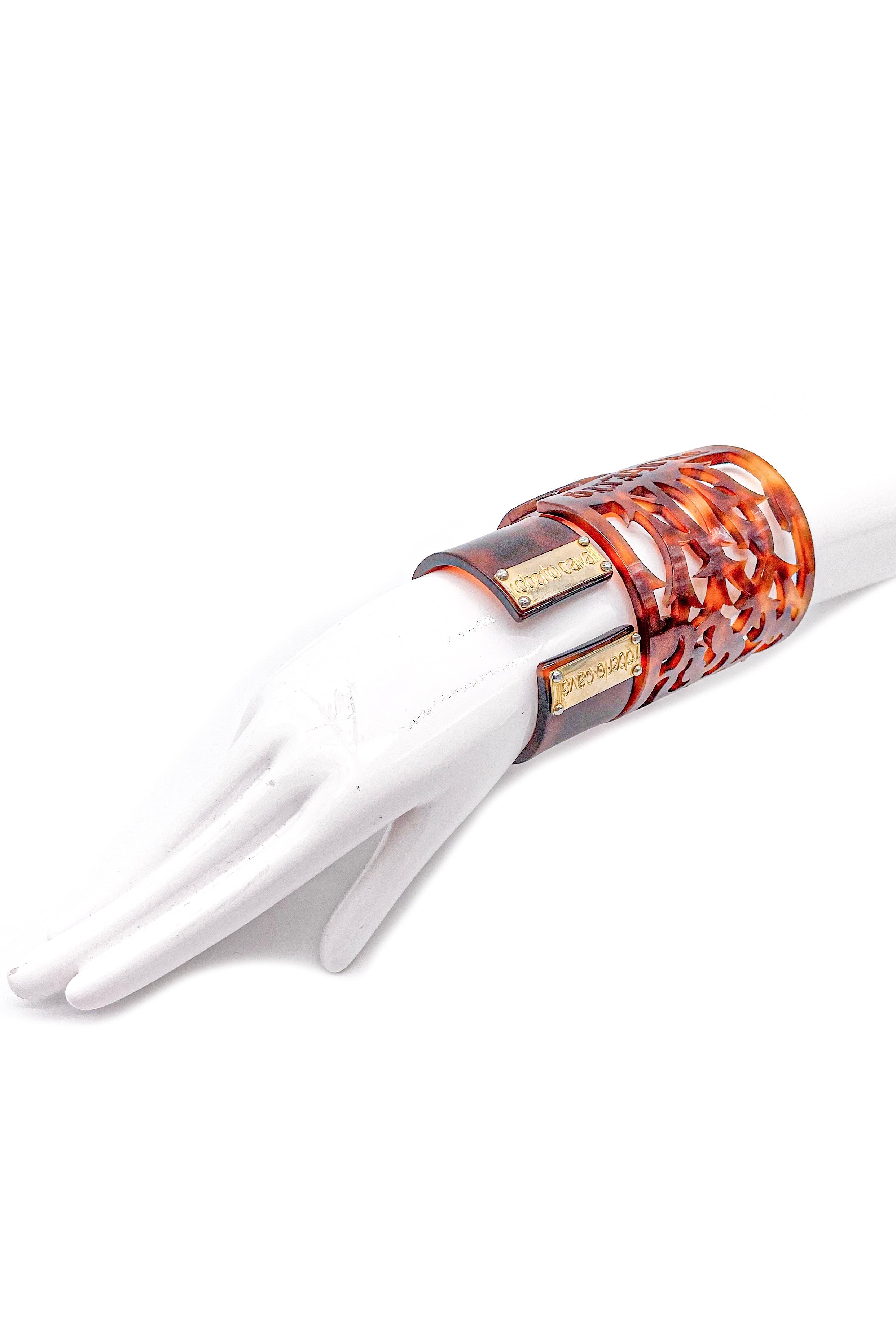 A trio of Roberto Cavalli multi-tone tortoise shell cuffs. One of the cuffs has a deeper dark tone to the pattern, one cuff has two gold tone plates stamped Roberto Cavalli on the ends of the cuff and the largest cuff has intricate stencil cut-out details throughout. The bracelets are from the Roberto Cavalli Spring / Summer 2003 collection.