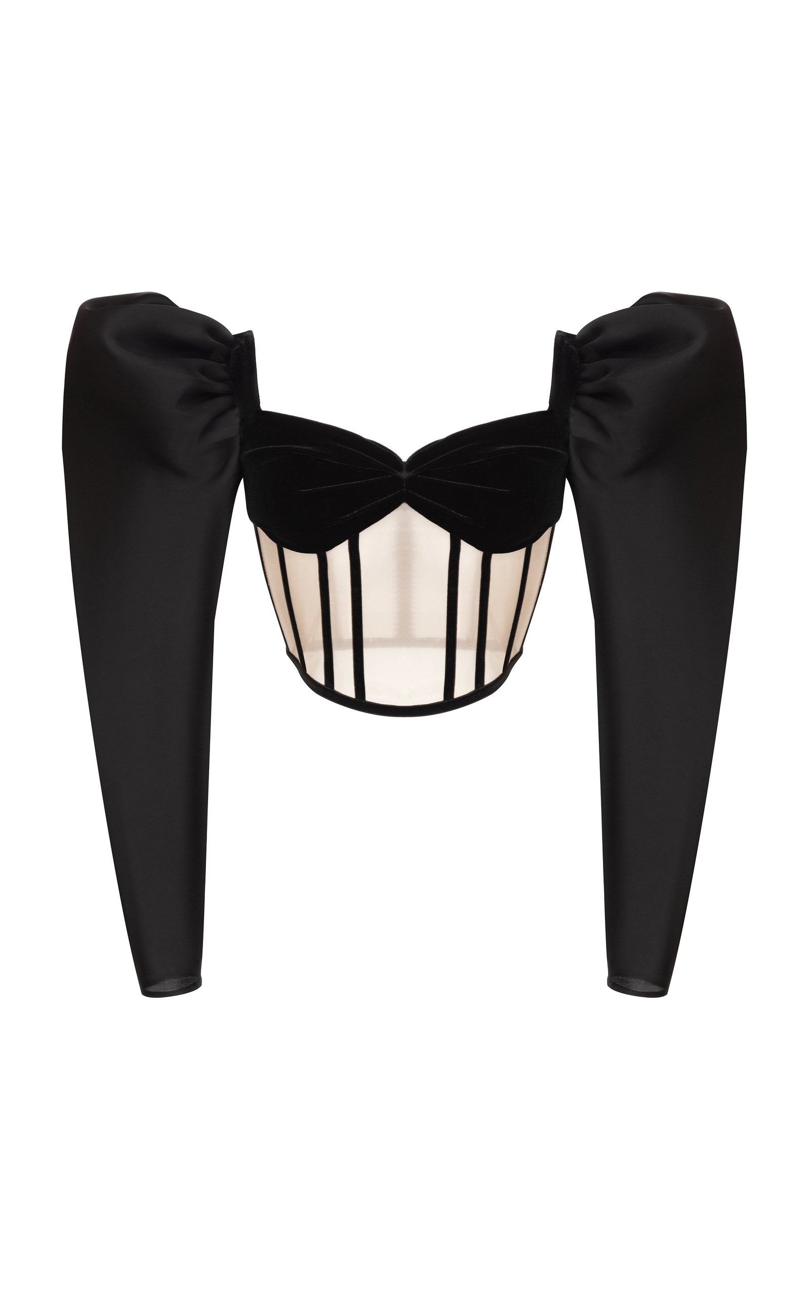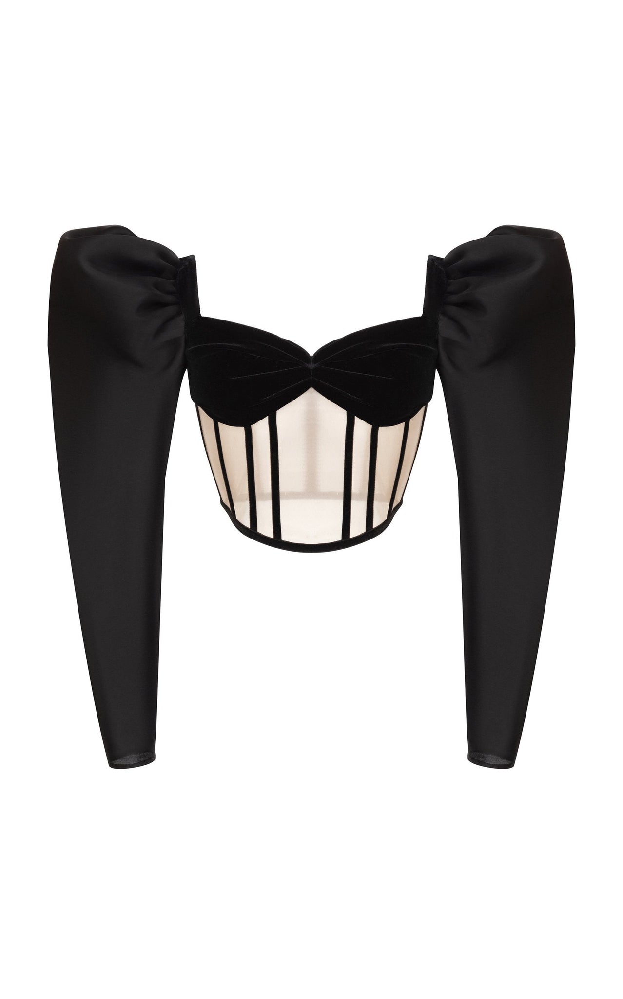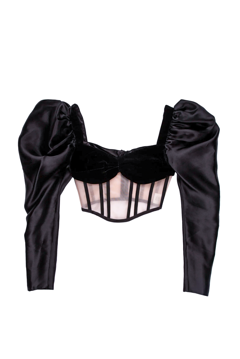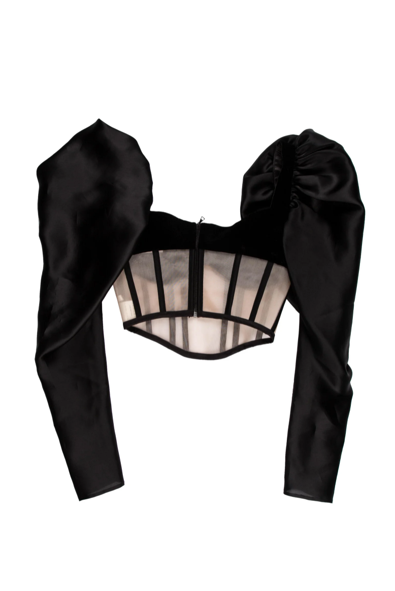 Rozie London Corset Black Sheer Nude Velvet and Taffeta Puff Sleeve Corset Top