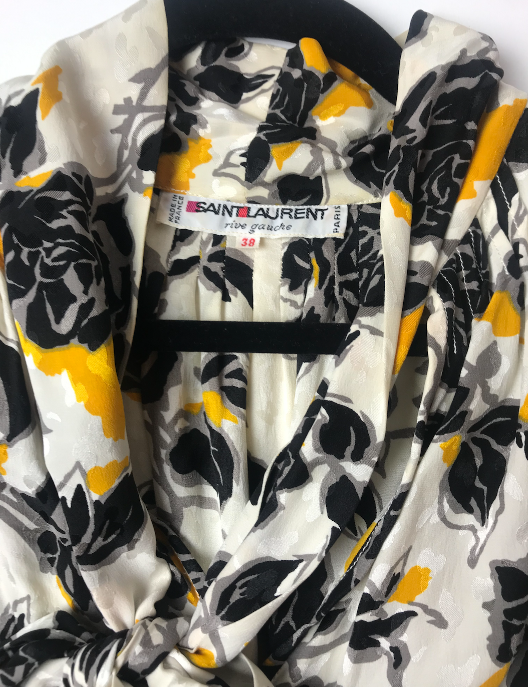 A vintage black and white and yellow flower print dress by Saint Laurent. The hip part is tight and top part more billowing like a blouse. Big sleeves with elastic at the wrists.