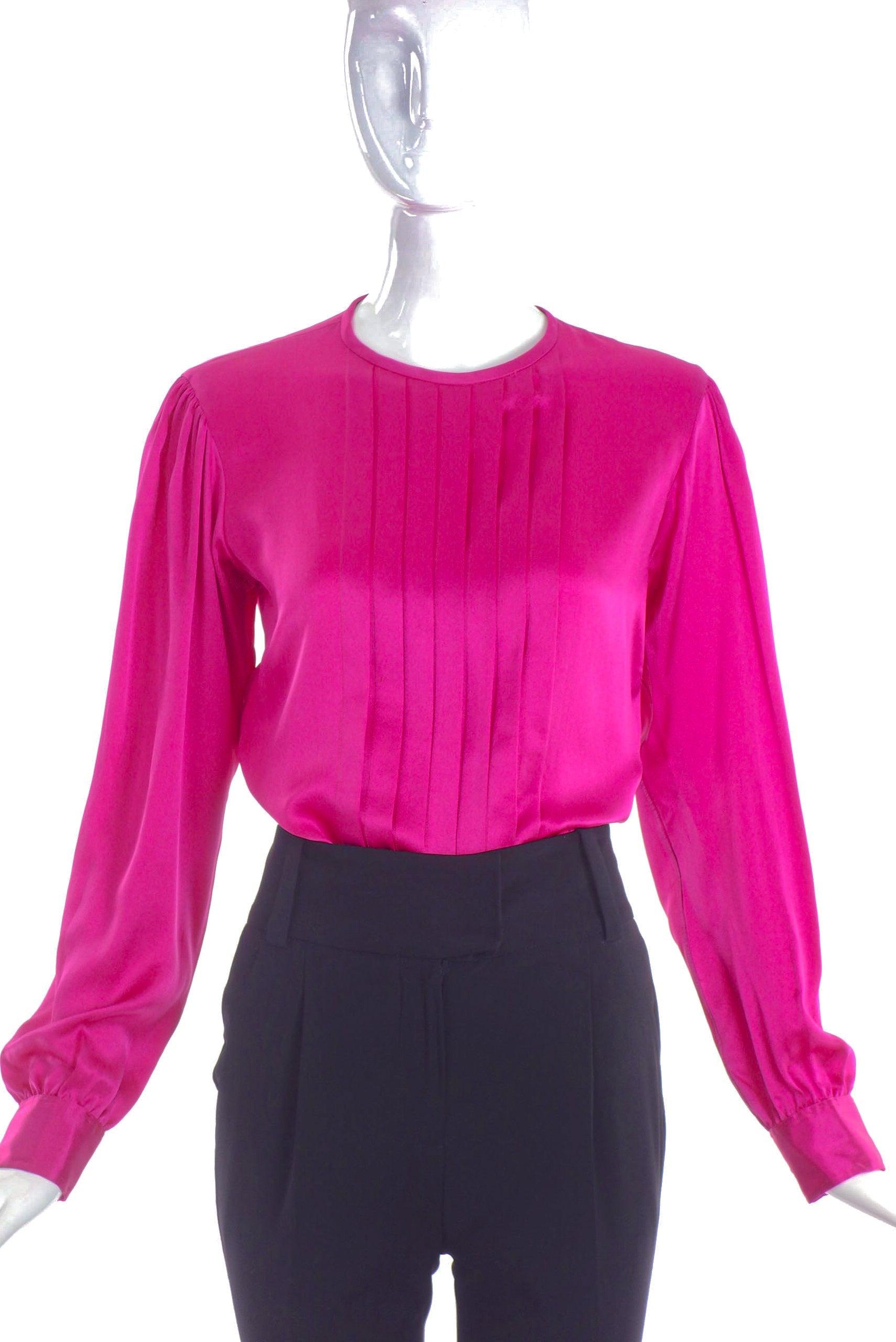 A Saint Laurent Rive Gauche vibrant fuchsia silk long sleeved top. The top has beautifully constructed box pleating details along the front from the neckline to the hem of the top. Sleeves have a slight blouson with a couture constructed shoulder. Cuffs of sleeve have a one button closure on each with a keyhole detail on the back of the shirt with a single button closure. Circa 1980's.