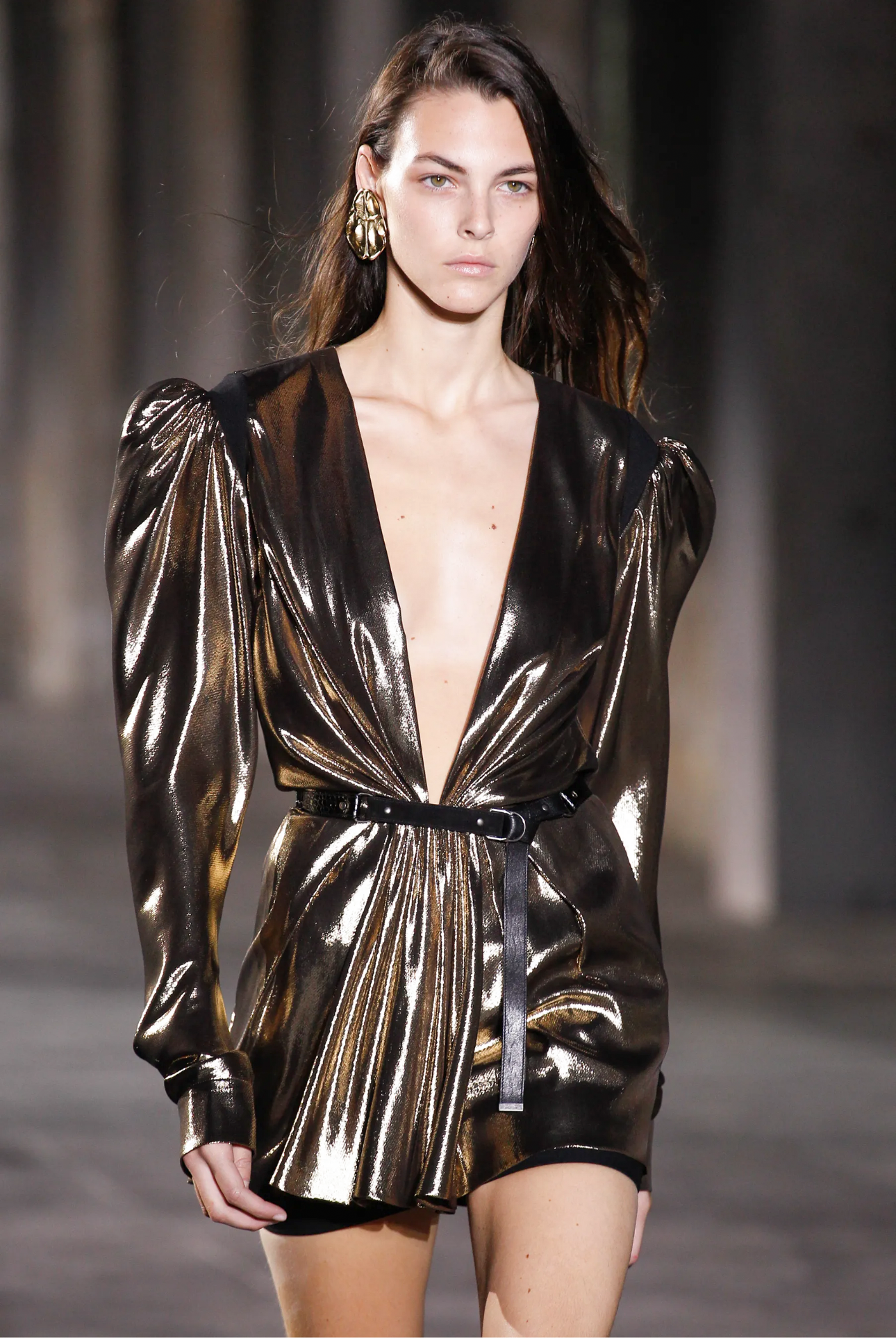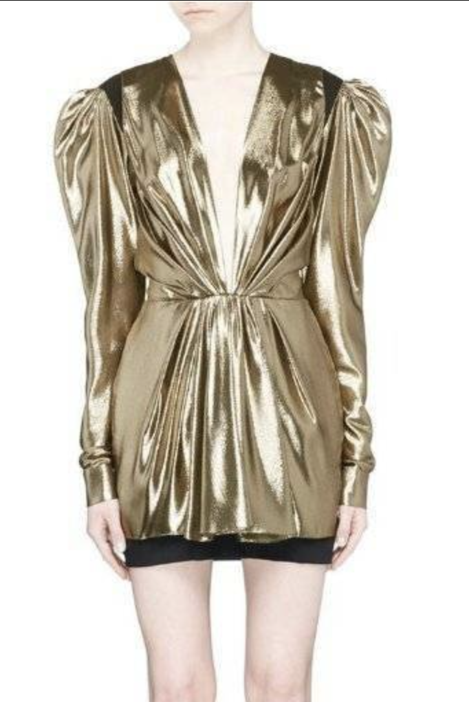 Saint Laurent Gold Deep V Neck Lame Extended Shoulder Dress Spring 2017