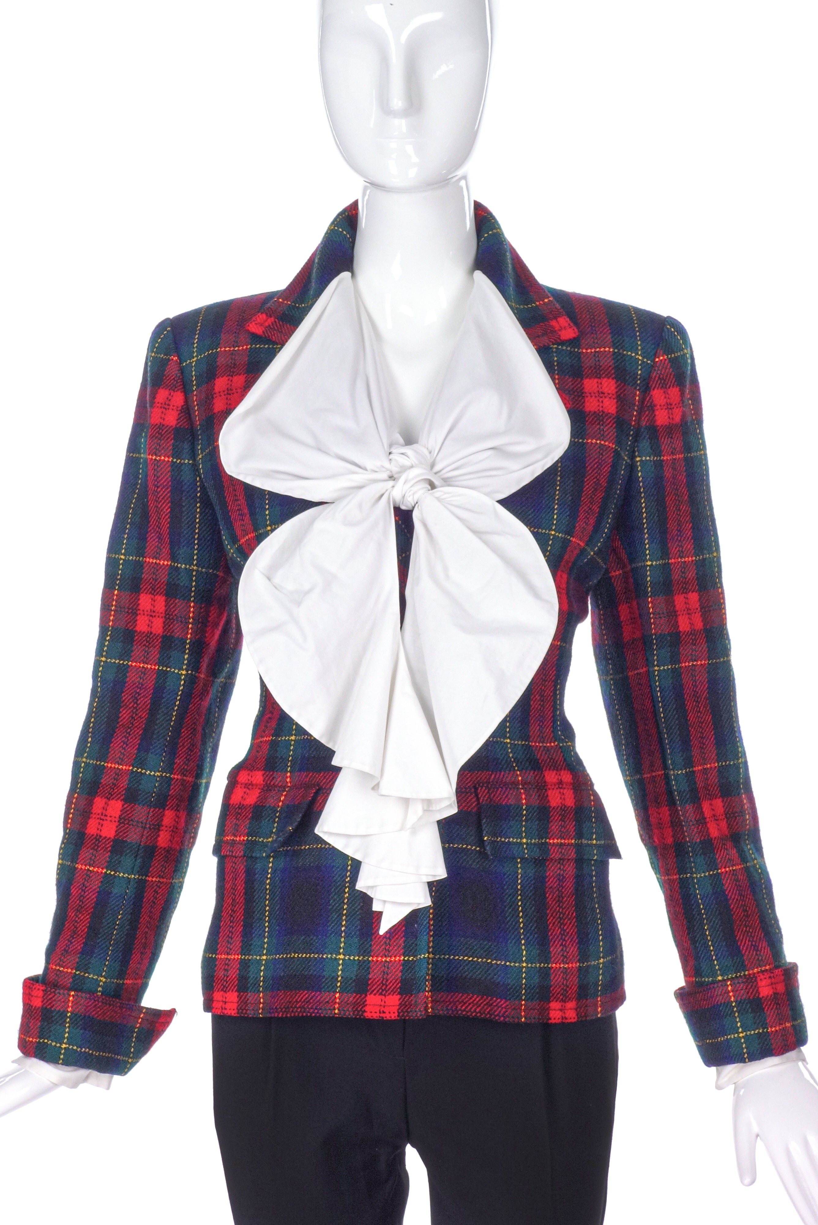 Vivienne Westwood White Ruffle Bow Front "Pirate" Blouse with a Saint Laurent Rive Gauche Tartan Fitted Jacket